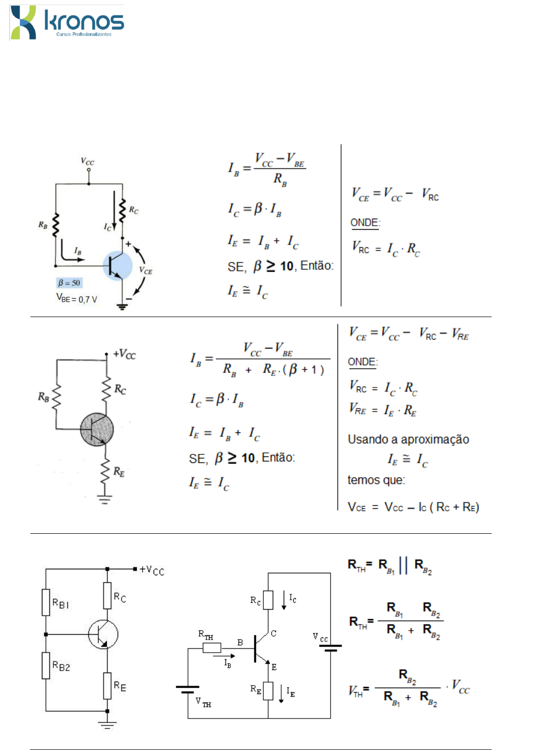 Professor: Pedro Disciplina: Eletrônica II Lista de Exercícios Transistor de Junção Bipolar RESUMO DAS POLARIZAÇÕES Polarização de Base Fixa Polarização de Emissor Estável Polarização Por Divisor de Tensão Circuito Equivalente de Thévinin OBS: Depois de feito o modelo equivalente de Thévenin, basta resolver um circuito de emissor estável, igual ao item anterior. Turma: _________ Data: _____/______/________ Nota: _________ Nome: _______________________________________________________________ 1. Determine a corrente da base, a corrente do coletor, a corrente do emissor e tensão na junção coletor-emissor (VCE), para os itens: a), b) e c). a) Respostas: b) Além do que foi pedido, determine também: a tensão da base VB, a tensão do coletor VC e a tensão do emissor VE. Respostas: = 32,55 ; = 2,93 mA; IE = 2,96 mA; = 8,09V; = 8,09V; = 0,7V; = 0V. Obs: o valor de IE é o exato, caso encontre o valor aproximado, também está correto! c) Além do que foi pedido, determine o valor da resistência RB. Considerar VCE = VCC / 2. Respostas: = 6 mA; = 30 ; = 376,6 k ; = 6,03 mA; Vce = 6 V. Obs: o valor de IE é o exato, caso encontre o valor aproximado, também está correto! 2. Determine a corrente da base, a corrente do coletor, a corrente do emissor e tensão na junção coletor-emissor (VCE). a) Dados: Vcc = 15V, RB = 500k Ω, RC = 1,8k Ω, RE = 1k Ω e beta = 100. Respostas: = 23.793 ; = 2.379 mA; = 8.337 V; IE = 2,402 mA Obs: o valor de IE é o exato, caso encontre o valor aproximado, também está correto! b) Dados: Vcc = 20V, RB = 420k Ω, RC = 2.1k Ω, RE = 1.7k Ω e beta = 85. Respostas: = 34,086 ; = 2,897 mA; IE = 2.931 mA = 8,99V; Obs: o valor de IE é o exato, caso encontre o valor aproximado, também está correto! c) Para o circuito a seguir, determine o que foi pedido. Respostas: (2,2 ) , = 2 mA (1,2 ) , = 25 uA (452 ) = 5,2V = 3,1V = 7.6V = 2.4V. 3. Encontrar o modelo equivalente de Thévenin dos circuitos, determinar a corrente da base, a corrente do coletor, a corrente do emissor e tensão na junção coletor- emissor (VCE). a) Dados: Vcc = 15V RB1 = 80k Ω RB2 = 6.2k Ω RC = 2,2k Ω RE = 1k Ω beta = 100 Respostas: RTH = VTH = IB = IC = IE = VCE = b) Dados: Vcc = 15V RB1 = 80k Ω RB2 = 6.2k Ω RC = 2,2k Ω RE = 1k Ω beta = 100 Respostas: RTH = VTH = IB = IC = IE = VCE = c) Dados: Vcc = 15V RB1 = 80k Ω RB2 = 6.2k Ω RC = 2,2k Ω RE = 1k Ω beta = 100 Respostas: RTH = VTH = IB = IC = IE = VCE = EXERCÍCIOS COMPLEMENTARES 1- Na figura 1, calcular o valor do ganho do transistor de silício β. Dados: VCC=15V; RB=10kΩ; RC=15Ω; RE=5Ω; VCE=5V 2- Qual o valor do resistor de polarização de base RB (Figura 1) para que se tenha um ganho de β =200. Dados: VCC=10V; RC=15Ω; RE=5Ω; VCE=5V. Obs.: Para as questões 3, 4 e 5 acompanhar a apostila páginas 17 a 20. 3- Qual o valor do RB1 (Figura 2) sabendo-se que o transistor é de silício. Dados: VCC=10V; IC=100mA; β =200; VRe=2V ; RB2= 1kΩ 4- No circuito da figura 2 sabendo-se que o transistor é de silício, VRB1=VRB2=VCC/2=10V e Ic=100mA calcular o valor do resistor RE. 5- Qual o valor do VCE (figura 2) se: VCC=20V; RC=50Ω; RE=5Ω IB=100uA, β =100 6- Para o circuito a seguir, encontrar IB, IC, VRC, VRB, VCE, VB, VC, VE.