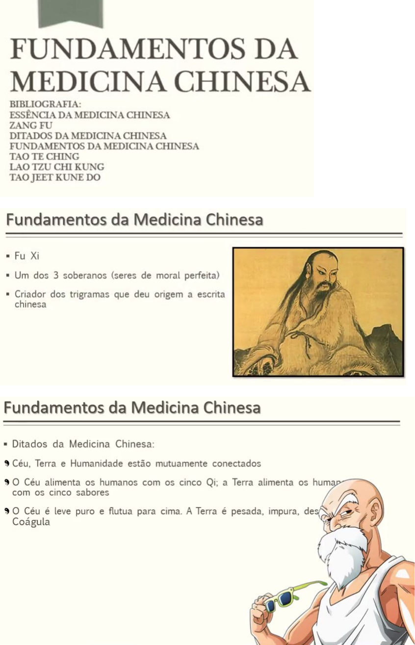 Os cincos fatores que vem do ceu secura, frio, calor, vento, umidade fazem o equilíbrio da terra Os cincos sabores que vem da terra ajuda o Homem Ex.: o Coração tem um aspecto Yang “subir” ,o sabor amargo ele descende O YIN e o YANG eles trabalham em conjunto – como um rio que evapora virando nuvem, depois condensa e faz a chuva que volta ao RIO. EXPLICAÇÃO : do mesmo modo como você não pode acelerar o processo de germinação de uma semente quebrando ela, o TAO e o centro para o Inicio do YIN e YANG, tudo tem um tempo certo, ontem eu era um , hoje eu sou outro e amanha eu posso diferente, as coisas estão em MUTAÇÃO ... não podemos se apegar as coisas – um exemplo disso é o pulmão que sempre a proveita a respiração, não prende ela. 10mil em chinês significa Infinito. ASSIM a constante não ASPIRAÇão é contemplar a s maravilhas... está se referindo a intenção do BAÇO - PARAR DE ANALIZAR AS COISAS e deixar acontecer isso permite um olhar diferenciado POR CONTRA ponto e a constante aspiração o contemplar o Orifício. AMBOS SÂO distintos nos nomes mas tem a mesma origem Nome YIN e YANG – a origem e do tão - o tao é a origem de tudo e do nada. UNIDADE YIN e YANG Por o Ceú ser Yang e A terra ser YIN - os dos se prendem então numa deficiência de Yin, o Yin não consegue prender o Yang que sobe e Numa deficiência de Yang o Yang não consegue segurar o YIN UM está complementando o outro , e ambos não consegue se separar.. . Tem um Ditado que quando um se desprende, é que houve a Morte. OPOSICAO YIN E YANG uma pessoa começou a olhar Uma montanha , e um dos lados pegava sol ele jogou o Yin e o yang dentro dessa Observação Yin Yang Noite Lua Estrela Frio MAterial Nutrição Recuo Ancorar XUE Manhã Sol lua calor Inmaterial Transformação ( exemplo foto síntese) atividade ( maioria dos animais sai para caçar) Movimento QI INTERDEPENDENCIA Um depende do outro .. o Yang gera movimento ao que é YIN (sangue) o sangue ancora o Shen -- 25 ciclos externo e 25 internos – totalizando 50Ciclos no total de 24 Horas -- 1.440 min – 28,8 minutos cada Ciclo CHEGANDO a noite a WEI QI se interioriza para dentro buscando mais nutriente para proteger o seu corpo. ( por isso a noite sentimos mais FRIO ) AUMENTO E DIMINUIÇÃO Face amarelada ou pálida – pq não tem circulação de sangue Direito Vertigem – Com XUE em deficiência o QI “AR” fica com Vento que sobe com força por ser Yang ai te dar uma Vertigem FORMAS DE gerar vento interno (AVC) Deficiência de Yin ou XUE Hiperatividade do Yang do Fígado Ascenção do fogo do Fígado Pulso Fraco e pq e deficiência Língua seca pq o Yang seca os Fluidos palida pq não tem circulação QUANDO A doença afeta a polaridade tem alteração de calor ou Frio. Doenças em substrato não tem essa alteração. Deficiência de Yin gera mais calor, Transpiração a noite. Como a Wei Qi que Protege o corpo, com uma deficiência você fica com aversão ao vento fica com gripe frequentemente... sem vontade de falar : exemplo : trabalhou o dia inteiro, desgastou o seu QI, a noite não tem interesse em conversa, apensa dormi ... Porem é em constante. A língua é pálida – em sangue porem não tem quem leva Mudança de temperatura corporal Ausência de sede : pela simples questão de não ter queima de liquido, normalmente os líquidos ficam localizado em alguma parte do corpo, como forma de edema, inchaço ou etc ... (sobrando líquido) Aversão ao frio : piora no frio Não Reclama de nada.. não muda nada... ( não tem aquela trasformcao que é do YANG) Figado Harmoniza o Fluxo de QI (caminhoneiro) Jing cria o Qi o QI cria o Shen O Shen Controla o Qi o Qi controla Jing 1:50:00 PRIMEIRO CAPITULO ATE diz : Não dá para saber tudo.. Vento – caracteriza de movimento – pessoa não consegue se movimentar, já caracterizamos que é isso. ( pode ser desgaste dos tendões ) Primavera – Ascenção da energia Yang começa a surgi flores, crescimento Aproximação com os olhos Azedo – tem a função de reter ( segurar ) lembrar da criança chupando limão a função do fígado é circular, para não circula de mais o azedo segura a Raiva – tem a função de ascender o QI (face vermelha, braços começa a mexer) se tremer pode ter vento *Pessoa travada FIGADO é General - planejamento a longo prazo HUN - Planejamento – Criação - Estratégia – sonhos – o Hun pode entrar em deficiência ou Excesso Manifesta nas unhas – Estriadas – Estagnação do QI Quebradiças – deficiências Xue ou Yin A Raiva ascende o QI do FIGADO Quando se tem uma estagnação , facilita a entrada de doença e problemas ex: se tem estagnação gera dor, do gera raiva, tudo que fica parado gera calor , a estagnação de Qi do fígado pode virar fogo no fígado. A madeira tem que ser flexível quando na mente tanto no físico Língua – se manifesta, sendo a extensão do coração , seu trajeto chega na raiz da língua. TATO – umas das doenças que afligem o coração é mucosidade obstruindo os orifícios do coração, alucinação ( sensação de ser esfaqueado ) Amargo – Fogo tente a ascende o sabor amargo tende a descender Shen – Clareza das ideias (clareza mental) quanto mais forte é essência , com aquela transformação de Qi que vira SHEN mas claro é sua mente * a região 3Tshu a baixo do mamilo , tem que esta pulsando se não estiver é deficiência e se for visível o batimento e pq estra em excesso Ponto AGUA Ótimos para inflamação pontos fogos em dispersão
