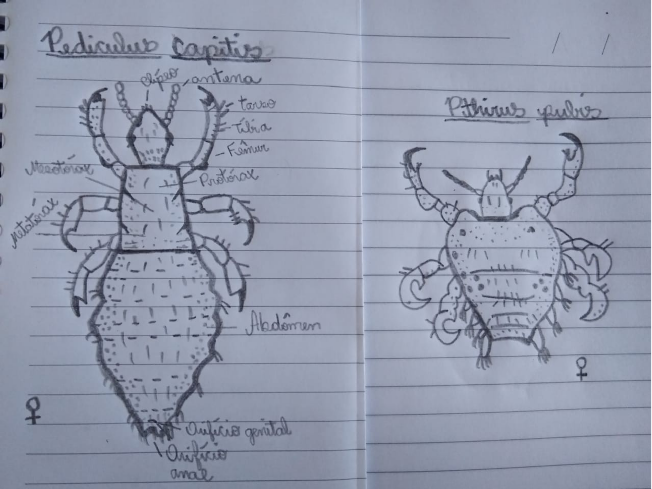 ESTUDO DIRIGIDO DE ECTOPARASITOS Individual Valor: 3,0 pontos Neilson Sousa Dutra 11611BIO217 1. Classificação: Filo: Arthropoda Classe: Insecta Ordem: Anoplura A ordem Anoplura alberga duas famílias distintas: a Pediculidae (piolhos) e a Pthiridae (chato). Estes artrópodes são ectoparasitas permanentes e seus ovos denominados “lêndeas”. Tanto os machos quanto as fêmeas, ou mesmo as ninfas, são hematófagos e alteram a qualidade de vida do hospedeiro podendo, às vezes, veicular alguns patógenos. O Pediculus capitis (piolho) é um inseto pequeno (3 a 4 mm) e vivem aderidos aos pêlos da cabeça. Botam cerca de 5 a 6 ovos/dia (150 em toda sua vida de 40 dias). Apresenta um período de incubação de 8 a 9 dias e o período para seu desenvolvimento de ninfa 1 até adulto é aproximadamente 15 dias. O Pthirus pubis (chato) é um inseto que vive e deposita seus ovos nos pêlos pubianos, sendo frequentemente transmitido através do contato sexual. *Diferencie Pediculus capitis x Pthirus pubis e desenhe as duas espécies. Em Pediculus, o corpo é aproximadamente 2-3 vezes mais longo do que largo e os três pares de pernas são de mesmo comprimento e largura, em contraposição à Pthirus, em que o corpo é pouco mais longo do que largo (1,5 vezes e assemelhando-se a um caranguejo) e o primeiro par de pernas é mais curto e mais estreito com relação aos posteriores, de mesmas dimensões. Nos dois gêneros, machos e fêmeas podem ser diferenciados pela extremidade abdominal que é arredondada nos machos e provida de uma reentrância nas fêmeas Não raro, a genitália do macho evidencia-se pela face ventral. Em Pediculus os espiráculos abdominais situam-se lateralmente, um em cada segmento, enquanto que em Pthirus os três primeiros espiráculos abdominais ocorrem em linha transversa no primeiro segmento. 2. Classificação: Filo: Arthropoda Classe: Insecta Ordem: Siphonaptera A ordem Siphonaptera alberga pulgas de interesse médico divididas em duas famílias distintas: Pulicidae, com as espécies: Pulex irritans (homem), Xenopsylla cheopis (rato), Ctenocephalides canis (cão) e C. felis (gato) e Tungidae, com a espécie Tunga penetrans (bicho-de-pé). *Diferencie Pulicidae x Tungidae e desenhe estes ectoparasitas. Pulex irritans: Apresenta uma única cerda no occipício (parte posterior da cabeça); mesopleura não dividida; forma da espermateca nas fêmeas desta espécie se difere das demais. Xenopsylla cheopsis: Apresenta duas fileiras divergentes de cerdas no occipício (parte posterior da cabeça), cujos pontos de inserção formam a figura de um V; mesopleura dividida por uma sutura; morfologia e pigmentação das espermatecas diferentes de P. irritans. Ctenocephalides felis e Ctenocephalides canis: são as pulgas de carnívoros, parasitando indiferentemente cães e gatos. Apresentam dois ctenídios evidentes: genal e pronotal. A diferenciação entre as duas espécies pode ser feita pelo ctenídio genal: o primeiro dente é bem menor que o segundo , em fêmeas de C. canis, e um pouco menor que o segundo, em fêmeas de C. felis. As diferenças mais notáveis entre as duas espécies são proporcionadas pela quetotaxia do metepisterno (metapleura) e da tíbia posterior. Tunga penetrans: Conhecida como´´bicho-de-pé´´. É a menor espécie de pulga conhecida (1 mm). Os hospedeiros atacados mais frequentemente são o porco, cão, gato e o homem (onde prefere penetrar principalmente pela sola do pé, calcanhar e cantos dos dedos). Apenas a fêmea é que penetra a cabeça, o tórax e parte do abdome nos tecidos do hospedeiro, alimentando-se de líquido tissular e sangue e se enchendo de ovos, tomando uma forma hipertrofiada, denominada neossoma. *Diferencie as diferentes espécies da família Pulicidae (cabeça). Pulex irritans: possui cabeça arredondada e apresenta apenas uma cerda na região occipital. Ctenocephalides sp: Presença de ctenídios pronotal e genal. Xenopsylla cheopsis: Cerdas em forma de V na borda posterior da cabeça. 3. Classificação: Filo: Arthropoda Classe: Arachnida Subclasse: Acari Ordem: Ixodida São ectoparasitas e hematófagos, geralmente são ovais, alguns são parasitas permanentes e outros, temporários. São conhecidas mais de 800 espécies no mundo e são encontrados em quase todos os continentes, nos mais diversos ambientes: mato, madeiras, frestas, plantas, animais, etc. Os membros da Ordem Ixodida são conhecidos como carrapatos, apresentam porte relativamente grande, comuns na maior parte das regiões tropicais e temperadas do planeta. Têm importância médica e veterinária por serem ectoparasitos sugadores de sangue de vertebrados e por transmitir os agentes etiológicos de uma série de doenças para o homem e animais. A ordem Ixodida tem duas famílias de interesse médico veterinário: Família Ixodidae, possuem carapaça resistente feita de quitina e são os de maior interesse médico e veterinário, pelos danos que podem causar. Família Argasidae são conhecidos como “carrapatos moles”, pela ausência desta estrutura. *Diferencie os Argasidae X Ixodidae e desenhe as duas famílias Família Argasidae: são conhecidos popularmente como ´´carrapatos moles´´, uma vez que não apresentam escudo na região dorsal. Diferem-se dos ixodídeos pela ausência de escudo dorsal, pela localização do peritrema (entre o terceiro e o quarto par de patas) e por apresentarem o gnatossoma ancorado na região ventral do idiossoma. Família Ixodidae: são chamados de ´´carrapatos duros´´, por possuírem uma placa esclerotizada na região dorsal (chamada de escudo) que proporciona uma consistência mais rígida ao corpo. Apresentam o gnatossoma ancorado na região anterior do corpo, peritrema localizado após o quarto par de patas e a presença de escudo dorsal.