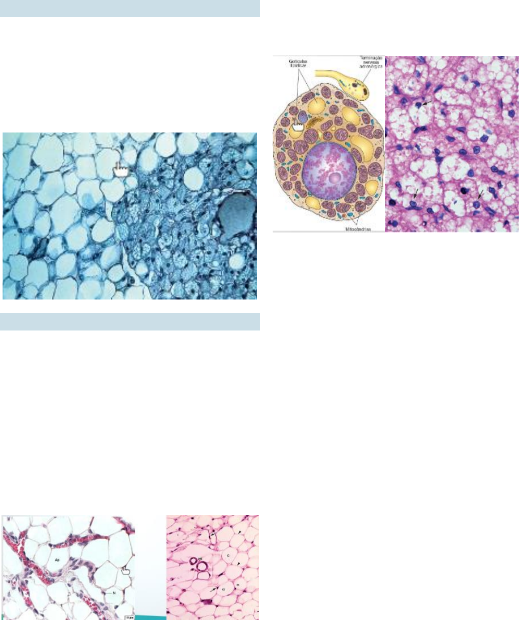 Tecido Adiposo CARACTERÍSTICAS Tecido conjuntivo especializado importante na homeostase energética. » Predominância de células adiposas (adipócitos). » Células adaptadas para o armazenamento de gordura. » Pequenos grupos no tecido conjuntivo frouxo. » Grandes agregados - tecido adiposo distribuído pelo corpo. CLASSIFICAÇÃO Tecido adiposo unilocular » Gordura branca/ amarela-escuro. » Reserva de energia. » Abundante em animais adultos. » Vascularização abundante. » Citoplasma ocupado por uma única gotícula lipídica. » Núcleo achatado e excêntrico. » Tecido conjuntivo de sustentação (fibroblastos e macrófagos). » Septos de tecido conjuntivo. » Vasos sanguíneos e nervos. » Fibras reticulares (colágeno III) sustentam os adipócitos. Tecido adiposo multilocular » Gordura parda/ marrom. » Dissipar energia na forma de calor. » Recém nascidos e animais e hibernam. » Distribuição limitada. » Vascularização abundante. » Células poligonais e pequenas. » Citoplasma carregado de várias gotículas lipídicas de diversos tamanhos.