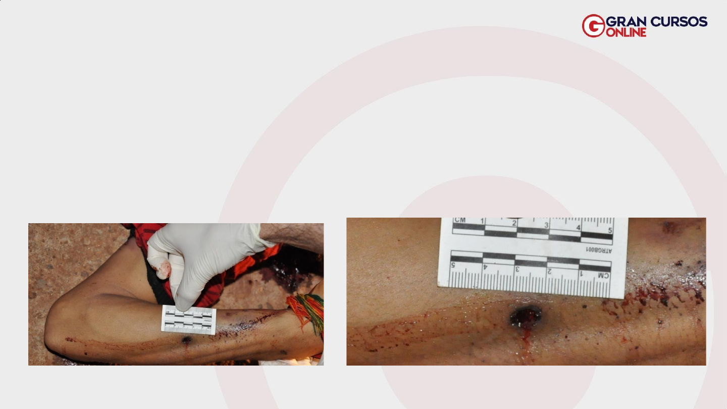 Feridas perfurocontusas por PAF • Efeitos primários e secundários; EFEITOS PRIMÁRIOS • Orifícios (OE/OS) e túnel (passagem do PAF). Feridas perfurocontusas por PAF EFEITOS PRIMÁRIOS • Independem da distância; • Orifício de entrada (OE): rompimento da epiderme + derme; • A epiderme é deformada pelo PAF; • A epiderme envolve o PAF; • A epiderme limpa o PAF (orla de enxugo): remoção das impurezas do PAF na pele, ao redor do OE; • O PAF faz escoriação (orla de contusão): ausência de epiderme no OE; orla de contusão = orla de escoriação! • Aréola equimótica: rompimento de vasos ao redor do OE; Perito e Professor Laécio Carneiro @professorlaecio.csi Perito e Professor Laécio Carneiro Orla de enxugo e de contusão Perito e Professor Laécio Carneiro Aréola equimótica EFEITOS SECUNDÁRIOS • Tiros encostados e à curta distância; 1. Ação dos gases superaquecidos; 2. Fumaça: pólvora combusta (queimada), CO2, H2O, ...; 3. Fuligem: combustão incompleta (CO, NO,...); 4. Microprojéteis: pólvora incombusta. @professorlaecio.csi Perito e Professor Laécio Carneiro Zona de Esfumaçamento @professorlaecio.csi Perito e Professor Laécio Carneiro Perito e Professor Laécio Carneiro Zona de chamuscamento @professorlaecio.csi Perito e Professor Laécio Carneiro Zona de tatuagem @professorlaecio.csi Disparo tangencial transfixante Lesão menos comum! Tiros à distância - OE de PAF, características • Forma arredondada ou elíptica; • Bordas regulares e invertidas; • Orla ou zona de enxugo; • Orla ou zona de contusão; • Aréola equimótica; Tiros à curta distância - OE de PAF, características • Forma arredondada ou elíptica; • Bordas regulares e invertidas; • Orla ou zona de enxugo; • Orla ou zona de contusão; • Aréola equimótica; • Zona de tatuagem; • Zona de esfumaçamento; • Zona de chamuscamento. Orifício de Entrada de PAF – características Tiros de encosto • Forma irregular ou estrelada; • Bordas irregulares e evertidas; • Zona de chamuscamento; Câmara de mina de Hoffman Buraco de mina de Hoffman Câmara de mina de Hoffman Sinal de Benassi Sinal de Puppe-Werkgartner Orifício de Saída (OS) de PAF – características • Forma irregular ou estrelada; • Bordas irregulares e evertidas; • Sem orla de enxugo, contusão, equimose; • Sem esfumaçamento, chamuscamento, tatuagem; OS OE