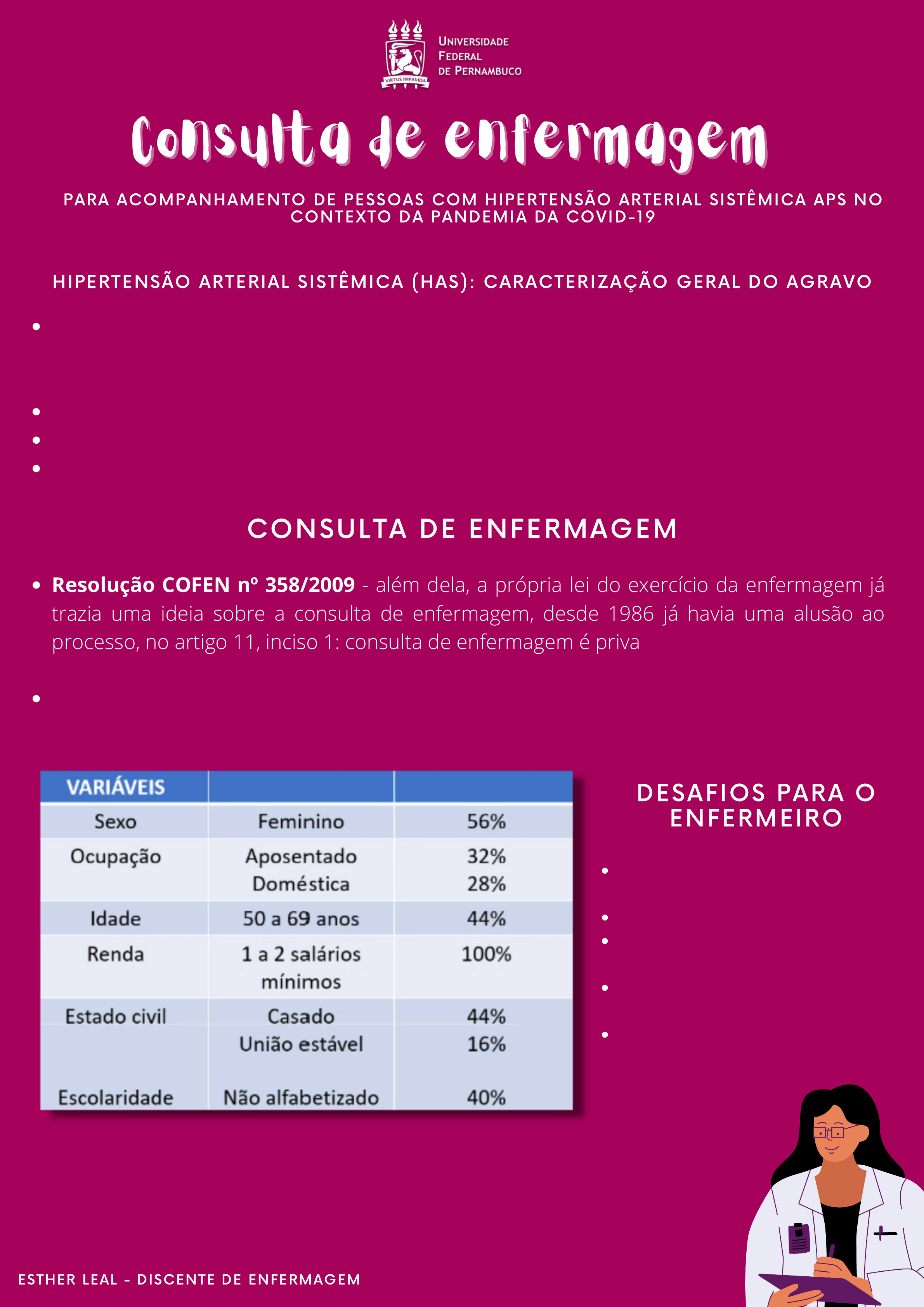 Condição clínica multifatorial, caracterizada por níveis elevados e sustentados de pressão arterial (PA), valores: até 139 por 90, considera-se como valor limite, acima disso valor hipertensivo. Prevalência de 21,4 na população maior de 18 anos. Assintomática, em muitos casos. Medidas farmacológicas e não farmacológicas (preferíveis) PARA ACOMPANHAMENTO DE PESSOAS COM HIPERTENSÃO ARTERIAL SISTÊMICA APS NO CONTEXTO DA PANDEMIA DA COVID-19 HIPERTENSÃO ARTERIAL SISTÊMICA (HAS): CARACTERIZAÇÃO GERAL DO AGRAVO ESTHER LEAL - DISCENTE DE ENFERMAGEM CONSULTA DE ENFERMAGEM Resolução COFEN nº 358/2009 - além dela, a própria lei do exercício da enfermagem já trazia uma ideia sobre a consulta de enfermagem, desde 1986 já havia uma alusão ao processo, no artigo 11, inciso 1: consulta de enfermagem é privativa do enfermeiro. Diagnósticos de Enfermagem: PTS (projeto terapêutico singular), 1º momento: coleta de dados - anamnese e exame físico, 2º momento: diagnósticos a partir dos dados coletados. Não é sempre, mas muitas vezes a escolaridade está relacionada a esses casos, pois a falta de uma educação em saúde faz com que haja uma falta de compreensão e cuidado em relação às doenças. DESAFIOS PARA O ENFERMEIRO Resistência à mudança no estilo de vida Ausência de sintomas Integralidade no olhar da pessoa co HAS e não da HAS Educação em saúde na perspectiva da práxis freiriana - Predominância cultural do modelo biomédico na concepção de saúde PRINCIPAIS DIAGNÓSTICOS PARA A HIPERTENSÃO ESTHER LEAL - DISCENTE DE ENFERMAGEM