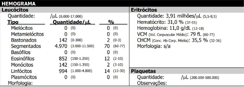 CASOS CLÍNICOS – DISCIPLINA DE PATOLOGIA CLÍNICA – T6 CASO 1 Canino, SRD, Fêmea, 5,5 anos peso 7,3kg Histórico: Há 2 anos teve piometra e foi realizada a cirurgia de OSH. Há 20 dias proprietários relatam que não está se alimentando direito (recebe comida caseira – restos das refeições dos proprietários). Também relatam que nesse período também teve vômitos esporádicos. Fez uso de vermífugo a 1 mês. Exame Clínico: TR38.5ºC, mucosas congestas, ulceras na mucosa oral, dor a palpação abdominal principalmente em região renal direita e esquerda. Demais avaliações (ausculta pulmonar, cardíaca, linfonodos) sem alterações evidentes. Exames Complementares: ecografia da região abdominal indicou um grau avançado de lesão renal. Hemograma: CLASSIFICAÇÃO: ANEMIA MACROCÍTICA NORMOCRÔMICA ARREGENERATIVA SECUNDÁRIA DO TIPO DISPLÁSTICA HIPOPROLIFERATIVA. CASO 2 Suíno, 2 meses, Fêmea , Raça MiniPig, 2,7 kg Histórico: Foi comprada de um pet shop com 40 dias, alimentação a base de furtas e verduras. Proprietário notou que está mais apática e aparentando ter frio. Exame Clínico: mucosas hipocoradas, cerdas ásperas, leve taquipneia quando estimulada, TR 37,2ºC CLASSIFICAÇÃO: ANEMIA NORMOCÍTICA HIPOCRÔMICA REGENERATIVA DO TIPO DISPLÁSTICA HIPERPROLIFERATIVA. Leucopenia - CASO CLÍNICO 3 Felino, 1 ano, 2,3kg, F Histórico: Paciente com vacinas e vermífugos em dia, domiciliada em apartamento com outros gatos saudáveis. Apresenta-se apática, não se alimenta, proprietário observou comer areia da caixa sanitária. Teste Snap Fiv/Felv com resultado negativo. Exame Clínico: TR 38ºC, normohidratada, mucosas pálidas (foto), palpação abdominal sem alterações, taquicardia. CLASSIFICAÇÃO: ANEMIA NORMOCÍTICA HIPOCRÔMICA ARREGENERATIVA DO TIPO DISPLÁSTICA HIPOPROLIFERATIVA PELA DEFICIÊNCIA DE FERRO NA SÍNTESE DOS ERITRÓCITOS OU APLASIAS.