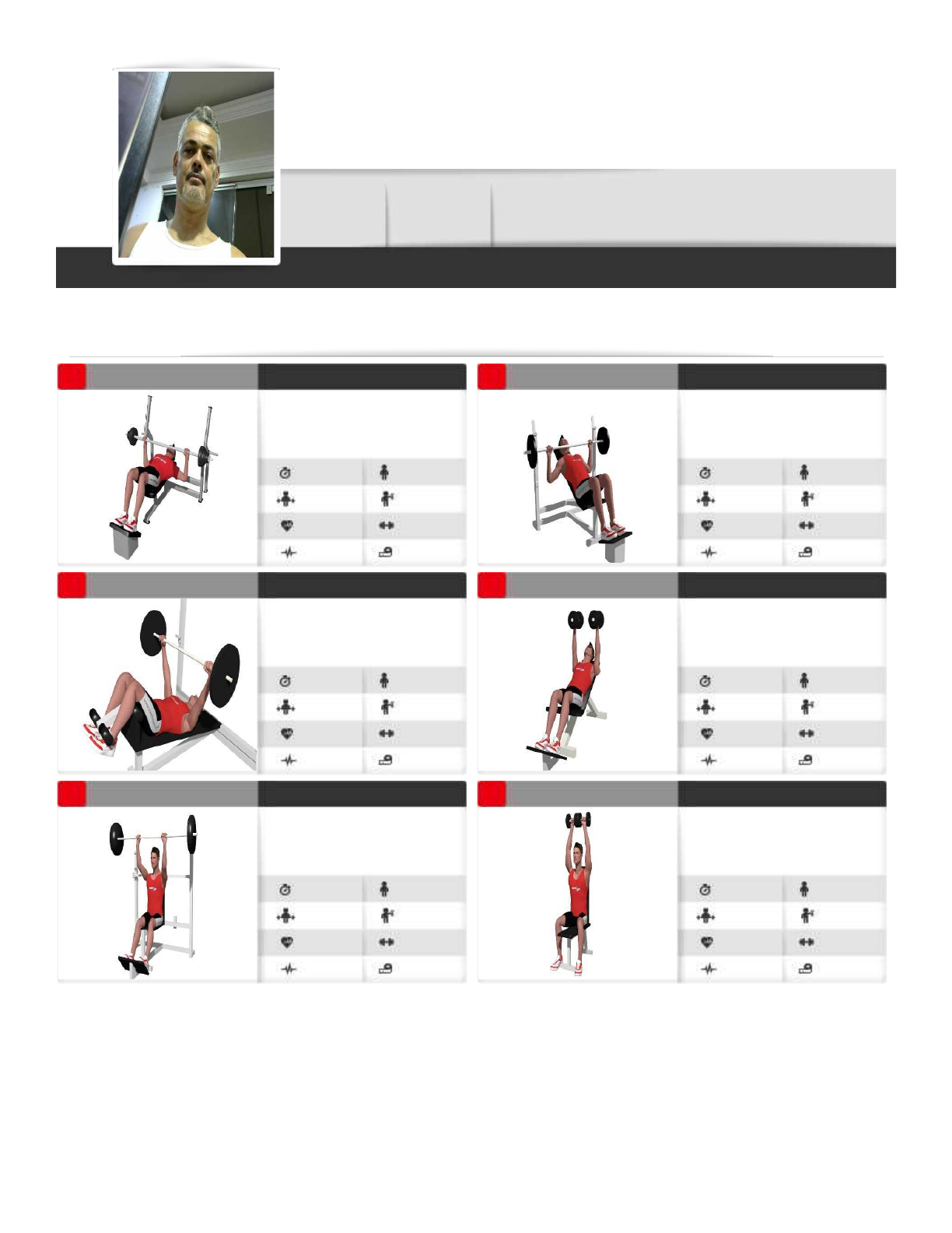 INCREMENTO MASSA MUSCULAR04-2019 06-2019 METAINÍCIO FIM OLÁ, PETERSON PEREIRA DE OLIVEIRA KING KONG FITNESS Apresenta-te seu treinamento personalizado. SESSÃO 1 PRINCIPAL PEITORAL 3 136 00:00:5900:00:30 CONCÊNTRICO FORÇA SUPINO Máquina Nº 01 8-12 PEITORAL 3 136 00:00:5900:00:30 CONCÊNTRICO FORÇA SUPINO INCLINADO Máquina Nº 02 8-12 PEITORAL 3 136 00:00:5900:00:30 CONCÊNTRICO FORÇA SUPINO DECLINADO Máquina Nº 03 8-12 PEITORAL 3 136 00:00:5900:00:30 CONCÊNTRICO FORÇA CRUCIFIXO INCLINADO COM HALTERES Máquina Nº 04 8-12 OMBROS 3 136 00:00:5900:00:30 CONCÊNTRICO FORÇA DESENVOLVIMENTO PELA FRENTE COM BARRA Máquina Nº 05 8-12 OMBROS 3 136 00:00:5900:00:30 CONCÊNTRICO FORÇA DESENVOLVIMENTO ARNOLD Máquina Nº 06 8-12 ABDOMINAIS 3 136 00:00:5900:00:30 CONCÊNTRICO FORÇA ABDOMINAL CURTINHO COM ANILHA ACIMA DA CABEÇA Máquina Nº 07 8-12 ABDOMINAIS 3 136 00:00:5900:00:30 CONCÊNTRICO FORÇA ABDOMINAL INFRA Máquina Nº 08 8-12 00:35:36 0TEMPO FASE PRINC CALORIAS SESSÃO 2 PRINCIPAL QUADRÍCEPS 4 136 00:00:5900:00:30 CONCÊNTRICO FORÇA AGACHAMENTO Máquina Nº 01 12-15 QUADRÍCEPS 3 136 00:00:5900:00:30 CONCÊNTRICO FORÇA AFUNDO NO SMITH MACHINE Máquina Nº 02 12 QUADRÍCEPS 3 136 00:00:5900:00:30 CONCÊNTRICO FORÇA CADEIRA EXTENSORA Máquina Nº 03 12-10-8-6 GÊMEOS/SÓLEO 3 136 00:00:5900:00:30 CONCÊNTRICO FORÇA PANTURRILHA BANCO ROMANO Máquina Nº 04 15-20 GÊMEOS/SÓLEO 3 136 00:00:5900:00:30 CONCÊNTRICO FORÇA GEMEOS NO HACK Máquina Nº 05 15-20 00:23:44 0TEMPO FASE PRINC CALORIAS SESSÃO 3 PRINCIPAL BÍCEPS 3 136 00:00:5900:00:30 CONCÊNTRICO FORÇA ROSCA BICEPS SCOTT MÁQUINA Máquina Nº 01 10-15 BÍCEPS 3 136 00:00:5900:00:30 CONCÊNTRICO FORÇA ROSCA "21" Máquina Nº 02 7-7-7 BÍCEPS 3 136 00:00:5900:00:30 CONCÊNTRICO FORÇA ROSCA BÍCEPS ALTERNADO COM HALTERES SENTADO Máquina Nº 03 12/12 TRÍCEPS 3 136 00:00:5900:00:30 CONCÊNTRICO FORÇA TRICEPS BANCO Máquina Nº 04 10-15 TRÍCEPS 3 136 00:00:5900:00:30 CONCÊNTRICO FORÇA TRICEPS FRANCES COM HALTER Máquina Nº 05 10-15 TRÍCEPS 3 136 00:00:5900:00:30 CONCÊNTRICO FORÇA FONDOS PARA TRICEPS EN BARRA Máquina Nº 06 10-15 00:26:42 0TEMPO FASE PRINC CALORIAS SESSÃO 4 PRINCIPAL ISQUITIBIAIS 3 136 00:00:5900:00:30 CONCÊNTRICO FORÇA MESA FLEXORA Máquina Nº 01 10-15 ISQUITIBIAIS 3 136 00:00:5900:00:30 CONCÊNTRICO FORÇA STIFF Máquina Nº 02 10-15 ADUTOR/ABDUT 3 136 00:00:5900:00:30 CONCÊNTRICO FORÇA CADEIRA ADUTORA Máquina Nº 03 10-15 ADUTOR/ABDUT 3 136 00:00:5900:00:30 CONCÊNTRICO FORÇA CADEIRA ABDUTORA Máquina Nº 04 10-15 ABDOMINAIS 3 136 00:00:5900:00:30 CONCÊNTRICO FORÇA ABDOMINAL CANIVETE NO BANCO Máquina Nº 05 10-15 ABDOMINAIS 3 136 00:00:5900:00:30 CONCÊNTRICO FORÇA ABDOMINAL CANIVETE, MÃO APOIADAS Máquina Nº 06 10-15 00:26:42 0TEMPO FASE PRINC CALORIAS SESSÃO 5 PRINCIPAL COSTAS 3 136 00:00:5900:00:30 CONCÊNTRICO FORÇA BARRA FIXA Máquina Nº 01 10-12 COSTAS 3 136 00:00:5900:00:30 CONCÊNTRICO FORÇA PUXADA ABERTA Máquina Nº 02 10-12 COSTAS 3 136 00:00:5900:00:30 CONCÊNTRICO FORÇA REMADA BAIXA SENTADA FECHADA NEUTRA Máquina Nº 03 10-12 COSTAS 3 136 00:00:5900:00:30 CONCÊNTRICO FORÇA REMADA BAIXA COM TRIÂNGULO Máquina Nº 04 10-12 TRAPÉZIO 3 136 00:00:5900:00:30 CONCÊNTRICO FORÇA ENCOLHIMENTO COM BARRA Máquina Nº 05 10-12 TRAPÉZIO 3 136 00:00:5900:00:30 CONCÊNTRICO FORÇA ENCOLHIMENTO COM HALTERES Máquina Nº 06 10-12 ANTEBRAÇO 3 136 00:00:5900:00:30 CONCÊNTRICO FORÇA FLEXORES PUNHO UNILATERAL COM HALTER Máquina Nº 07 10-12 ANTEBRAÇO 3 136 00:00:5900:00:30 CONCÊNTRICO FORÇA EXTENSORES PUNHO COM BARRA Máquina Nº 08 10-12 00:35:36 0TEMPO FASE PRINC CALORIAS