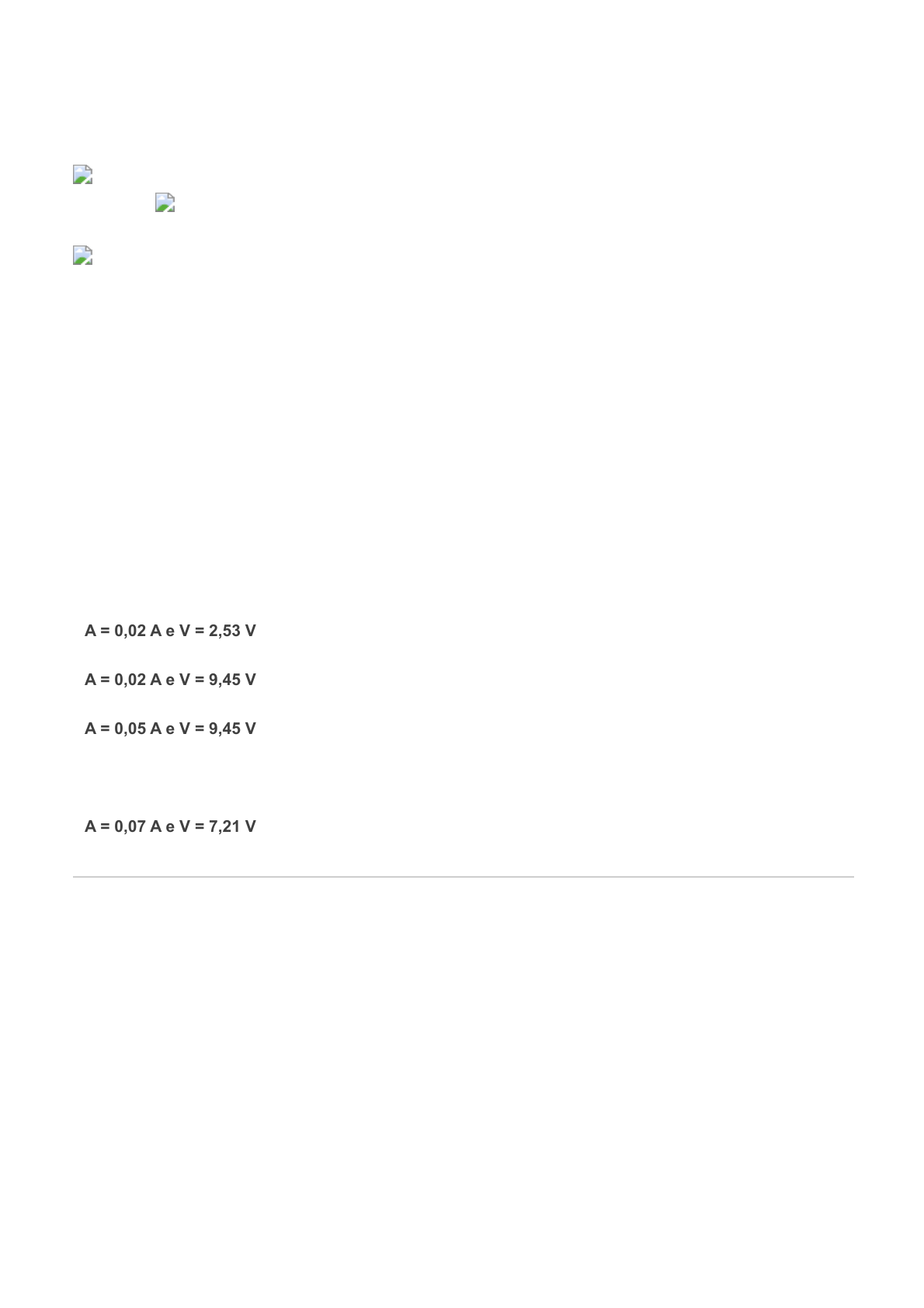 09/06/2021 Comentários https://sereduc.blackboard.com/ultra/courses/_45984_1/grades/assessment/_3243153_1/overview/attempt/_12444298_1/review/inline-feedback?… 1/8 Ocultar opções de resposta Pergunta 1 -- /1 Na figura abaixo, um voltímetro de resistência begin mathsize 12px style straight R subscript straight V end style = 300 Ω e um amperímetro de resistência begin mathsize 12px style straight R subscript straight A end style = 3,00 Ω estão sendo usados para medir uma resistência R em um circuito que também contém uma resistência begin mathsize 12px style straight R subscript 0 end style = 100 Ω e uma fonte ideal de força eletromotriz = 12,0 V. A resistência R é dada por R = V/i, em que ‘V’ é a leitura do voltímetro e ‘i’ é a corrente na resistência R. Entretanto, a leitura do amperímetro não é i, e sim i′, que é a soma de i com a corrente no voltímetro. Assim, a razão entre as leituras dos dois medidores não é R, e sim a resistência aparente R′ = V/i′. Sabe-se que R = 85 Ω. Analisando a figura e considerando o conteúdo estudado sobre amperímetro e voltímetro, assinale a alternativa que apresenta corretamente a leitura do amperímetro e do voltímetro: BQ04_ELETRICIDADE E MAGNETISMO_10.PNG A = 0,02 A e V = 2,53 V A = 0,02 A e V = 9,45 V A = 0,05 A e V = 9,45 V Resposta corretaA = 0,07 A e V = 4,79 V A = 0,07 A e V = 7,21 V Pergunta 2 -- /1 Muitos equipamentos eletrônicos são compostos por circuitos eletrônicos, que podem ser simples ou complexos. Os circuitos elétricos mais complexos consistem em arranjos de vários resistores que podem estar ligados uns aos outros em série ou em paralelo. Para qualquer uma dessas associações, pode ser calculada uma resistência equivalente a fim de definir os parâmetros elétricos, tais como corrente e tensão. 09/06/2021 Comentários https://sereduc.blackboard.com/ultra/courses/_45984_1/grades/assessment/_3243153_1/overview/attempt/_12444298_1/review/inline-feedback?… 2/8 Ocultar opções de resposta Ocultar opções de resposta Observe a figura acima, considere que cada resistor possui resistência de 1 Ω. Calcule a resistência equivalente de cada circuito e assinale a alternativa que apresenta em ordem o circuito de resistência equivalente mais baixa para o de resistência equivalente mais alta. BQ04_ELETRICIDADE E MAGNETISMO_02.PNG Resposta corretaB < D < C < A B < C < D < A D < B < C < A A < B < D < C D < C < B < A Pergunta 3 -- /1 Tem-se um circuito formado por uma combinação em série de resistores de 6,0 kΩ e 5 kΩ, conectados através de uma bateria de 50,0 V, cuja resistência interna pode ser considerada desprezível. Um voltímetro de resistência igual a 10 kΩ é colocado no circuito para medir a diferença de potencial. Considerando o enunciado e o conteúdo estudado sobre amperímetro e voltímetro, assinale a alternativa que indique corretamente a diferença de potencial real medida no resistor de 5 kΩ. V = 17,85 kV V = 39,7 V V = 26,8 V Resposta corretaV = 17,85 V V = 11,9 V 09/06/2021 Comentários https://sereduc.blackboard.com/ultra/courses/_45984_1/grades/assessment/_3243153_1/overview/attempt/_12444298_1/review/inline-feedback?… 3/8 Ocultar opções de resposta Pergunta 4 -- /1 Um capo magnético é gerado nas vizinhanças de uma partícula carregada em movimento em uma corrente elétrica. O campo magnético é análogo ao campo elétrico, pois ambos são grandezas vetoriais e são representados por linhas, linhas de força e linhas de campo. Considerando a afirmação acima e o conteúdo estudado sobre o campo magnético, é correto afirmar que: um campo magnético pode ser gerado em um ímã que possui dois polos norte magnéticos. Resposta correta a força magnética gerada sobre uma partícula dentro de um campo magnético possui direção perpendicular ao campo magnético. ímãs permanentes são atraídos por outro ímã permanente e repelidos por pedaços de ferro não imantados. um campo magnético é gerado sobre qualquer partícula eletricamente carregada. a bússola é utilizada como orientação geográfica, pois o polo norte da bússola aponta para o polo sul da Terra. Pergunta 5 -- /1 Um capacitor descarregado de capacitância C = 4,60 µF está em um circuito ligado em série com um resistor de 7,50 kΩ e uma fonte fem ideal de 125 V. Imediatamente após fechar a chave que conecta a fonte fem ao capacitor, se inicia a passagem de uma corrente elétrica. Analise a situação apresentada e considerando o conteúdo estudado sobre circuito RC, assinale a alternativa que indica corretamente a tensão no capacitor (Vc) e no resistor ( begin mathsize 12px style straight V subscript straight R end style) e a intensidade da corrente ( begin mathsize 12px style straight i subscript straight R end style) que passa pelo resistor no instante t = 0. 09/06/2021 Comentários https://sereduc.blackboard.com/ultra/courses/_45984_1/grades/assessment/_3243153_1/overview/attempt/_12444298_1/review/inline-feedback?… 4/8 Ocultar opções de resposta begin mathsize 12px style straight V subscript straight C end style = 125; begin mathsize 12px style straight V subscript straight R end style = 125 V e begin mathsize 12px style straight i subscript straight R end style = 16,7×103 A begin mathsize 12px style straight V subscript straight C end style = 125 V; begin mathsize 12px style straight V subscript straight R end style = 125 V e begin mathsize 12px style straight i subscript straight R end style = 0,0167 A begin mathsize 12px style straight V subscript straight C end style = 0; begin mathsize 12px style straight V subscript straight R end style = 125 V e begin mathsize 12px style straight i subscript straight R end style = 16,7 A begin mathsize 12px style straight V subscript straight C end style = 0; begin mathsize 12px style straight V subscript straight R end style = 125 V e begin mathsize 12px style straight i subscript straight R end style = 16,7×103 A Respost