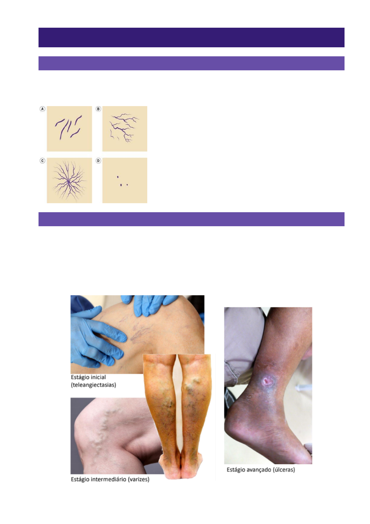 Veia� � Linfátic� - Estud� Dirigid� Questão 1 - O que significa teleangiectasias? As telangiectasias são dilatações de capilares, artérias ou veias menores do que 2 mm de calibre, têm disposição linear e sinuosa, podendo formar emaranhados ou ter aspecto aracneiforme (“aranhas vasculares”) ou retiformes (“em forma de rede”). Eventualmente, apresentam-se como dilatações puntiformes (telangiectasia papular) A) Telangiectasia linear ou simples B) Telangiectasia reticular C) Telangiectasia aracneiforme (ou spider) D) Telangiectasia papular Questão 2 - O que significa veias varicosas? Quais as consequências do desenvolvimento delas e progressão sem cuidados? As veias varicosas são aquelas anormalmente dilatadas e tortuosas produzidas por pressão intraluminal aumentada e prolongada e por perda de sustentação da parede dos vasos. As veias superficiais dos membros inferiores e superiores são tipicamente envolvidas (menor camada muscular dos membros envolta desses vasos, o que faz com que o retorno venoso seja mais prejudicado, aumentando a chance de estase sanguínea que pode propiciar o desenvolvimento das veias varicosas). A dilatação varicosa torna as valvas venosas incompetentes e leva à estase, congestão, edema, dor e trombose. As sequelas mais incapacitantes incluem edema persistente na extremidade e alterações isquêmicas da pele, incluindo dermatite de estase e ulcerações; a má cura de feridas e as infecções superpostas podem levar a úlceras crônicas. é muito rara a embolia a partir destas veias superficiais. Isto contrasta inteiramente com o tromboembolismo relativamente frequente que e origina em veias profundas trombosadas. Questão 3 - Por que as úlceras costumam aparecer em regiões mais distais do membro inferior? As úlceras venosas ou úlceras de estase representam de 60 a 70%, aproximadamente, de todas as úlceras de perna. Trata-se de uma insuficiência venosa crônica (IVC), o que significa uma incapacidade persistente, duradoura, das veias de exercerem a sua função. A bomba muscular da panturrilha, uma das áreas atingidas por IVC, no caso de pacientes portadores de úlceras venosas, corresponde ao mecanismo de retorno venoso contra a gravidade nos membros inferiores, realizado pelos músculos da panturrilha e pelas válvulas unidirecionais. A compressão muscular das veias impulsiona o sangue em direção ascendente, enquanto as válvulas impedem o refluxo sanguíneo. Ocorre, então, uma falha nesse mecanismo, causada, principalmente, pela tromboflebite e pela trombose venosa profunda. As úlceras venosas surgem com maior frequência no terço distal das pernas em áreas de dermatite ou de celulite endurecida das regiões dos maléolos mediais (áreas que sofrem primeiro com os efeitos gravitacionais potencializados pela insuficiência valvar, maior estase, maior dermatite, maiores áreas de isquemia e necrose, propiciando à formação de úlceras). Podem tornar-se crônicas, apresentando frequentes infecções secundárias, o que dificulta o processo de cicatrização. São mais frequentes em indivíduos idosos e naqueles que exercem profissões que exigem posição ortostática prolongada. Ocorrem mais em mulheres, devido principalmente a distúrbios neuroendócrinos e por tromboses venosas obstétricas. Questão 4 - O que significa dermatite de estase? Por que ocorre hiperpigmentação da pele em indivíduos que desenvolvem veias varicosas e úlceras? A dermatite de estase, ou eczema de estase, é uma dermatose inflamatória comum das extremidades dos membros inferiores que ocorre em pacientes com insuficiência venosa, frequentemente associada a veias varicosas, edema, hiperpigmentação, lipodermatoesclerose e ulcerações. O aumento da pressão capilar subsequente ao comprometimento da integridade endotelial da microcirculação resulta em extravasamento de fibrina, e a perturbação da função da barreira epitelial resulta em inflamação local. A dermatite de estase ocorre mais comumente nos calcanhares mas também pode afetar áreas com edema crônico, como os braços após o tratamento dos linfonodos axilares com radiação. A hiperpigmentação da pele é caracterizada pela liberação de hemoglobina após o rompimento dos glóbulos vermelhos extravasados (hemólise). Devido a essa hiperpigmentação, a dermatite de estase também pode ser chamada de dermatite ocre. Questão 5 - O que significa tromboflebite/flebotrombose? Qual a consequência dessa formação? Tromboflebite ou flebotrombose são termos sinônimos para designar a trombose e inflamação venosa. A tromboflebite, associada a imobilização prolongada, pode predispor à trombose venosa profunda e à embolia pulmonar. Questão 6 - Qual a principal consequência de disfunção dos vasos linfáticos? Os transtornos primários dos vasos linfáticos são extremamente incomuns; os processos secundários são muito mais frequentes e se desenvolvem em associação a uma inflamação ou a malignidades. Linfangite é a inflamação aguda desencadeada quando infecções bacterianas se propagam pelos linfáticos; os agentes mais comuns são os estreptococos beta-hemolíticos do grupo A, embora qualquer micróbio possa estar associado. Os linfáticos afetados ficam dilatados e cheios de um exsudato de neutrófilos e monócitos; estes infiltrados podem atravessar a parede dos vasos e entrar em tecidos perilinfáticos e, nos casos graves, produzir celulite ou abscessos focais. Clinicamente, a linfangite é reconhecida por estrias subcutâneas dolorosas e eritematosas ( os linfáticos inflamados) e por aumento de volume doloroso dos linfonodos de drenagem (linfadenite aguda). Se não houver sucesso em conter as bactérias dentro dos linfonodos, a subsequente passagem para a circulação venosa pode resultar em bacteremia ou sepse; Pode ocorrer linfedema primário em razão de um defeito congênito isolado (linfedema congênito simples) ou como a doença de Milr