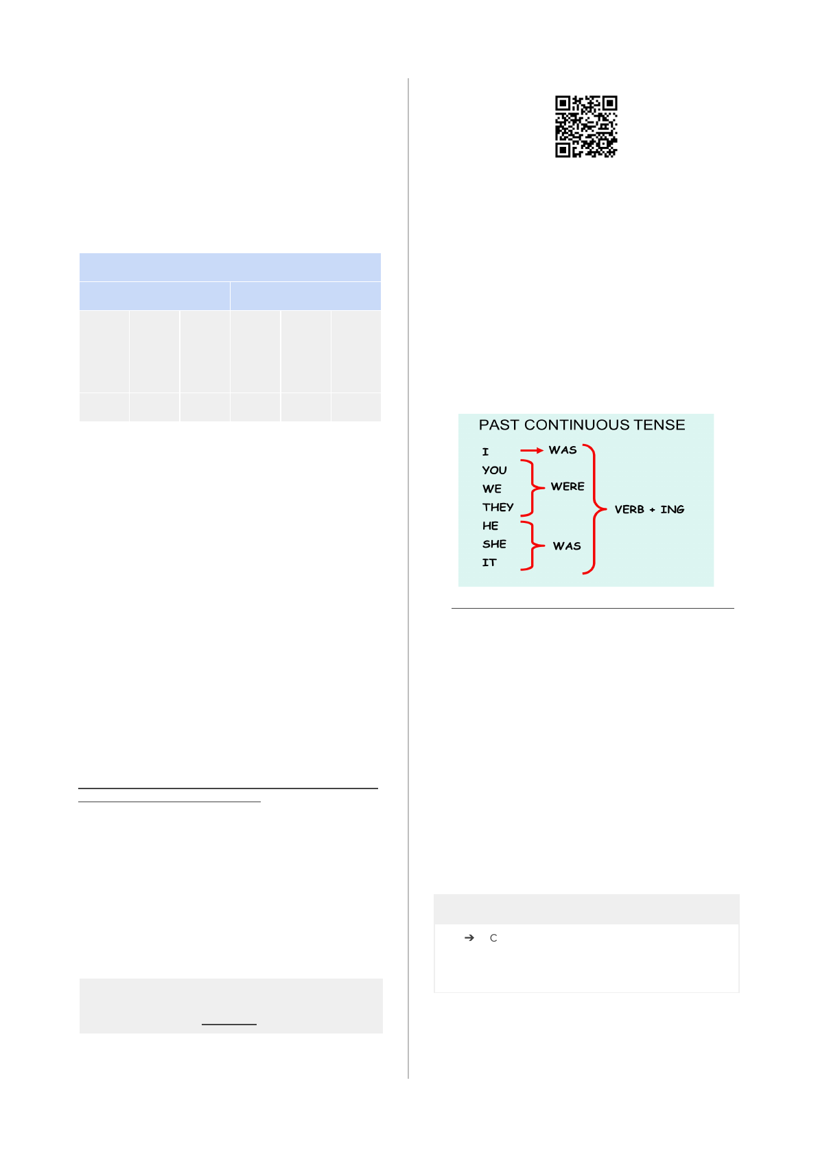 - Quantas vezes os pronomes de 2ª pessoa do singular foram empregados no total? - Dessas vezes, quantas foram realizadas pelo pronome “tu”? E quantas pelo pronome “você”? - Faça um cálculo percentual das ocorrências. - Quantas vezes os pronomes de 1ª pessoa do plural foram empregados no total? - Dessas vezes, quantas foram realizadas pelo pronome “nós”? E quantas por “a gente”? - Faça um cálculo percentual das ocorrências. Passo 4: Complete a seguinte tabela: Passo 5: Escreva um pequeno parágrafo no qual responda à seguinte questão: - Baseando-se nas informações da tabela, quais são as formas de pronome mais comuns no uso da língua? - A tabela que apresentamos ao início desta atividade é verdadeira? Por quê? Obs.: A conversa de WhatsApp é apenas um lugar para coletar e observar a língua em uso. Caso não tenha acesso ao aplicativo ou tenha problemas de conexão, você pode selecionar outras situações de comunicação para observar e fazer anotações, como, por exemplo, a conversa diária com algum familiar, o programa de rádio ouvido diariamente e assim por diante. Saiba Mais Caro aluno, neste link você terá acesso a um breve texto, escrito pela Revista Superinteressante, que aborda o uso de pronomes pessoais ao longo do território nacional. É importante destacar que tal texto foi escrito a partir de dados obtidos junto ao “Atlas Linguístico do Brasil”, um trabalho científico dedicado a registrar a forma como os brasileiros efetivamente usam a Língua Portuguesa. Claro que, nesta matéria, a linguagem adotada é bastante objetiva é acessível: https://super.abril.com.br/cultura/por-que-em-algumas-regioes- do-brasil-se-fala-mais-tu-do-que-voce/ Ao final da leitura, anote as observações sobre o uso de pronomes no Brasil que você ainda não conhecia. …. Aula 61 - Língua Inglesa Past continuous Usar a estrutura do passado contínuo de maneira correta Ler e Descobrir Past Continuous Tense Este tempo verbal descreve ações ou eventos ocorridos em um período anterior ao presente , os quais começaram no passado e que ainda estão ocorrendo no momento da fala. Em outras palavras, ele expressa uma ação incompleta ou não concluída no passado . Usamos o Past Continuous nas seguintes situações: - Para descrever o contexto de uma história escrita no passado. - Para descrever uma ação incompleta que foi interrompida por outra ação ou evento. Example.: "They were watching the tv when the cell phone rang". Estrutura do Past Continuous O Past Continuous é formado pelos seguintes elementos: Sujeito + was /were +verb + ing Imagem 1 - Estrutura do Past Continuous Tense (Passado contínuo) . Disponível em: http://www.enewstime.in/wp-content/uploads/2018/02/Past-Continuous.jpg . Acessado em 22.02.2021.) Negative and Interrogative Forms Na forma negativa acrescente NOT após o was ou were. Observe: Affirmative form: They were fishing Negative form: They were not fishing Na forma interrogativa inicie a frase com o verb to be seguido do sujeito da frase. Observe: Affirmative form: They were fishing Interrogative form: Were they fishing? Dinâmica Local Interativa Questão 1 - Utilize a estrutura do Past Continuous para formar orações na forma negativa. a) She was sleeping. b) They were dancing forró. c) I was working. d) We were studying. e) He was driving a car. …. 23 Observando o emprego de pronomes pessoais 2ª Pessoa do singular 1ª Pessoa do plural Total de ocorrê ncias Ocorrê ncias de “tu” (%) Ocorrê ncias de “você” (%) Total de ocorrê ncias Ocorrê ncias de “nós” (%) Ocorrê ncias de “a gente” (%) 100% XXX XXX 100% XXX XXX Para acessar a videoaula, utilize a câmera do celular no código abaixo, ou clique aqui . Orientações ➔ Caros estudantes,para responder adequadamente esta questão revejam o comentário sobre como formar uma frase na forma negativa do past continuous.