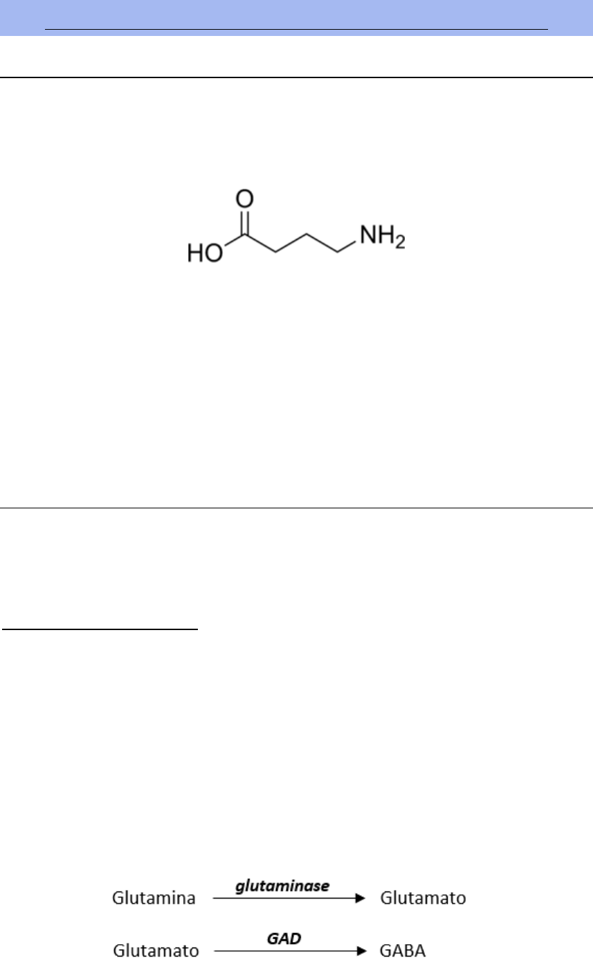 Ana Laura Octávio - TXXII BIOQUÍMICA DOS NEUROTRANSMISSORES GABAÉRGICOS INTRODUÇÃO - Os neurotransmissores gabaérgicos são os principais aminoácidos neuroativos inibitórios do SNC. - O neurotransmissor GABA (ácido γ-aminobutírico) é um aminoácido com quatro carbonos, com a C-γ ligado a um grupo amina. - Ele produz uma resposta inibitória através de uma alteração na condutância de um ou mais canais iônicos seletivos. - Os mamíferos expressam receptores de GABA, os quais diminuem a excitabilidade neuronal através de vários tipos de mecanismos. - De forma resumida, um dos mecanismos pode ser descrito como abertura de canais de K+ e de Cl-, a qual deixa o potássio sair e o cloreto entrar. Com isso, haverá uma hiperpolarização da membrana da célula (e diminuição da resistência da membrana). BIOSSÍNTESE DE GABA - A biossíntese de GABA ocorre no citoplasma dos neurônios e tem como moléculas percursoras a glutamina e o glutamato (aminoácido não essencial). Por essa razão, é essencial a disponibilidade de glutamato e glutamina para o neurônio produtor GABA. SEQUÊNCIA DE EVENTOS - Moléculas de glutamina entram no neurônio gabaérgico junto com íons Na+ através de um transporte simporte (dois componentes transportados para um mesmo lado da membrana) realizado pelo transportador SAT1. - No citoplasma do neurônio, a glutamina é convertida glutamato, por meio da ação da enzima glutaminase. - O glutamato serve de substrato para uma outra enzima, a descarboxilase de ácido glutâmico (GAD). Esta converte, finalmente, glutamato em GABA, liberando moléculas de CO2. Ana Laura Octávio - TXXII OBS.: Existe outra via para a biossíntese de GABA. Nela, a molécula percursora é o α- cetoglutarato, proveniente do ciclo de Krebs e a sequência de eventos se dá da seguinte maneira: GABA – ARMAZENAMENTO E LIBERAÇÃO - O GABA é sintetizado, a partir de glutamato, no citoplasma do neurônio. Após isso, é transportado no interior de vesículas secretoras para armazenamento e liberação. - Essas vesículas secretoras estão presentes na porção terminal dos axônios dos neurônios. - A entrada de GABA nas vesículas secretoras necessita de duas bombas moleculares separadas para acontecer: ▪ Uma ATPase de prótons para concentrar certa quantidade de íons H+ na vesícula (entrada de íons H+ contra o gradiente de concentração: transporte ativo). ▪ Um antiportador de prótons, chamado VGAT (transportador vesicular associado a membrana) que permite a saída dos íons H+ para fora da vesícula (a favor do gradiente de concentração) enquanto, ao mesmo tempo, efetua o transporte de GABA para dentro da vesícula, contra seu gradiente de concentração. OBS.: A proteína transmembrana é classificada como antiporte, uma vez que transporta duas diferentes moléculas para lados opostos da membrana. - Com as moléculas de GABA no interior das vesículas de secreção, a célula nervosa precisa receber um estímulo (P.A.) para fundir a vesícula em sua membrana e, assim, liberar a DA na fenda sináptica. SEQUÊNCIA DE EVENTOS - O neurônio recebe uma P.A., o que faz com que canais de Na+ se abram, despolarizando a membrana da célula. - Essa despolarização, desencadeia a abertura de canais de íons Ca2+ voltagem dependentes, presentes na membrana do neurônio. - Esses íons, quando presente no interior no neurônio, estimulam a liberação dos NT na fenda sináptica, uma vez que ativam proteínas snare, as quais fundem as duas membranas (a da vesícula com a do neurônio). - Realizado todos esses processos, o GABA é então liberada por exocitose. OBS.: ETAPAS DA NEUROTRNASMISSÃO Ana Laura Octávio - TXXII GABA – DESTINOS PÓS LIBERAÇÃO O neurotransmissor GABA, após ser liberado na fenda sináptica e exercer sua função, pode ter 3 destinos diferentes: ✓ Difundir-se para fora da fenda sináptica (p.ex. ligar-se ao receptor pós-sináptico). ✓ Ser recaptado pela célula pré-sináptica. ✓ Ser metabolizado por enzimas especificas situadas na fenda sináptica. I) RECAPTAÇÃO PELA CÉLULA PRÉ-SINÁPTICA - A maior parte do GABA liberado na fenda sináptica é transportado de volta a célula pré-sináptica através de uma bomba de recaptação, presente na membrana celular do neurônio, denominada GAT (transportador de GABA). - A GAT realiza um transporte simporte de GABA e íons Na+. - Como a recaptação da envolve o transporte do neurotransmissor contra o seu gradiente de concentração, esse processo requer uma fonte de energia. Por isso, o GAT acopla a recaptação de GABA com o cotransporte de Na+ ao longo de seu gradiente de concentração na célula. OBS.: Como o gradiente de Na+ é mantido pela bomba de Na+/K+-ATPase, a recaptação de GABA depende indiretamente da presença de uma bomba de Na+/K+ funcional. - Destinos do GABA após recaptação: ▪ RECICLAGEM – o GABA é internalizado novamente nas vesículas de secreção. ▪ METABOLIZAÇÃO – por enzimas específicas localizadas no citoplasma do neurônio. II) METABOLIZAÇÃO POR ENZIMAS ESPECÍFICAS - O término da ação do GABA na sinapse depende de sua remoção do espaço extracelular. - Os neurônios e a glia captam o GABA através de transportadores de GABA (GAT) específicos. - No interior das células, a enzima mitocondrial amplamente distribuída, a GABA- transaminase (GABA-T), catalisa a conversão do GABA em semialdeído succínico (SSA). - O semialdeído succínico (SSA) é oxidado em ácido succínico pela SSA desidrogenase (SSADH), entrando, a seguir, no ciclo de Krebs, onde é transformado em α – cetoglutarato. - A seguir, a GABA-T regenera glutamato a partir de α – cetoglutarato, através de uma reação anaplerotica. Esse α – cetoglutarato pode contribuir, posteriormente, na síntese de GABA. OBS.: Percebe-se que GABA-T participa de várias etapas do metabolismo do GABA. Essa enzima responde a maior quantidade de substrato, sendo, assim, responsável por 