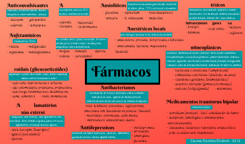 - metilfenidato - metilanfetamina - ritalina - anfetamina Ansiolíticos Fármacos Anticonvulsivantes - gabapentina - carbazepina Anfetamínicos Antipsicóticos - haloperidol - clorpromazina antigos - clozapina - sulpirida novos - fluoxetina - atracúrio - benzodiazepínicos - midozolan- diazepam - valproato convulsões, transtorno bipolar, insônia, emergências comportamentais, epilepsia tratamento de TDAH esquizofrenia, psicoses, AVE, insônia, síndrome de tourette transtorno de ansiedade generalizada, transtorno do pânico, fobias, TOC e estresse pós-traumático Analgésicos não-opióides: dores + fracas; associação: 2o recurso; opióides fracos: próximo recurso; opióides fortes; antagonistas: naloxona enaltrexona - alprazolam - h: nitrazepam - morfina - codeína - tramadol - paracetamol - dipirona Anestésicos intravenosos: para indução; inalatórios: manter anestesiados; pré-medicação: diminuir ansiedade e facilitar indução, diminuir dor, causa amnésia intravenosos gases - propofol - ketamina vapores - óxido nítrico - halotano - isoflurano Anti-inflamatórios esteroidais (glicocorticóides) inflamação e eventos decorrentes, asma, artrite reumatóide, edema cerebral relacionado à tumor - ação curta: hidrocortisona e cortisona - ação intermediária: prednisona, prednisolona - ação longa: betametasona e dexametasona - asma: salmeterol - rinite: mometasona Anti-inflamatórios não esteroidais analgésicos, anti-térmicos, anti-inflamatórios não esteroidais, dores brandas e agudas, febres, processos inflamatórios, prevenção de novos infartos - dipirona - tylenol (paracetamol) - advil, buscofem (ibuprofeno) citostático: detêm divisão celular; citotóxico :morte celular espontânea; poliquimioterapia: associação de fármacos; quimiorradioterapia: otimiza a radiação; adjuvante: suporte depois da intervenção principal; neoadjuvante (indução): antes da principal intervenção, diminuição do tumor ou sintomas Antineoplásicos - endoxan (ciclofosfamida) - mitomicina - anastrol e herceptin (fármacos hormonais) - citarabina e gentabina (antimetabólitos) - vimblastina e vincristina (alcalóides da vinca) - topotecana e irinotecana (camptotecina) - metronidazol: antibacteriano diverso - beta-lactâmicos: penicilinas, cefalosporinas, amoxicilina com clavulanato de potássio (clavulin) - macrolídios: eritromicina, azitromicina disseminação do processo bacteriano, sinais e sintomas indicativos de sepse, vigência de imunossupressão, antibioticoterapia inicial sem sucesso no combate da infecção Antibacterianos Anestésicos locais - aminoésteres: procaína, cloroprocaína e tetracaína para conseguir anestesia local, inibição da atividade - aminoamidas: lidocaína, mepivacaína (epidural) transtornos de humor depressivos, ansiosos, alimentares, ejaculação precoce, enurese infantil noturna Antidepressivos - tranilcipromina - fluoxetina - amitrofilina - iproniazida - divalproato, lamotrigina e carbamazepina: anticonvulsivantes - carbolitium (principal - lítio): estabilizador de humor transtorno bipolar Medicamentos transtorno bipolar - pode-se utilizar anti-histamínicos - olanzapina, clozapina e risperidona: antipsicóticos Eduarda Bianchini Brodbeck - XXIX