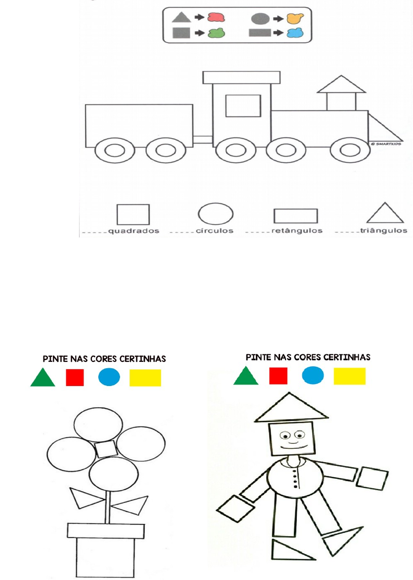 Atividades sobre as Formas Geométricas: 1- Quantas formas Geométricas você consegue encontrar na imagem abaixo, complete a quantidade nos espaços, e pinte de acordo com a legenda abaixo. Resposta: número 1: Quadrado: 2 Retângulo: 3 Círculo: 5 Triangulo: 2