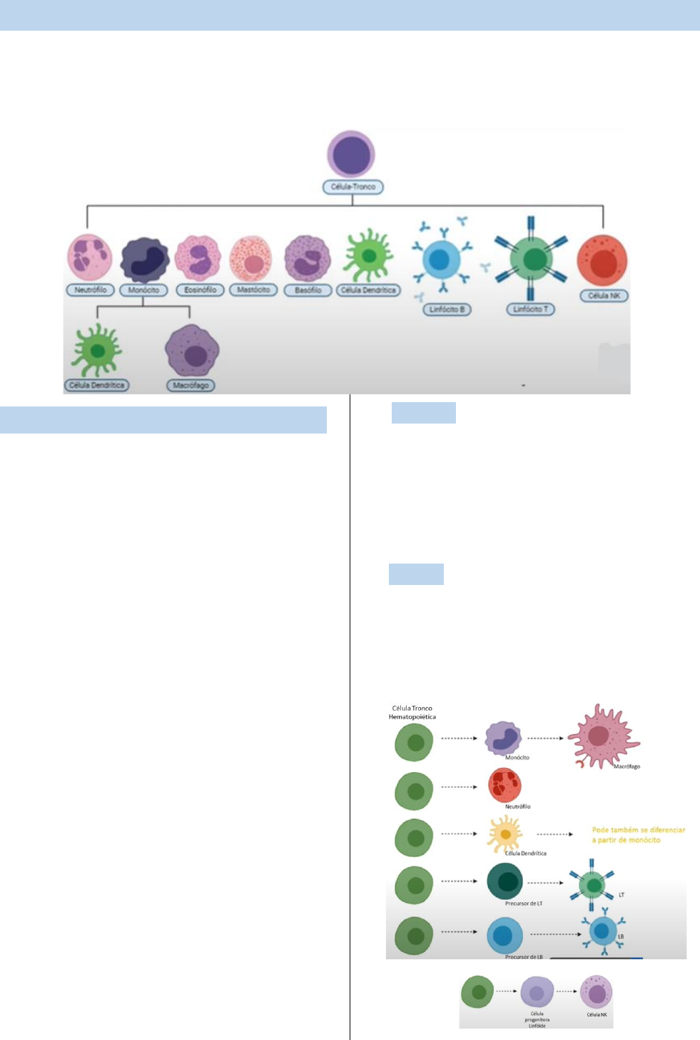 1 imunologia 28/05/2021 Células do sistema imunológico MEDULA ÓSSEA Na nossa medula óssea existem as células tronco hematopoiéticas, essas células podem se diferenciar em outras células dependendo do estimulo que ela receba. Pode por exemplo se transformar em monócito que ao adentrar ao tecido se transforma em macrófago; pode se transformar em neutrófilo; em uma célula dendrítica (que também pode ser gerada pela diferenciação de um monócito); em linfócito T; em linfócito D; em célula NK. As células tronco são localizadas na medula óssea que está dentro dos ossos chatos e longos (fêmur, esqueleto da pelve). Ela diferencia-se em medula óssea vermelha (grande quantidade de eritrócitos, hemácias, essa medula produz as células do sangue) e amarela (grande quantidade de células de gordura, ausência de células sanguíneas). Quando se inicia o processo de diferenciação da célula tronco ela pode se transformar em célula progenitora mieloide ou célula progenitora linfoide. A mieloide de acordo com o estímulo que recebe pode se diferenciar em megacariócito (que vai dar origem as plaquetas); eosinófilo; basófilo; hemácias (eritrócitos); monócitos (dá origem aos macrófagos e células dentríticas); neutrófilos, etc. A linfoide pode se diferenciar em uma célula precursora de linfócito T (depois de sofrer maturação da origem ao linfócito T); célula precursora de linfócito B (dá origem ao linfócito B, e mais tarde ao plasmócito); célula NK (Natural Killer). 2 Doação de medula óssea REDOME: registro nacional de doadores de medula óssea, banco de dados que cadastra os voluntários e busca pessoas que precisam de doação e que são compatíveis com o doador. O procedimento é simples, dura 90 minutos, faz-se uma anestesia peridural ou geral e a internação dura 24 horas. A doação também pode ser feita por aférese (doador usa medicação para aumentar número de células tronco circulantes, faz-se a coleta de sangue por aférese (aparelho separa células tronco e os demais elementos são devolvidos ao doador)). A medula do doador se recompõe em 15 dias. Principais células do sistema imunológico (Quantidade e eficiência) Macrófagos, Neutrófilos, Células dendríticas e linfócitos Todas as células do sistema imunológico derivam de células tronco presentes na medula óssea vermelha. A célula tronco se divide em célula progenitora mielóide e é essa que vai dar origem ao neutrófilo. 3 neutrófilos Os neutrófilos são leucócitos polimorfonucleares por apresentarem núcleo segmentado com 3 a 5 lóbulos conectados. É a maior população de leucócitos presentes no sangue, responsável por medir as etapas iniciais do processo inflamatório (primeira célula a chegar no sítio inflamatório para atacar o antígeno). A citosina que induz a célula progenitora mieloide a se transformar em neutrófilo, é o fator estimulador de colônia de granulócitos (G- CSF). Possui vida curta, circula na via sanguínea por apenas 6 horas, e se nesse intervalo de tempo ele for recrutado para os sítios de infecção, ele irá ao tecido e iniciará a ação contra o antígeno, se ele não for recrutado, morrerá por apoptose. Núcleo segmentado, lobulado, citoplasma rico em grânulos. Os mediadores quimiotáticos atraem os neutrófilos da corrente sanguínea para o tecido, citosina aumenta a permeabilidade vascular e o neutrófilo consegue se espremer para atravessar entre as células do vaso sanguíneo até chegar ao tecido. Presente no mesmo sítio, a célula atua na eliminação do antígeno. Pode usar 3 estratégias para combater: Fagocitose: assim como o macrófago e células dendríticas, o neutrófilo também expressa na sua membrana plasmática receptores de antígeno de baixa especificidade. Quando esse receptor se liga ao antígeno, o neutrófilo emite pseudópodes que englobam esse antígeno. Para eliminar o antígeno englobado junto com o receptor, essa vesícula fagossomica se funde a vários lisossomos formando fagolisossomo, onde os patógenos são mortos por enzimas proteolíticas, por espécies reativas de oxigênio e também de nitrogênio, degradando os patógenos em vários pequenos pedaços que serão depois apresentados ao linfócito T. Quando os neutrófilos e macrófagos são fortemente ativados, eles podem danificar os tecidos normais do hospedeiro por meio da liberação de enzimas lisossômicas de espécies reativas de oxigênio e também ácido nítrico, a ação dessas células provocam uma toxicidade para o tecido onde está acontecendo a inflamação. Degranulação: liberação no meio extracelular do conteúdo dos seus grânulos. Grânulos citoplasmáticos se fundem com a membrana plasmática liberando no meio extracelular todo seu conteúdo. São destacados dois tipos de grânulos existente no neutrófilo, os específicos (maior número no citoplasma e contém enzima lisozima, colagenase e elastase) e os azurófilos (são os lisossomos, estão em menor número, possuem enzimas como defensinas e catelicidinas) Formação de NETS: armadilhas extracelulares de neutrófilos. Consiste na liberação de conteúdo intracelular do neutrófilo formando uma rede extracelularmente, e esse conteúdo liberado é constituído não só pelo conteúdo dos grânulos citoplasmáticos, mas pela cromatina (material nuclear), forma-se uma espécie de rede que envolve o patógeno e como consequência o patógeno é eliminado. Algumas doenças podem estar relacionadas com a realização desse processo: autoimunes, câncer, doenças inflamatórias. Condições normais: 2.000 a 7.500/mm3 Condições patológicas: Neutrofilia (aumento de neutrófilos no sangue, por infecção, induzindo resposta inflamatória): >7.500/mm3 Neutropenia (diminuição de neutrófilos no sangue, comum em pacientes em quimioterapia ou com leucemia, predispõe o paciente para infecções oportunistas (bactérias e fungos)): <2.000/mm3 4 eusinófilos Eosinófilos as