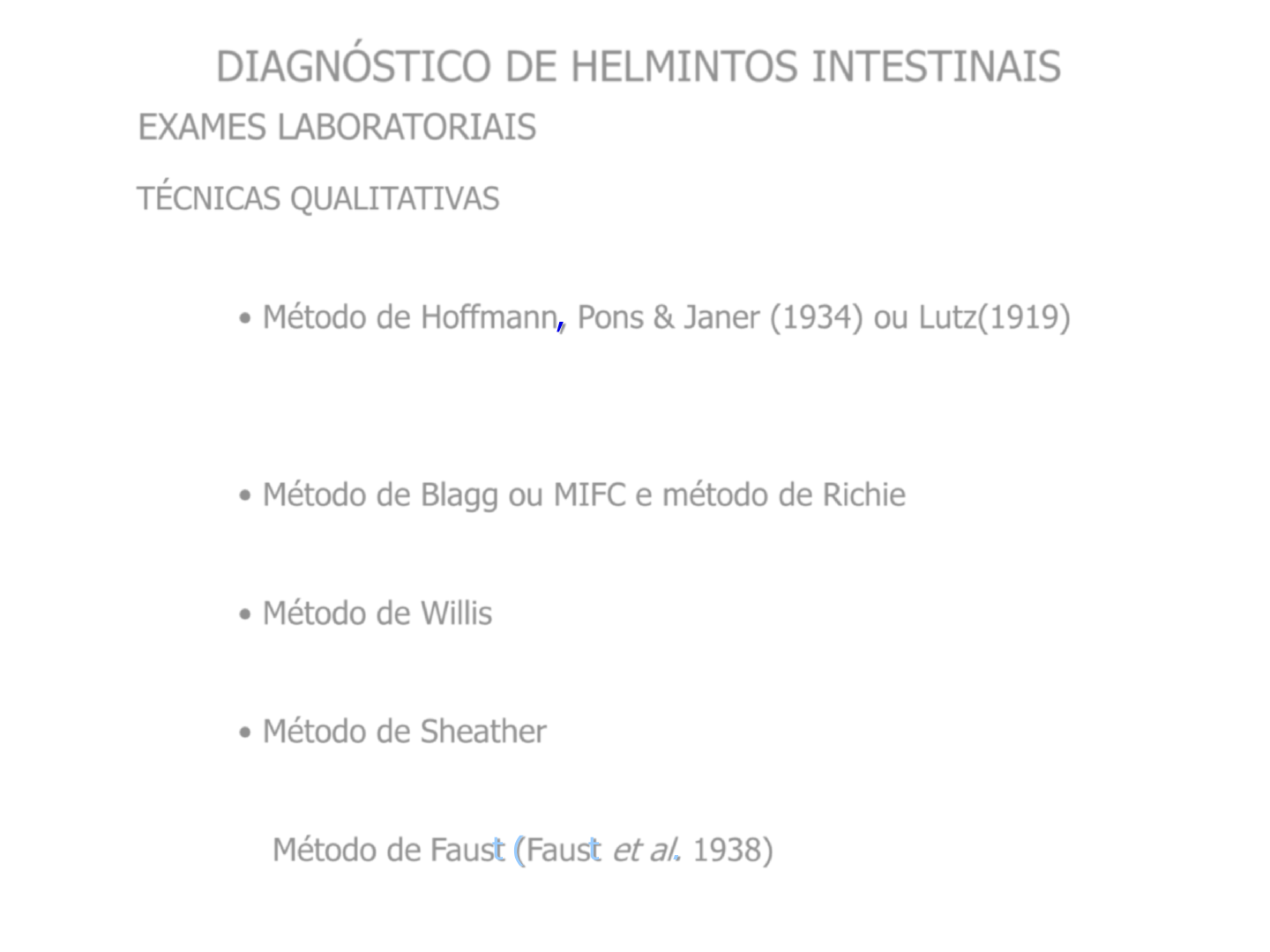 EXAMES LABORATORIAIS TÉCNICAS QUALITATIVAS • Sedimentação espontânea • Método de Hoffmann, Pons & Janer (1934) ou Lutz(1919) • Sedimentação por centrifugação • Sedimentação por centrifugação com éter • Método de Blagg ou MIFC e método de Richie • Flutuação com solução de sal • Método de Willis • Flutuação com solução de açucar • Método de Sheather • Flutuação em solução de Sulfato de Zinco • Método de Faust (Faust et al. 1938) DIAGNÓSTICO DE HELMINTOS INTESTINAIS TÉCNICA: - Colocar cerca de 2,5 g de fezes em um frasco de Borrel contendo 5 mL de água; - Triturar bem com um bastão de vidro. -Acrescentar aproximadamente 20 mL de água. - Filtrar a suspensão para um cálice de sedimentação de 100 mL através de gaze cirúrgica dobrada em quatro. - Os detritos contidos na gaze ou tela de nylon são lavados em mais 20 mL de água. -Deixar a suspensão do cálice em repouso por 1 a 24 horas. -Decantar o sobrenadante -Colher uma gota do sedimento, colocar entre lâmina e lamínula e examinar ao MO 10X a 40X. EXAMES PARASITOLÓGICOS DE FEZES SEDIMENTAÇÃO ESPONTÂNEA Método de Hoffmann, Pons & Janer (HPJ) ou Lutz EXAMES PARASITOLÓGICOS DE FEZES SEDIMENTAÇÃO POR CENTRIFUGAÇÃO SEDIMENTAÇÃO POR CENTRIFUGAÇÃO Método de Blagg ou MIFC e método de Richie EXAMES PARASITOLÓGICOS DE FEZES EXAMES LABORATORIAIS TÉCNICAS QUALITATIVAS • Sedimentação espontânea • Método de Hoffmann, Pons & Janer (1934) ou Lutz(1919) • Sedimentação por centrifugação • Sedimentação por centrifugação com éter • Método de Blagg ou MIFC e método de Richie • Flutuação com solução de sal • Método de Willis • Flutuação com solução de açúcar • Método de Sheather DIAGNÓSTICO DAS ENTEROPARASITOSES TÉCNICA: - Colocar 2 g de fezes num frasco de Borrel ou copo de plástico; - Misturá-las com uma solução saturada de NaCl, de maneira que a superfície do líquido atinja a borda superior do recipiente; -Colocar uma lamínula sobre a boca do tubo de ensaio e deixá-la nesta situação por 5 - 10 minutos. - Levantar a lamínula e coloca-la sobre uma lâmina; -Examinar em aumento médio todo o material obtido. (pode corar com lugol). FLUTUAÇÃO ESPONTÂNEA - MÉTODO DE WILLIS EXAMES PARASITOLÓGICOS DE FEZES ANIMAIS CRIADOS EXTENSIVAMENTE “A PASTO” DIAGNÓSTICO E CONTROLE DOS TRICOSTRONGILÍDEOS Filo Nematoda Classe Secernentea Ordem Strongylida Família Trichostrongylidae •Ovos de cápsula fina e expelidos segmentados. •A infecção ocorre pela ingestão de larvas infectantes. Gêneros: Haemonchus, Cooperia, Trichostrongylus e Ostertagia Responsáveis por alterações na absorção dos nutrientes, promovendo diarreia, desidratação e até morte CICLO DE ESTRONGILÍDEOS DE RUMINANTES Hemoncose DIAGNÓSTICO LABORATORIAL: Exame de fezes: •Pesquisa de ovos por sedimentação e/ou flutuação fecal. •Contagem de ovos nas fezes => Técnica de Gordon e Whitilock (1939) => OPG Coprocultura •Método de Harada & Mori Concentração de Larvas: •Baermann-Moraes ou Rugai CLÍNICO Sinais clínicos, produtivos e epidemiológicos EXAMES LABORATORIAIS TÉCNICAS QUANTITATIVAS •Técnica de Gordon & Whitlock modificada (OPG) DIAGNÓSTICO DAS ENTEROPARASITOSES Fazer a contagem nas duas áreas da câmara de MacMaster e multiplicar por 100 = OPG Área da câmara de MacMaster = 1,0 cm2 x 1,5mm MÉTODOS QUANTITATIVO MÉTODO DE GORDON & WHITLOCK (OPG) Técnica: -Pesar 2 g de fezes (bovinos, ovinos e caprinos); -Colocá-las em um copo de vidro; -Adicionar 58ml de solução saturada de NaCl; -Homogeneizar com um bastão de vidro e passá-la por um tamis; -Retirar uma alíquota e preencher um lado da câmara de McMaster, retirar outra alíquota e preencher o outro lado; -Aguardar de 1 a 2 minutos; -Examinar ao microscópio (foco nas microbolhas); -Fazer a contagem nos 2 lados da câmara; -Multiplicar o resultado por 100; -Resultado dado em OPG (ovos por grama de fezes); -Contar separadamente os ovos dos gêneros: Strongyloides, Nematodirus, Capillaria, Trichuris e Neoascaris. MÉTODO DE GORDON & WHITLOCK (OPG) Pesar 2 gramas de fezes Solução saturada de NaCl Adicionar 15 ml de água 45 ml de sol. Saturada de NaCl Homogeneizar e coar em gase MÉTODOS QUANTITATIVO MÉTODO DE GORDON & WHITLOCK (OPG) Homogeneizar e encher a câmara Preencher os dois lados da câmara Aguardar de 2 a 3 minutos Examinar ao MO no aumento de 10 (100X) MÉTODOS QUANTITATIVO MÉTODOS QUANTITATIVO Interpretação do OPG em Ruminantes (Ueno & Gonçalves, 1998) Hipoproteinemia e edema de barbela - Hemoncose Verminose em bezerros http://www.uff.br/diagmsv/index.php?option=com_content&view=article&id=66%3Averminose-em-bezerros&catid=39%3Asinais-clinicos-e-patogenia&Itemid=66 TÉCNICA DE DIAGNÓSTICO PARASITOLÓGICO • Coprocultura (Roberts & O’Sullivan (1950) DIAGNÓSTICO DAS ENTEROPARASITOSES Pesar 10-20 gramas de fezes Misturar com vermiculita Guardar em estufa de 26oC a 28oC por 7 dias. EXAMES LABORATORIAIS TÉCNICAS DE CONCENTRAÇÃO DE LARVAS • Método de Baerman & Moraes • Método de Rugai DIAGNÓSTICO DAS ENTEROPARASITOSES Métodos de Baerman-Moraes (A e B) Métodos de Rugai (C) MÉTODO DE BAERMANN & MORAES Colher 10g de fezes ou coprocultura Colocar em gaze dobrada em quatro. Colocar em funil com água a 45ºC DIAGNÓSTICO DAS ENTEROPARASITOSES TÉCNICAS PARASITOLÓGICAS DE EXAMES DE FEZES MÉTODO DE BAERMANN & MORAES Larva L3 Trichostrongylus axei Trichostrongylus sp. Tipo de cauda: CURTA e obtusa. Características: Porção anterior arredondada. Srongyloides Larvas de Srongyloides são mais delgadas, não possuem bainha, apresentam um longo esôfago cilíndrico e cauda bífida. Haemonchus sp. Tipo de cauda: MÉDIA Características: Porção anterior afiladacom sombreamento Cooperia ps. Tipo de cauda: MÉDIA Características: Porção anterior quadrada com dois corpos refringentes CONTAGEM DE OPG 18 ovos X 100 = 1.800 opg fezes COPROCULTURA BAERM