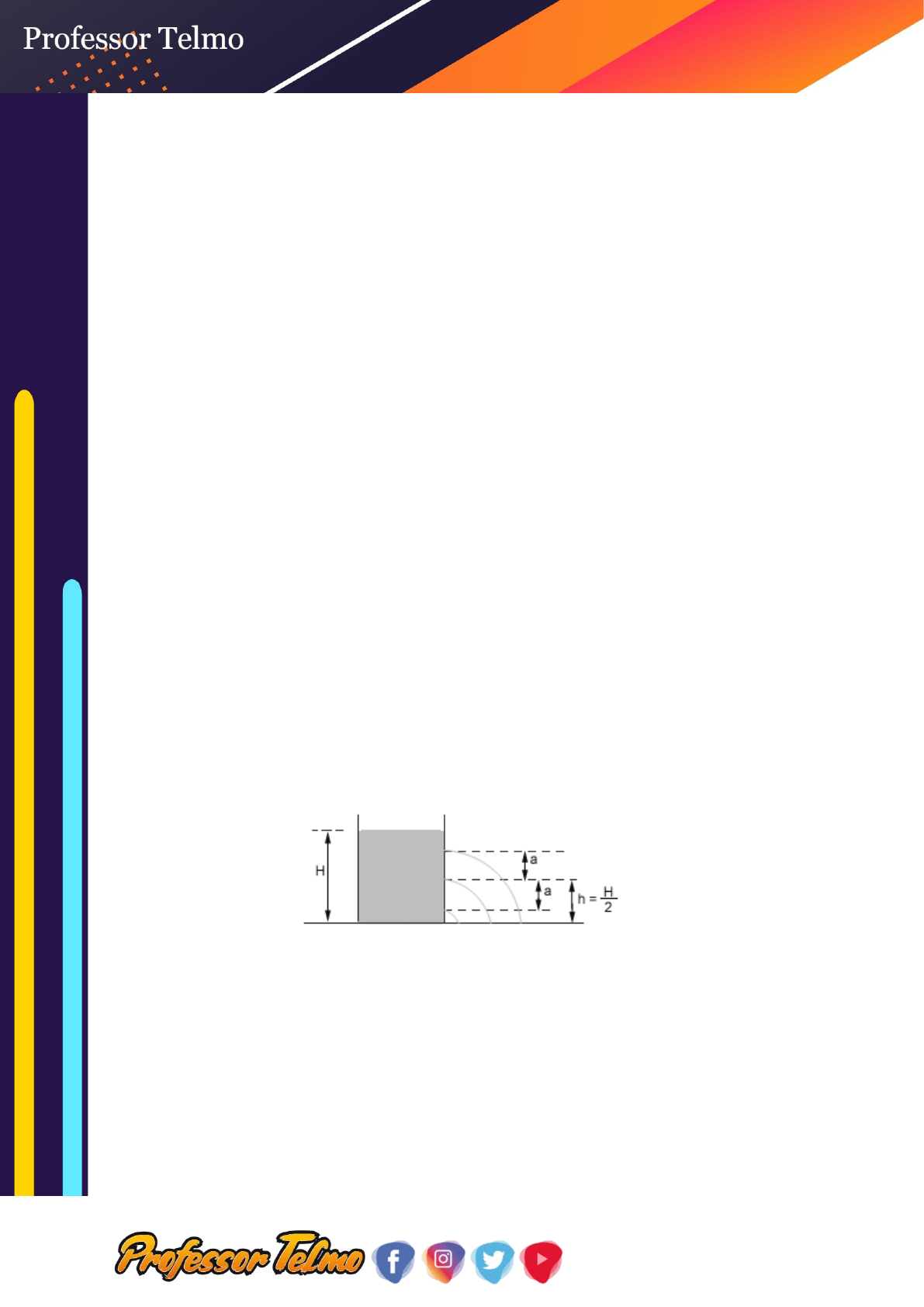 P á g i n a 1 | 3 HIDRODINÂMICA 1. (UFPA) Considere duas regiões distintas do leito de um rio: uma larga A, com 200 m2 de área de secção transversal, onde a velocidade escalar média da água é de 1,0 m/s, e outra estreita B, com 40 m2 de área de secção transversal. Calcule: a) a vazão volumétrica do rio. b) a velocidade escalar média da água do rio na região estreita B. 2. (UFPE) A velocidade do sangue na artéria aorta de um adulto, que possui em média 5,4 litros de sangue, tem módulo igual a aproximadamente 30 cm/s. A área transversal da artéria é de aproximadamente 2,5 cm2. Qual o intervalo de tempo, em segundos, necessário para a aorta transportar o volume de sangue de um adulto? 3. (Unicamp-SP) Uma caixa-d'água com volume de 150 litros coleta água da chuva à razão de 10 litros por hora. a) Por quanto tempo deverá chover para encher completamente essa caixa-d'água? b) Admitindo-se que a área da base da caixa é 0,50 m2, com que velocidade subirá o nível da água na caixa, enquanto durar a chuva? 4. (Olimpíada Brasileira de Física) A figura a seguir mostra uma caixa-d'água no chão com três furos de igual diâmetro por onde saem jatos de água. A figura, porém, não representa corretamente as posições onde os jatos atingiriam o chão. Explique o porquê e esboce (qualitativamente) onde eles deveriam cair. P á g i n a 2 | 3 5. (Unifesp) É comum vermos, durante uma partida de voleibol, a bola tomar repentinamente trajetórias inesperadas logo depois que o jogador efetua um saque. A bola pode cair antes do esperado, assim como pode ter sua trajetória prolongada, um efeito inesperado para a baixa velocidade com que a bola se locomove. Quando uma bola se desloca no ar com uma velocidade v e girando com velocidade angular em torno de um eixo que passa pelo seu centro, ela fica sujeita a uma força FMagnus = k.v. . Essa força é perpendicular à trajetória e ao eixo de rotação da bola, e o seu sentido depende da rotação da bola, como ilustrado na figura. O parâmetro k é uma constante que depende das características da bola e da densidade do ar. Esse fenômeno é conhecido como efeito Magnus. Represente a aceleração da gravidade por g e despreze a força de resistência do ar ao movimento de translação da bola. Considere o caso em que o saque é efetuado na direção horizontal e de uma altura maior que a altura do jogador. A bola de massa M segue por uma trajetória retilínea e horizontal com uma velocidade constante v, atravessando toda a extensão da quadra. Qual deve ser o sentido e a velocidade angular de rotação a ser imprimida à bola no momento do saque? P á g i n a 3 | 3 RESPOSTAS 1. a) 200 m3/s. b) 5,0 m/s. 2. 72 s. 3. a) 15 h. b) 2,0.10-2 m/h. 4. Para Dmáx Para e D1 = D2 5. Sentido anti-horário.