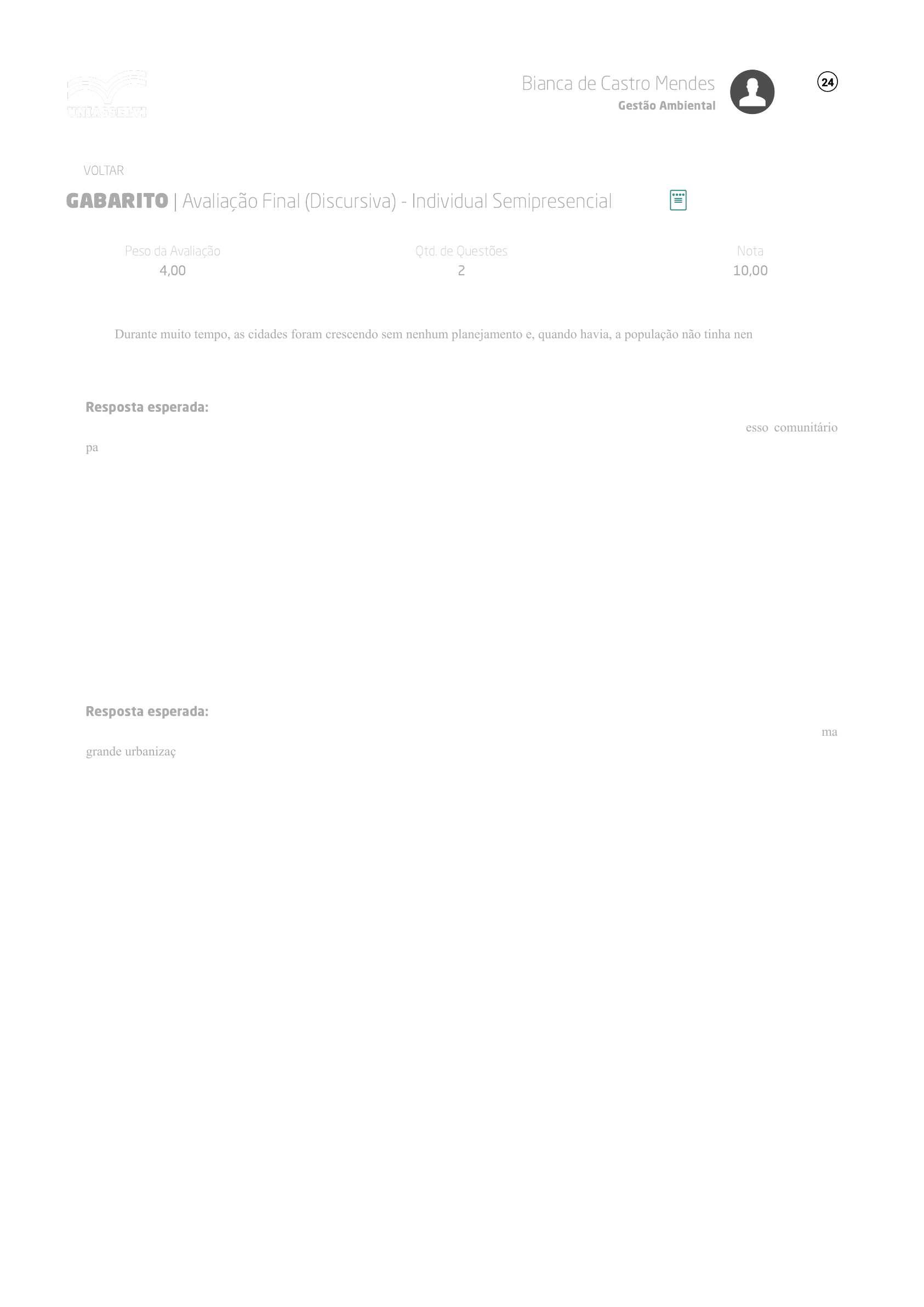 11/06/2021 AVA https://ava2.uniasselvi.com.br/subject/grades-and-tests/answer-book/eyJ0ZXN0Ijp7InRlc3RDb2RlIjoiNjcwMTc4IiwiZGVzY3JpcHRpb24iOiJBdmFsaWHn428gRmluYWwgKERpc2N1cnNpdmEpIC0gSW5kaXZpZHVhb… 1/1 GABARITO | Avaliação Final (Discursiva) - Individual Semipresencial Peso da Avaliação 4,00 Qtd. de Questões 2 Nota 10,00 Durante muito tempo, as cidades foram crescendo sem nenhum planejamento e, quando havia, a população não tinha nenhuma participação no processo. Por consequência, diversos erros eram cometidos. Com relação ao planejamento das cidades, disserte sobre a importância da participação popular nesse planejamento. Resposta esperada: *A participação popular é fundamental no processo de planejamento urbano. *Dentro desse aspecto, construir um processo comunitário participativo deve ser realizado a partir da escala do bairro, pois este é o local onde os moradores residem. *Dessa forma, os moradores podem opinar e participar das decisões que envolvem aspectos locais, pertinentes ao seu cotidiano. *Quem pode participar: pessoas com conhecimentos necessários para compreender os trabalhos e dar sugestões. *De que forma poderá ocorrer esta participação: audiências públicas, grupos técnicos etc. Toda atividade humana é potencialmente impactante no meio físico e biótico, seja no corte de uma árvore, até a devastação de uma floresta, a poluição de um rio, a poluição do ar etc. No entanto, as sociedades primitivas e modernas causaram impactos de intensidade bem diferentes, por motivos culturais e tecnológicos. Nesse contexto, Tofler (2007) divide a civilização humana em três grandes ondas de desenvolvimento. Descreva a causa do início da segunda onda de desenvolvimento da civilização humana. FONTE: TOFLER, Alvim. A terceira onda. Rio de Janeiro: Record, 2007. Resposta esperada: A segunda onda iniciou com a Revolução Industrial, pois foi quando o capital passou a ser o principal meio de produção, provocando uma grande urbanização e a diminuição da mão de obra agrícola. VOLTAR Alterar modo de visualização 1 2 Bianca de Castro Mendes Gestão Ambiental 24