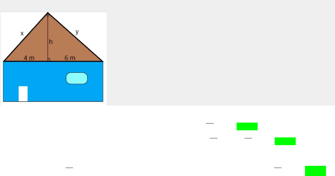 Ao longo da Unidade, verificamos que as razões trigonométricas são fundamentais para a resolução de diversos problemas do dia a dia das Engenharias. A figura a seguir representa a vista frontal de uma casa. O seu proprietário gostaria de instalar placas para geração de energia fotovoltáica nas duas águas do telhado e para isso precisa calcular o seu tamanho. Com o auxílio das razões trigonométricas, obtenha os valores de x, y e h. 𝐶 = 𝑎.𝑚 → 𝑋 = 10.4 → 𝑋 = 40 → 𝑋 = √40 → 𝑋 = 𝟔, 𝟑𝟐𝒎 𝐵 = 𝑎. 𝑛𝑋 = 10.4 → 𝑌 = 10.6𝑋 = 40 → 𝑌 = 60𝑋 = √40 → 𝑌 = √60 → 𝑌 = 𝟕,𝟕𝟓𝒎 𝐻: 𝑝𝑜𝑡𝑒𝑛𝑢𝑠𝑎 𝑌 = 𝐻 + 6 → √60 = 𝐻 + 36 → 60 = 𝐻 + 36 → 𝐻 = 60 − 36 → 𝐻 = 24 → 𝐻 = √24 → 𝐻 ≅ 𝟒, 𝟗𝟎𝒎