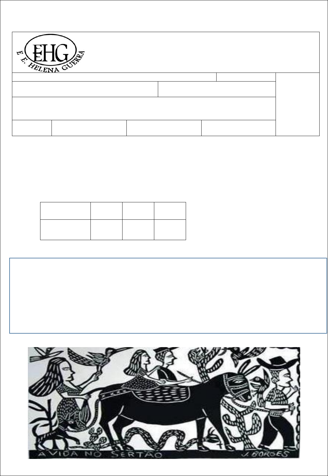 ESCOLA ESTADUAL HELENA GUERRA Criada pelo Decreto Nº. 5.742 de 13/01/1960 da S. E. E. de Minas Gerais Rua: Madre Margherita Fontanarosa, 271- Eldorado- Contagem – MG ATIVIDADE: Avaliação Bimestral – 1º Bimestre VALOR: 15,00 NOTA: ADAPTADO PELA PROFESSORA DE APOIO: MÁRCIA ABREU DISCIPLINA: ARTE ESTUDANTE: ANO: 2021 TURMA: 317 3º ano Ensino Médio DATA: 1º BIMESTRE / 2021 GABARITO No gabarito abaixo, escreva a letra correspondente a alternativa que escolhida como resposta para cada questão. QUESTÃO 01 02 03 RESPOSTA Esta Foto de Autor Desconhecido está licenciado em CC BY As gravuras talhadas em madeira (imburana, cedro ou pinho) possibilitaram aos artistas populares o domínio de todo o processo de edição dos folhetos. Os desenhos acompanham o conteúdo do folheto. A simplicidade das formas, as cores chapadas, a presença de motivos, paisagens e personagens nordestinas, transportam os leitores para o mundo da fantasia, imprimindo aos reis e rainhas, criaturas fantásticas e sobrenaturais, características que se aproximam do universo de experiências dos leitores. 1-De acordo com a Xilogravura, isto é, gravura talhada em madeira assinale a alternativa que corresponde a uma xilogravura: A) B) ) C) 1. O texto acima refere-se a uma apresentação musical de ópera, marque a opção correspondente. A) ( ) B) ( ) C) ( ) É uma apresentação musical, mas também é uma apresentação cênica. A apresentação musical é composta de recitativos, árias, coro, muitas vezes acompanhadas de balé. As falas são cantadas e as vozes dos cantores recebem uma classificação específica. Barroco é o nome de um estilo de época surgido no final do século XVI, na Itália, e caracterizado por forte influência religiosa, devido ao contexto histórico marcado pela Reforma Protestante e pela Contrarreforma. 3- Os Doze Profetas é um conjunto de esculturas em pedra-sabão feitas entre 1794 a 1804 (Antônio Marcos Lisboa, mais conhecido como Aleijadinho), localizadas no Santuário do Bom Jesus de Matosinhos, no Município de Congonhas. Marque a alternativa CORRETA : A) B) C) ESCOLA ESTADUAL HELENA GUERRA Criada pelo Decreto Nº. 5.742 de 13/01/1960 da S. E. E. de Minas Gerais Rua: Madre Margherita Fontanarosa, 271- Eldorado- Contagem – MG ATIVIDADE: Avaliação Bimestral – 1º Bimestre VALOR: 15,00 NOTA: DISCIPLINA: BIOLOGIA 1º BIMESTRE / 2021 GABARITO No gabarito abaixo, escreva a letra correspondente a alternativa que escolhida como resposta para cada questão. QUESTÃO 01 02 03 RESPOSTA Ciclo celular é o nome dado às diversas modificações que ocorrem em uma célula, desde o seu surgimento até a sua divisão em duas células-filhas. A interfase e a mitose constituem as principais fases do ciclo celular. 01) A ilustração abaixo representa as fases da divisão celular de uma célula, marque a opção correta: A) ( ) B) ( ) C) ( ) O Reino Plantae é extremamente importante ecologicamente falando, pois toda a energia química que os seres vivos tem acesso, vem das plantas, toda a vida na terra é sustentada pelas plantas, algas, fitoplanctos e cianobactérias, devido a fotossíntese e os fungos, por sua vez, são degradadores da natureza e sua principal importância está no fato de contribuírem para reciclagem de nutrientes para o ambiente. 2 Fungos e o ambiente essas espécies apresentam papel ecológico importante, atuando, por exemplo, com bactérias, no processo de decomposição e outras são responsáveis por desencadear doenças no nosso corpo. Como representantes conhecidos dos fungos, podemos citar os mofos, bolores e cogumelos. Os fungosnão possuem clorofila, como as plantas, por isso não podem realizar fotossíntese, e consequentemente, não produzem seu proprio alimento. Dentre os tipos mais consumidos e produzidos, destacam-se o champignon de Paris. ( Podem se comer, exemplo nas saladas etc.) 3- Em relação aos fungos marque a alternativa correta. A) ( ) Não podemos comer o cogumelo champignom de Paris. B) ( ) Fungos são incapazes de produzir seu próprio alimento, diferentemente das plantas. C) ( ) Podemos comer alimentos mofados, porquê não fazem mal a nossa saúde. 4- Posso comer o pedaço bom que não está com mofó?Faça um X, Nos alimentos mofados Todos os mofos têm “raízes” que invadem os alimentos, de acordo com o USDA, embora só seja possível ter uma parte mais externa na superfície dos alimentos. Por isso, o ideal é jogar fora toda a comida que já começou a mofar, mesmo que o mofo seja aparente só em algumas partes. A) ( ) B) ( ) https://brasilescola.uol.com.br/biologia/bacterias.htm https://brasilescola.uol.com.br/biologia/decomposicao.htm ESCOLA ESTADUAL HELENA GUERRA Criada pelo Decreto Nº. 5.742 de 13/01/1960 da S. E. E. de Minas Gerais Rua: Madre Margherita Fontanarosa, 271- Eldorado- Contagem – MG ATIVIDADE: Avaliação Bimestral – 1º Bimestre VALOR: 15,00 NOTA: DISCIPLINA: LÍNGUA PORTUGUÊSA 1º BIMESTRE / 2021 GABARITO No gabarito abaixo, escreva a letra correspondente a alternativa que escolhida como resposta para cada questão. QUESTÃO 01 02 RESPOSTA Leia o texto abaixo: 1- As redes sociais são espaços de comunicação e interação on-line que possibilitam o conhecimento de aspectos da privacidade de seus usuários. Responda as questões corretamente: Você gosta de acessar as redes sociais? A) ( ) Sim, com frequência B) ( ) Sim, raramente C) ( ) Não gosto, de redes sociais. Marque a imagem , que corresponde as redes sociais. A) ( ) B) ( ) 2- Qual dessas redes sociais, você costuma, utilizar com mais frequência? Circule a que você mais utiliza, no dia a dia. O anúncio publicitário (ou simplesmente publicidade) é um gênero textual que promove um produto ou uma ideia sendo veiculado pelos meios de comunicação de massa: jornais, revistas, televisão, rádio e internet. De acordo com as funções da linguagem, os anúncios publicitários são textos que apresentam a função conativa ou apelativa, que por s