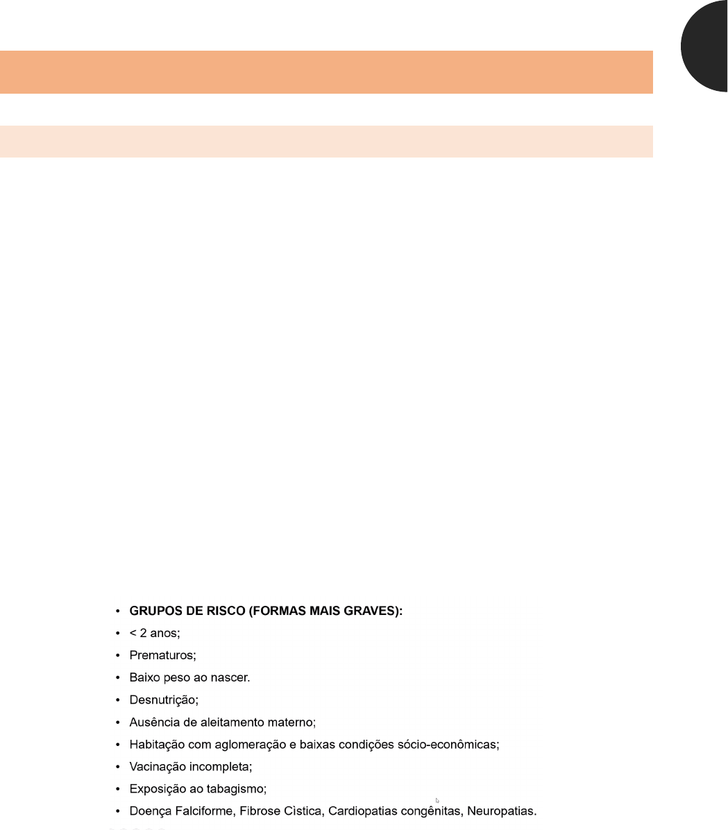 40 Infecção das Vias Aéreas Inferiores (IVAI) Pneumonia Adquirida na Comunidade (PAC) Inflamação do tecido pulmonar, principalmente causada por agente infeccioso, causando alteracao na ventilacao, aprisionamento aereo, aumentando a resistencia vascular. Anamnese Idade do paciente (para diferenciar a etiologia) Evolucao dos sintomas Contactantes Vacinacao Historia pregressa Grupo de risco e comorbidades Historia socioeconomica Etiologia à Conhecer o perfil etiologico da regiao à Viral: Influenza (vacinacao anual) à S aureus: quadros mais graves ou empiema à Mycoplasma pneumoniae; Clamydia pneumoniae > 5 anos 41 Viral: coriza, febre baixa, quadro insidioso, sibilancia vacina Influenza – virus fracionado, inativado Bacteriana: subito, febre alta, prostracao, creptacoes finas fixas localizadas ou reducao dos sons resp, taquicardia disproporcional a febre, dor abd, hipoxemia, sintomas sistemicos associados Sinais e Sintomas - Taquipneia 42 - Esforco respiratorio (video) Diagnóstico Clinico! Rx – só em sinais de gravidades e interncacao; fase inicial o rx ta normal Fazer o rx em toda crianca que vai internar (basal); falha na resposta ao tratamento ou diag diferencial PA e Perfil 43 44 USG toracica – detecta consolidacoes e derrames Pacientes internados: PCR, VHS, Hemograma: valores elevados indicam quadro bact Hemocultura – busca do agente etiologico Pesquisa viral Quando internar? - sinais clinicos de gravidade: tiragem subcpstal e sinais de dificuldade respiratoria; cianose SpO2 < 92%; taquipneia importante, derrame pleural - enchimento capilar lento - dificuldade de ingerir liquidos; vomitos; desidratacao - fatores de risco - capacidade dos responsaveis em cuidar da crianca (internacao social) TTO Ambulatorial Empírico à etiologia por faixa etaria escolha de ATB . 2m – 5a : Pneumococo : Amoxicilina 50 mg/kg/dia de 8/8h por 10 dias Se houver falha: Amox + Clavulanato 90mg/kg/dia . > 5 anos : Pneumococo. quadro atipico à macrolideo (Amox) Se falha associar a macrolideo 45 . MACROLIDEO = Eritromicina 6/6h (muito efeito adverso gastroinntestinal) , Claritromicina (caro), Azitromicina (10mg/kg/dia 1x/ dia por 5 dias) Reavaliacao agendada após 48-72h após inicio do tto TTO Hospitalar com intolerancia a V.O. - Ampicilina - Penicilina C TTO Hospitalar - Ceftriaxona (100mg/kg/dia) Dar alta: após 24 a 48h afebril e estavel à passar para ATB oral. Complicacoes Febre, tosse, dispneia, intolerancia a exs, inapetencia - Derrame pleural: dor pleuritica à deitado sobre o lado acometido para imobilizar o hemitorax envolvido para promover analgia temporaria Clinica: Cianose, diminuicao da expansibilidade, So2<92%, ausencia ou reducao de murmurios versiculares, febre que não melhora. 46 Transudato x Empiema (com bact) Fase exudativa à fase purulenta à fase de organizacao Exames: Rx – fazer em decubito lateral ;da para ver ate 50ml(obs – paciente deitado liquido escorre atras do pulmao); USG torax para estimar volume ; TC para Dx diferencial ou complicacoes 47 Dreno: 10% de derrame; colocar entre o 3 e 4 EIC na LAM TTO: ATB para PAC de 4 a 6 semanas; S pneumoniae + comum Bronquiolite ( Virus sincirstial Respiratorio) 1º episodio de sibilancia em lactente < 12 meses de idade Muito comum ! Congestão nasal, rinorreia clara, febre baixa 48 Sintomas IVAI: tosse, taquipneia, esforco respiratorio (gemencia, batimento aleta nasal, retracoes na costela), creptacoes finas inspiratorias, sibilos expiratorios, apneia FR: cardiopatia congenita, displasia broncopulmonar da prematuridade, prematuro, imunodeficiencia, baixa concentracao de anticorpos materno, poluicao Evolucao clinica e fisiopatologia: 1. Periodo de incubacao: 4 a 6 d 2. Congestao nasal, rinorreia clara, febre, irritabilidade, inapetencia 3. 2 a 3d após sintomas trato superior – 1/3 acomete trato inferior 4. Inflamacoes bronquiolos à aprisionamento de ar à aumento do esforco respiratorio Criterios de Internacao: Apneia ou cianose, hipoxemia, esforco respiratorio moderado a grave, FR>70, taquicardia persistente > 180bpm, letargia ou agitacao excessiva, desidratacao ou indisponibilidade de via oral, fator de risco. 49 Diagnóstico: Tratamento Para todos: Nutricao/ Hidratacao VO, SNG ou EV Soro Nasal 0,9% Se sat < 92%: cateter nasal com oxigenio UTI: suporte não invasivo e ventilacao mecanica 50 Tratamento com Beta 2 inalatório: prova terapêutica Não recomendado de rotina Palivizumabe – utilizado para um grupo especifico (usar antes do periodo sazonal) (neutralizante) Asma Inflamacao cronuca das vias aereas Chiado no peito Sibilancia de alergias Natureza multifatorial Diagnóstico Clínico História de sibilância, tosse, desconforto respiratório, despertares noturnos recorrentes Melhora com broncodilatador por via inalatoria Exames Complementares Espirometria – maiores de 5 a Resposta ao beta 2 – prova Pico do flux expiratorio (peak flow – aparelho portatil) Teste Alergico 51 Exacerbação/ crise: Deteriorizacao aguda dos sintomas, suficiente para causar angustia, risco a saude, necessidade do uso de corticoides sistemicos Sintomas: IVAS, aumento de sibilancia, respiracao mais curta, piora da tosse, durante o sono, reducao a tolerancia de exercico. Anamnese: hiposxemia, taquipneia, esforco resp, desidratacao, tempo expiratorio prolongado, sibilos expiratorios Broncodilatador de curta duração: inicio de acao < 4minutos Ataque de beta 2 à Salbutamol. 2 a 6 jatos. Fenoterol: ate 10 gotas Associar o atrovent: relaxamento na musculatura bronquica Usar corticoide sistemico: prednisolona 52 TTO Profilatico