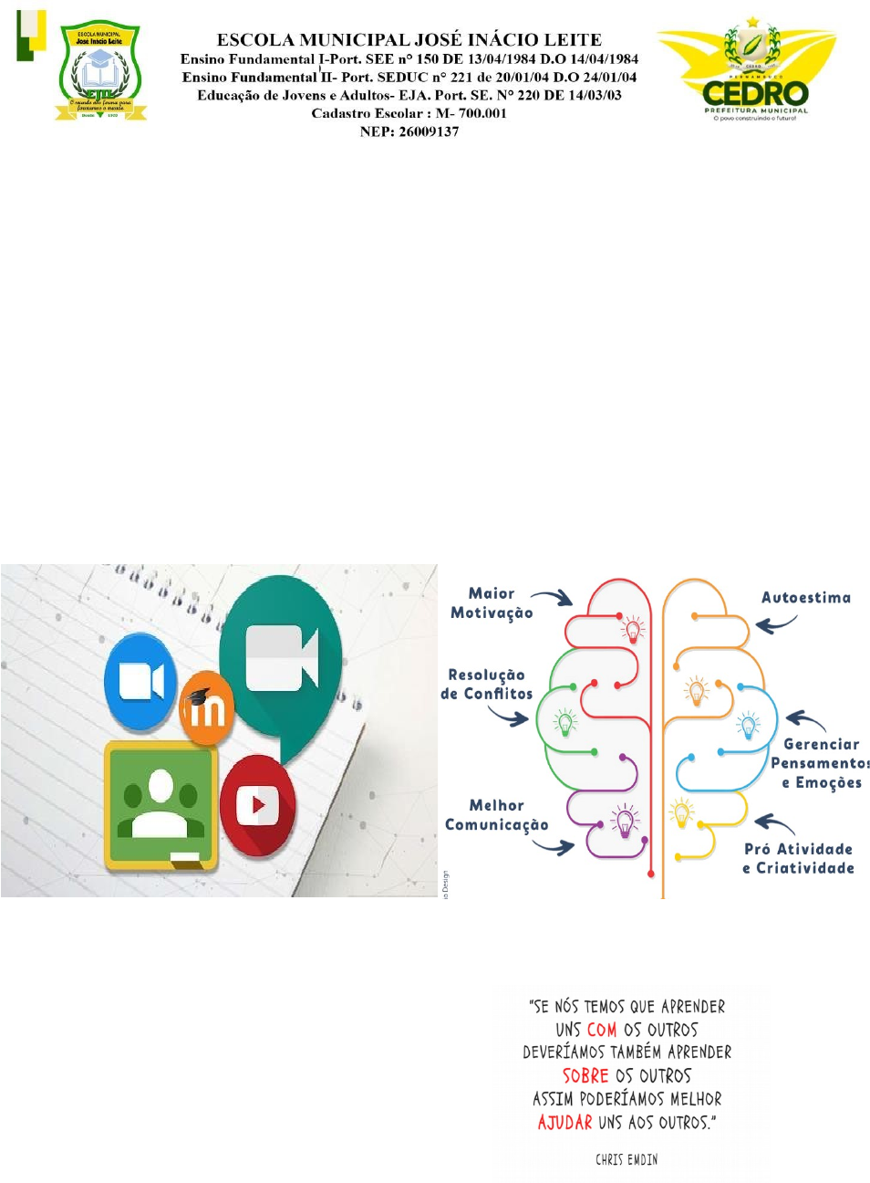 PROJETO TEMA: Ressignificação socioemocional por meio da leitura e escrita com uso das tecnologias disponíveis. CEDRO – PE 2021 JUSTIFICATIVA Percebemos que o cenário atual vem afastando cada vez mais nossos estudantes do ato de ler. Sabemos também que a leitura é um hábito fundamental para formação dos estudantes, portanto faz-se necessário que a escola busque estratégias para resgatar o ato e o prazer pela leitura. Considerando também que o estudante precisa envolver-se em atividades que despertem o interesse pelas habilidades e competências socioemocionais em suas transformações, mesmo que a princípio seja de forma remota, proporcionando oportunidades para a observação dos acontecimentos a sua volta, favorecendo seu crescimento intelectual e o envolvimento no mundo social. Este projeto foi elaborado com o intuito de garantir aos estudantes e a toda comunidade escolar a continuidade do acesso à leitura e aos livros mesmo que de forma virtual, garantindo o processo de ensino aprendizagem, utilizando os recursos digitais e tecnológicos na vivencia deste projeto em decorrência da Pandemia mundial do Covid-19. No início do Ensino Fundamental a criança desenvolve a capacidade de representação, sendo esta capacidade indispensável para a aprendizagem da leitura, conceitos matemáticos básicos e compreensão da realidade que a cerca, e é neste período em que se deve intensificar o ensino aprendizagem e as normas da conduta social. É também durante a etapa da escolarização obrigatória que os alunos entram na puberdade e se tornam adolescentes, passando por grandes transformações biológicas, psicológicas, sociais e emocionais. Portanto os professores e a gestão escolar precisam estar atentos a essas mudanças e assim buscarem novas formas de trabalhar pedagogicamente e de dialogar com os alunos, de forma compatíveis com suas idades. Outro fator a ser considerado é que tanto as crianças quanto os adolescentes são expostos várias horas por dia à televisão, desenvolvendo formas de expressão mais conectadas ao mundo das imagens, vícios de linguagem e aos termos internetês, tornando assim difícil o trabalho com a linguagem culta e a escrita normativa. Expostos incessantemente à mídia, também faz com que os jovens desenvolvam uma visão de mundo fragmentada, que faz com que os acontecimentos sejam banalizados e os jovens se tornem indiferentes aos problemas humanos e sociais. Quanto ao educador, seja em sua rotina diária ou profissional, como também em outras situações de sua vida, são desencadeados momentos de alto estresse atingindo a sua saúde mental, dificultando a adoção de estratégias de autorregulação, autocuidado para atuar como fator de proteção e assim desenvolver a capacidade de gerenciar suas emoções e potencias para enfrentar situações diversas e adversas. Foi com este pensamento que desenvolvemos esse projeto, e por meio das mídias e instrumentos tecnológicos, uma forma de lidar com os sentimentos, compartilhar experiências, acolher e dar aquele abraço, ainda que de forma virtual, possibilitando uma troca positiva por meio de mensagens, textos, vídeos e livros, ampliar nosso olhar para momentos simples, mas repletos de bons desejos para nós e para o mundo, possibilidades de reflexão acerca dos nossos sentimentos e das nossas ações. Com fé em Deus, determinação e persistência sairemos desta experiência com a certeza de que devemos continuamente praticar o bem, a solidariedade e a empatia, reafirmando nosso compromisso com o mundo e com nós mesmos. OBJETIVOS Objetivo geral Motivar crianças, jovens adolescentes no processo de letramento e no desenvolvimento das habilidades leitoras e emocionais em tempos de pandemia com o apoio da família; despertando o prazer, o interesse, o senso crítico como também o gerenciamento das habilidades socioemocionais, hoje tão fragilizado no meio educacional. Objetivos específicos · Envolver a família, professores e gestão escolar nas práticas de leituras nas aulas remotas e/ou presencial; · Possibilitar o acesso a diversos tipos leituras; · Possibilitar a vivência de emoções, o exercício da fantasia e da imaginação mesmo de forma remota; · Motivar o interesse pela leitura e escrita; · Resgatar a atenção da família para a criança; · Conscientizar a família da importância do acompanhamento nas aulas remotas; · Promover a socialização entre a comunidade escolar, professores e gestão escolar; · Possibilitar ao estudante a manifestação de suas habilidades e competências; · Resgatar valores familiares e cívicos por meio de homenagens e apresentações; · Sensibilizar o estudante para a prática de atividades lúdicas e histórias como forma de ampliar o conhecimento; · Exercitar a empatia, o diálogo, a resolução de conflitos e a cooperação, fazendo-se respeitar e promovendo o respeito ao outro e aos direitos humanos, com acolhimento e valorização da diversidade de indivíduos e de grupos sociais, seus saberes, identidades, culturas e potencialidades, sem preconceitos de qualquer natureza; · Agir pessoal e coletivamente com autonomia, responsabilidade, flexibilidade, resiliência e determinação, tomando decisões com base em princípios éticos, democráticos, inclusivos, sustentáveis e solidários; · Proporcionar aos professores momentos de uma abordagem e aprendizado socioemocional, baseada no autocuidado, no autogerenciamento, no controle do estresse e a serem mais resilientes. METODOLOGIA As atividades serão realizadas no decorrer do ano letivo de 2021 no aconchego do seu lar e/ou escola, com metodologias diversificadas e adaptadas de acordo com cada modalidade e com momento que estamos vivendo (Pandemia do Covid-19), atendendo as diferentes áreas do conhecimento, abordando temáticas de acordo com as datas comemorativas mês a mês, no fundamenta I e no fundamental II com a interação da comunidade escolar, professores e 