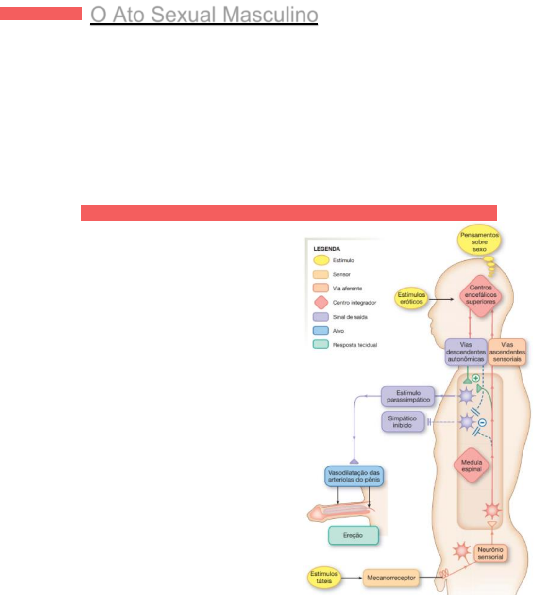 BMF3 O Ato Sexual Masculino As funções reprodutoras masculinas podem ser divididas em três grandes subdivisões: (1) espermatogênese, que significa a formação do espermatozoide; (2) desempenho do ato sexual masculino; e (3) regulação das funções reprodutoras masculinas por vários hormônios. Associados a essas funções reprodutoras estão os efeitos dos hormônios sexuais masculinos nos órgãos sexuais acessórios, metabolismo celular, crescimento e outras funções do organismo. Resposta sexual humana masculina: Excitação: ereção. Platô: intensificação de mudanças iniciadas na excitação. Orgasmo (clímax): emissão e ejaculação. Resolução: retorno das mudanças fisiológicas das três primeiras fases. EREÇÃO PENIANA A fonte mais importante de sinais sensoriais neurais para iniciar o ato sexual masculino é a glande do pênis. A glande contém um sistema de órgãos terminais sensoriais especialmente sensível que transmite modalidade especial de sensação, chamada sensação sexual, para o sistema nervoso central. A massagem da glande estimula os órgãos terminais sensoriais, e os sinais sexuais, por sua vez, cursam pelo nervo pudendo e, então, pelo plexo sacral para a região sacral da medula espinal, finalmente ascendendo pela medula para áreas não definidas do cérebro. SENSAÇÃO SEXUAL – nervo pudendo → plexo sacral → medula espinal sacral → ascensão pela medula → cérebro. Estímulos psíquicos apropriados podem aumentar, consideravelmente, a capacidade de a pessoa realizar o ato sexual. O simples pensamento em sexo, ou mesmo sonhar que está participando de relação sexual, pode iniciar o ato sexual masculino, culminando com a ejaculação. A ereção peniana é o primeiro efeito do estímulo sexual masculino, e o grau de ereção é proporcional ao grau de estimulação, seja psíquico ou físico. A ereção é causada por impulsos parassimpáticos que passam da região sacral da medula espinal pelos nervos pélvicos para o pênis. Mecanismo da ereção Essas fibras nervosas parassimpáticas, ao contrário da maioria das outras fibras parassimpáticas, parecem liberar óxido nítrico e/ou peptídeo intestinal vasoativo, além da acetilcolina. O óxido nítrico ativa a enzima guanilil ciclase, causando maior formação de monofosfato cíclico de guanosina (GMPc). O GMPc, em especial, relaxa as artérias do pênis e as malhas trabeculares das fibras musculares lisas no tecido erétil dos corpos cavernosos e corpos esponjosos na haste do pênis. Quando os músculos lisos vasculares relaxam, o fluxo sanguíneo para o pênis aumenta, causando a liberação de óxido nítrico das células endoteliais vasculares e posterior vasodilatação. A ativação do sistema nervoso parassimpático promove um estímulo para as células endoteliais para a produção do óxido nítrico, além disso as próprias terminações nervosas dos neurônios parassimpáticos promovem a secreção da acetilcolina para estimular as células endoteliais e fazem a produção de baixa parcela de oxido nítrico auxiliando a vasodilatação. O oxido nítrico adentra na musculatura lisa dos corpos cavernosos pela membrana celular, ativando a enzima guanilato ciclase para conversão do GTP (guanosina trifostato) em GMP cíclico (guanosina monofosfato cíclica) formando um segundo mensageiro, o qual proporciona mudanças intracelular, com destaque para a redução da quantidade de cálcio intracelular desencadeando uma incapacidade da ligação do cálcio com a calmodulina tendo como consequência o relaxamento da musculatura lisa dos corpos cavernosos com a geração da ereção. O aumento da taxa de GMP cíclico intracelular promove a ativação gradativa da enzima fosfodiesterase-5 para a quebra o GMP cíclico na sua forma inativa de maneira gradativa para ocorrer o processo de flacidez peniana. Inibidores da PDE5: é importante o conceito de que esses inibidores da PDE5 não são indutores de ereção, mas sim facilitadores, desde que na presença de estímulo sexual. Atualmente, quatro potentes inibidores da PDE5 estão liberados pela Agência Nacional de Vigilância Sanitária (ANVISA) para consumo no Brasil: • sildenafila (Viagra®); • tadalafila (Cialis®); • vardenafila (Levitra®, Vivanza®); • Iodenafila (Helleva®). Fases do processo de ereção LUBRIFICAÇÃO Os impulsos parassimpáticos durante a estimulação sexual, além de promover a ereção, induzem a secreção mucosa pelas glândulas uretrais e bulbouretrais. Esse muco flui pela uretra, auxiliando a lubrificação durante a relação sexual. Entretanto, a maior parte da lubrificação do coito é fornecida pelos órgãos sexuais femininos, muito mais do que pelos masculinos. Sem lubrificação satisfatória, o ato sexual masculino dificilmente é satisfatório, porque o intercurso não lubrificado produz sensações dolorosas e irritativas, que inibem as sensações sexuais, em vez de excitá-las. EMISSÃO E EJACULAÇÃO A emissão e a ejaculação são o clímax do ato sexual masculino. Quando o estímulo sexual fica extremamente intenso, os centros reflexos da medula espinal começam a emitir impulsos simpáticos, que deixam a medula, pelos níveis T-12 a L-2, e passam para os órgãos genitais por meio dos plexos nervosos simpáticos hipogástrico e pélvico, iniciando a emissão precursora da ejaculação. A emissão começa com a contração do canal deferente e da ampola, promovendo a expulsão dos espermatozoides para a uretra interna. Em seguida, as contrações da camada muscular da próstata, seguidas pela contração das vesículas seminais, expelem os líquidos Fosfodiesterase-5 (PDE5) Enzima responsável pela degradação das formas biologicamente ativas de guanosina monofosfato cíclico (GMPc) e de adenosina monofosfato cíclico (AMPc), em moléculas inativas de GMP e AMP. Hormônios: Ocitocina- estímulo positivo sexual / prolactina – inibitório. Testosterona - aumento da lib