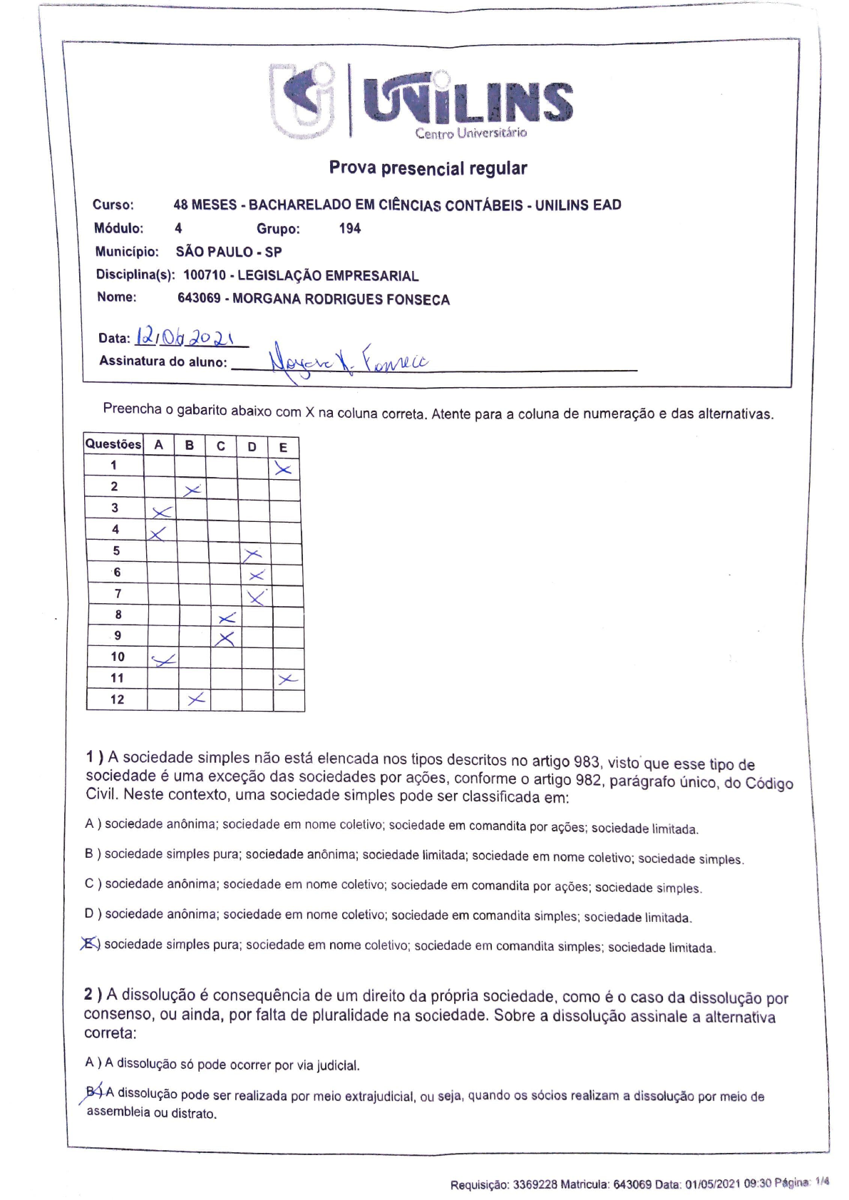 Prova presencial regular Curso: 48 MESES-BACHARELADO EM CIÊNCIAS CONTÁBEIS-UNILINS EAD Módulo: 4 Grupo: 194 Município: SÃO PAULO • SP Disciplina(s): 100710 · LEGISLAÇÃO EMPRESARIAL Nome: 643069 · MORGANA RODRIGUES FONSECA Data: _l~_1.lli) Jo ,l,\ Assinatura do aluno: (µ ---+==~ ,,.-;:--.:....:;..4:........l...t.LJ1.~--=-------------- Preencha o gabarito abaixo com X na coluna correta . Atente para a coluna de numeração e das alternativas. Questões A B e D E 1 x 2 ~ 3 '>< 4 ✓ 5 Ir- 6 >< 7 '>( 8 ~ 9 X 10 l<....L 11 >L- 12 y::_ 1 ) A sociedade simples não está elencada nos tipos descritos no artigo 983, visto· que esse tipo de sociedade é uma exceção das sociedades por ações, conforme o artigo 982, parágrafo único, do Código Civil. Neste contexto, uma sociedade simples pode ser classificada em: A) sociedade anônima; sociedade em nome coletivo; sociedade em comandita por ações; sociedade limitada. B ) sociedade simples pura; sociedade anônima; sociedade limitada; sociedade em nome coletivo; sociedade simples. C ) sociedade anônima; sociedade em nome coletivo; sociedade em comandita por ações; sociedade simples. D ) sociedade anônima; sociedade em nome coletivo; sociedade em comandita simples; sociedade limitada. ~ ) sociedade simples pura; sociedade em nome coletivo; sociedade em cornandita simples; sociedade limitada. 2) A dissolução é consequência de um direito da própria sociedade, como é o caso da dissolução por consenso, ou ainda, por falta de pluralidade na sociedade. Sobre a dissolução assinale a alternativa correta: A ) A dissolução só pode ocorrer por via judicial. r,A dissolução pode ser realizada por meio extrajudicial, ou seja, quando os sócios realizam a dissolução por meio de assembleia ou distrato. Requisição: 3369228 Matricula: 643069 Data: 01 /05/2021 09:30 P6gina· , 14 ..a.e .... ___________________ ___;:..._ ___________________ _ - C ) A dissolução pode ocorrer somente por assembleia, nunca por meio de processo judicial. O ) A dissolução da sociedade pode ocorrer sempre por vontade dos fornecedores. E ) A dissolução s6 pode ocorrer por distrato, não precisando de votação em assembleia. 3 ) A sociedade limitada tem como atributos a limitação da responsabilidade dos sócios e a contratualidade. Neste contexto, assinale a alternativa correta: ~Os sócios só poderão responder de acordo com o capital social integralizado, ou seja, não poderão os credores executar seus créditos mediante o patrimônio particular dos sócios. Sobre a contratualidade, refere-se à vontade dos sócios serem estabelecidas por melo de contrato social. 8 ) Sobre a contratualidade, refere-se à vontade dos sócios serem estabelecidas por melo de estatuto social. e~ Os credores podem sempre executar seus créditos mediante o patrimônio particular dos sócios. D ) Os sócios responderão de forma ilimitada. E ) A responsabilidade dos sócios não pode ser estabelecida no contrato social. 4 ) Nos casos de liquidação judicial, o procedimento de liquidação ocorrerá por meio de processo judicial , que poderá ser solicitado por qualquer sócio, quando ocorrer algum tipo de discórdia para a realização da liquidação de pleno direito, ou simplesmente deixarem de realizar a liquidação após a dissolução. Outro solicitante pode ser o Ministério Público, que realizará o comunicado às autoridades quando: ~ A sociedade empresarial não iniciar a liquidação, após 30 dias subsequentes da dissolução; ou após iniciar a liquidação, paralise esse processo por mais de 15 dias. B ) O Ministério Público nunca pode interferir neste assunto, por ser um direito exclusivo dos sócios. C ) Após iniciar a liquidação, paralise esse processo por mais de 30 dias. D ) A sociedade empresarial não iniciar a liquidação, após um ano subsequentes da dissolução. E ) Após iniciar a liquidação, paralise esse processo por mais de 90 dias. 5) A fusão é a operação pela qual se unem duas ou mais sociedades para formar sociedade nova, que lhes sucederá em todos os direitos e obrigações. Sobre essa modalidade de metamorfose, analise as afirmações e assinale a alternativa correta: 1. Nesta operação, ocorre o surgimento de uma nova sociedade que é a decorrência da junção das sociedades fundidas. li. Os sócios da sociedade fusionada passam a integrar o corpo associativo da incorporadora ou da nova sociedade resultante. Ili. Nesta operação, não ocorre apenas a passagem patrimonial de uma sociedade para outra, mas também a absorção do corpo associativo. A ) Somente as alternativas I e li estão corretas. B) Todas as alternativas estão corretas. C ) Somente a alternativa li está correta. ~ Todas as alternativas estão incorretas. E ) Somente as alternativas I e Ili estão corretas. 6 ) Atividade empresarial - quando o legislador afirma que o empresário "exerce profissionalmente uma atividade econômica organizada", quer dizer que a empresa é uma atividade, de produção, ou ainda de circulação de bens, ou serviços. Sobre esse assunto assinale a alternativa correta: A ) A empresa é sinônimo de estabelecimento empresarial. 8 ) O direito empresarial moderno não se preocupa em manter a atividade empresarial ativa, pois o legislador não quer se interferi em (luestões particulares. e ) A empresa não necessariamente quer aferir lucro, como é o caso das escolas religiosas. ~ A empresa é uma atividade desenvolvida, e estabelecimento é o local onde é desenvolvida a atividade empresarial. E ) Nenhuma das alternativas. 7 ) O conceito: "é um recurso técnico que consiste em se aplicar, a uma hipótese não-prevista. pe! 0 legislador, a solução por ele apresentada para outra hipótese fundamentalmente semelhante a nao- prevista" refere-se a qual termo: A ) Costumes. B ) Jurisprudência. C ) Lacuna. O( Analogia. E ) Nenhuma das alternativas. 8) Sobre a exclusão de um sócio da sociedade contratual , é importante de