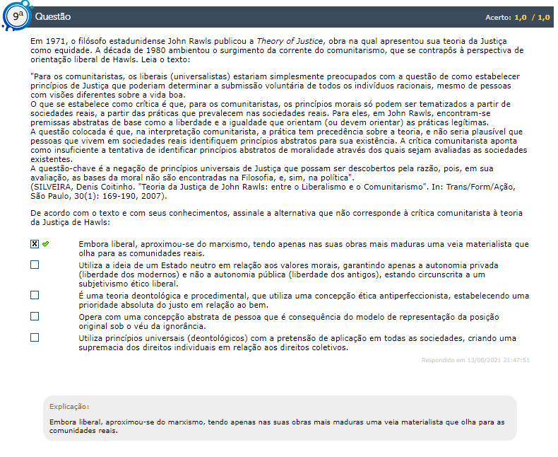Em 1971, o filósofo estadunidense John Rawls publicou a Theory of Justice, obra na qual apresentou sua teoria da Justiça como equidade. A década de 1980 ambientou o surgimento da corrente do comunitarismo, que se contrapôs à perspectiva de orientação liberal de Hawls. De acordo com o texto e com seus conhecimentos, assinale a alternativa que não corresponde à crítica comunitarista à teoria da Justiça de Hawls: Utiliza princípios universais (deontológicos) com a pretensão de aplicação em todas as sociedades, criando uma supremacia dos direitos individuais em relação aos direitos coletivos. É uma teoria deontológica e procedimental, que utiliza uma concepção ética antiperfeccionista, estabelecendo uma prioridade absoluta do justo em relação ao bem. Utiliza a ideia de um Estado neutro em relação aos valores morais, garantindo apenas a autonomia privada (liberdade dos modernos) e não a autonomia pública (liberdade dos antigos), estando circunscrita a um subjetivismo ético liberal. Embora liberal, aproximou-se do marxismo, tendo apenas nas suas obras mais maduras uma veia materialista que olha para as comunidades reais. Opera com uma concepção abstrata de pessoa que é consequência do modelo de representação da posição original sob o véu da ignorância.