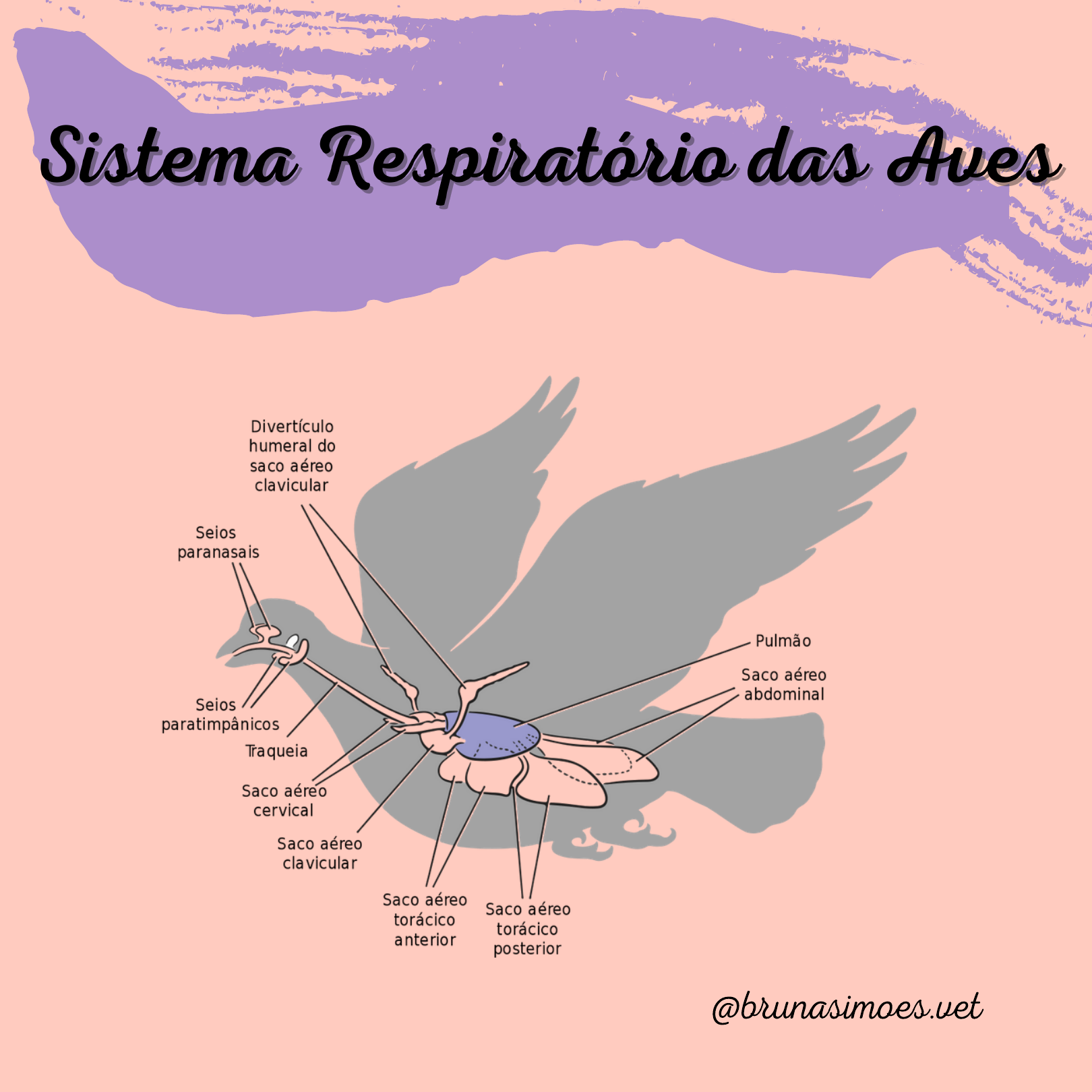 @brunasimoes.vet @brunasimoes.vet Os pulmões são rígidos e não espandem como o dos mamíferos Responsáveis pela espanção e ajudam na termorregulação do corpo Têm a função de ventilar ar para os pulmões Diminuem o peso do animal para o vôo O volume de gás é dez vezes maior do que nos pulmões Auxiliam na refrigeração do corpo Sacos aéreos: Divertículo: Alguns sacos aéreos penetram por essa estrutura nos ossos peneumáticos Levam ar para os ossos ajudando no vôo Resistência e leveza Aves não possuem diafragma: Músculos respiratórios Movimentam as costelas e o esterno, expandindo ou retraindo a cavidade