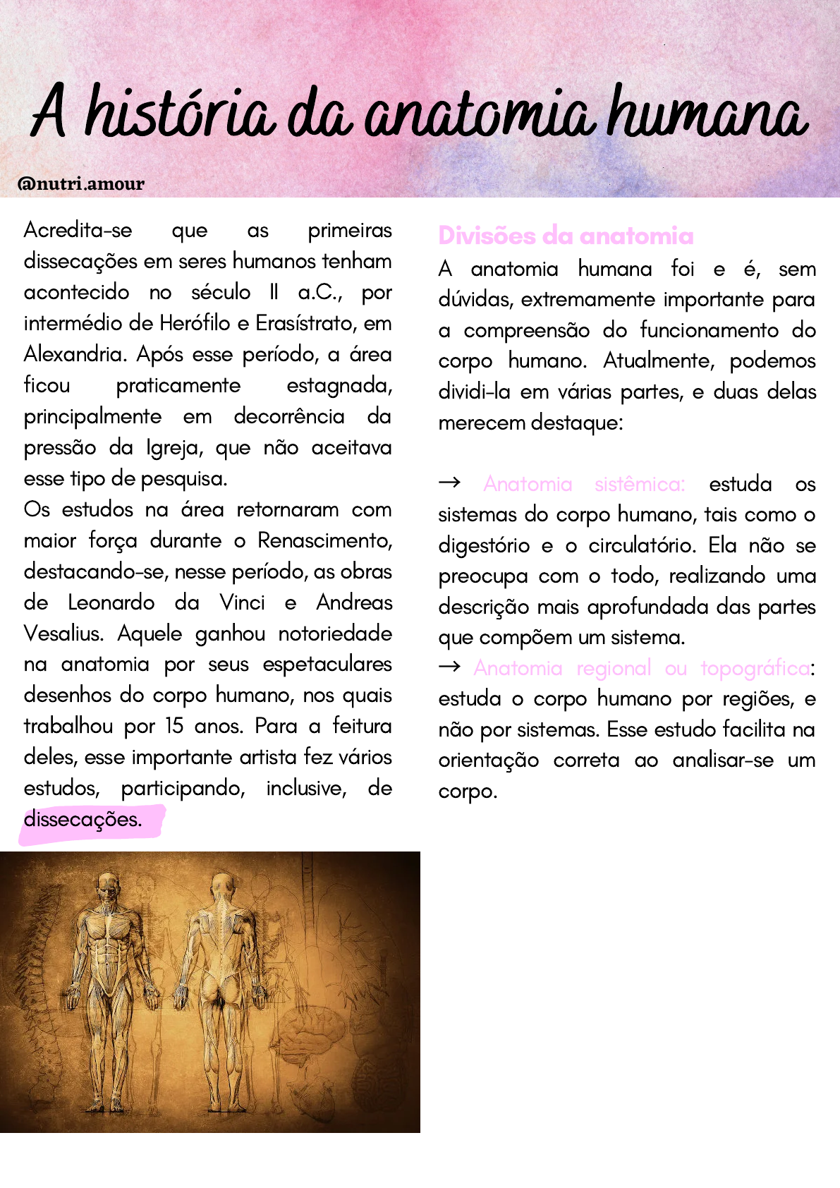 A história da anatomia humana Acredita-se que as primeiras dissecações em seres humanos tenham acontecido no século II a.C., por intermédio de Herófilo e Erasístrato, em Alexandria. Após esse período, a área ficou praticamente estagnada, principalmente em decorrência da pressão da Igreja, que não aceitava esse tipo de pesquisa. Os estudos na área retornaram com maior força durante o Renascimento, destacando-se, nesse período, as obras de Leonardo da Vinci e Andreas Vesalius. Aquele ganhou notoriedade na anatomia por seus espetaculares desenhos do corpo humano, nos quais trabalhou por 15 anos. Para a feitura deles, esse importante artista fez vários estudos, participando, inclusive, de dissecações. Divisões da anatomia A anatomia humana foi e é, sem dúvidas, extremamente importante para a compreensão do funcionamento do corpo humano. Atualmente, podemos dividi-la em várias partes, e duas delas merecem destaque: → Anatomia sistêmica: estuda os sistemas do corpo humano, tais como o digestório e o circulatório. Ela não se preocupa com o todo, realizando uma descrição mais aprofundada das partes que compõem um sistema. → Anatomia regional ou topográfica: estuda o corpo humano por regiões, e não por sistemas. Esse estudo facilita na orientação correta ao analisar-se um corpo. @nutri.amour https://brasilescola.uol.com.br/historiag/renascimento.htm https://brasilescola.uol.com.br/biografia/leonardo-vinci.htm https://brasilescola.uol.com.br/biologia/sistema-digestivo.htm https://brasilescola.uol.com.br/biologia/sistema-circulatorio.htm