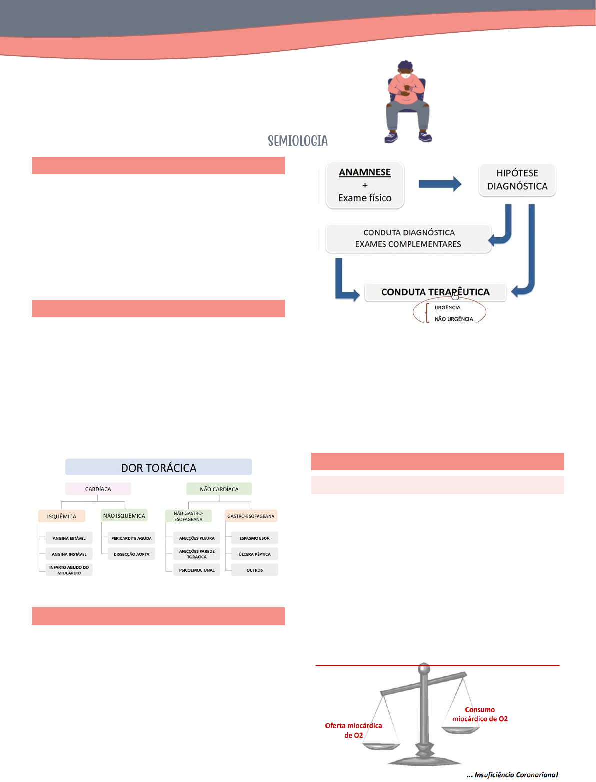 Bruna Altvater Saturnino XLII – 2021.1 - 1 31.05.21 Dor torácica DOR TORÁCICA É uma das queixas mais comuns nos serviços de emergência, consultórios, ambulatórios... Queixas do paciente: • Dor; • Sensação de pressão; • Desconforto. ORIGEM • Coração; • Pericárdio; • Pulmões; • Pleuras; • Parede torácica; • Mediastino; • Esôfago; • Diafragma. SEMIOLOGIA Anamnese → decálogo da dor e exame físico. • Quais são as características semiológicas desta dor torácica? • Por estas características, qual é o provável órgão/estrutura acometido? • Quais são os achados do exame físico? Eles corroboram o meu raciocínio inicial? • Qual é o diagnóstico sindrômico? • Quais são os possíveis diagnósticos etiológicos e diferenciais? Com base em uma hipótese diagnóstica ou mais, se toma uma conduta, essa conduta já pode ser terapêutica e algumas vezes não, mas então pode-se tomar uma conduta diagnóstica, dessa forma, solicita-se exames complementares para ajudar na investigação, esses exames levam a uma conduta terapêutica. No contexto de dor torácica, a conduta terapêutica pode ser: urgente ou não urgente. CORAÇÃO SÍNDROME CORONARIANA AGUDA Envolve um amplo espectro de condições clínicas, que vão desde a isquemia silenciosa, passando pela angina instável até o IAM (com ou sem supra ST). Fatores de risco: • Idade; • DM; HAS; tabagismo; dislipidemia; • História pessoal de DAC (doença arterial coronariana) / AVC; • História familiar de DAC precoce (< 55 anos para homens e < 65 anos para mulheres). Mulheres e idosos - podem não manifestar a apresentação clássica. A oferta é menor que o consumo → insuficiência coronariana. Bruna Altvater Saturnino XLII – 2021.1 - 2 ANGINA ESTÁVEL - ANAMNESE • Dor retroesternal, constritiva ou opressiva; • Possível irradiação para MSE, ambos os membros ou região cervical/mandibular; • Desencadeada por esforço físico ou estresse emocional; • Aliviada rapidamente com o repouso ou nitrato (após 1 – 3 min); • Duração breve (< 5 – 10 minutos). ANGINA INSTÁVEL - ANAMNESE A angina instável é clinicamente instável e, muitas vezes, constitui um prelúdio do infarto do miocárdio ou de arritmias ou, com menos frequência, de morte súbita. • Duração maior (em geral > 20 minutos); • Sinais e sintomas associados – sudorese, palidez cutânea, náuseas e vômitos. Uma história clínica, com detalhada descrição dos sintomas, possibilita aos clínicos uma caracterização adequada da dor torácica. Algumas características dos sintomas devem ser cuidadosamente indagadas com a finalidade de orientarem a probabilidade de presença de angina: qualidade: constritiva, aperto, peso, opressão, desconforto, queimação, pontada; localização: precordial, retroesternal, ombro, epigástrio, cervical, hemitórax, dorso; irradiação: membros superiores (direito, esquerdo, ambos), ombro, mandíbula, pescoço, dorso, região epigástrica; duração: segundos, minutos, horas e dias; fatores desencadeantes: esforço físico, atividade sexual, posição, alimentação, respiração, componente emocional, espontânea; fatores de alívio: repouso, nitrato sublingual, analgésico, alimentação, antiácido, posição e apneia; sintomas associados: sudorese, náusea, vômito, palidez, dispneia, hemoptise, tosse, pré-síncope e síncope. Vários são os adjetivos utilizados pelos pacientes na descrição da angina: “sufocamento”, “queimação”, “opressão”, “peso”, entre outros. Não é raro referirem apenas o sintoma de “desconforto” e não “dor” pré- cordial. Quase nunca a angina é referida como em pontada, e, usualmente, não tem relação com a respiração, nem com o decúbito. SÍNDROME CORONARIANA AGUDA – ANAMNESE • Dor retroesternal, constritiva ou opressiva; − Lembrar dos casos atípicos; • Possível irradiação para MSE, ambos os membros ou região cervical/mandibular; • A dor pode ter início quando o paciente está em repouso; • Duração maior (> 20 minutos), podendo perdurar por vária horas; • Sinais e sintomas associados – sudorese, palidez cutânea, náuseas e vômitos; • A dor persiste ou melhora muito pouco com nitratos; • Precordialgia intensa, associada a náusea, vômitos e sudorese, sugere muito IAM. SÍNDROME CORONARIANA AGUDA – EXAME FÍSICO • B3? B4? Ritmo de galope? • Sopro de regurgitação mitral? • Estertoração pulmonar? • Achados de doença aterosclerótica em outros territórios? − Sopro aorta abdominal; − Avaliação pulsos periféricos; • Sinais clínicos que sugerem fatores de risco para DCV: − PA elevada; − Acantose nigricans; − Xantomas. Pacientes com doença aterosclerótica coronariana, na grande maioria das vezes tem doença aterosclerótica em outros territórios. Acantose Nigricans Arco corneano – sugere hipercolesterolemia familiar Bruna Altvater Saturnino XLII – 2021.1 - 3 Xantelasmas Xantomas – patognomônicos de hipercolesterolemia familiar (risco cardiovascular elevado) SÍNDROME CORONARIANA AGUDA – EXAMES COMPLEMENTARES Eletrocardiograma: • Alterações indicativas de presença de áreas inativas prévias; • Supra ST; • Alterações dinâmicas. Raio-X de tórax: • Diagnóstico diferencial. Marcadores bioquímicos de necrose miocárdica: • CK-MB; • Troponinas (I ou T). ELETROCARDIOGRAMA: 1. Supradesnível de ST: Elevação do segmento ST (no ponto J) nova ou presumivelmente nova em duas ou mais derivações contíguas: • ≥ 2 mm nas derivações V1 a V6 (precordiais); • ≥ 1 mm nas derivações do plano frontal (periféricas); *Ponto J: junção do fim do QRS e início do segmento ST. 2. Bloqueio de ramo esquerdo: • Complexo QRS ≥ 120 ms com morfologia Qs ou rS em V1; • Ausência de q em D1, V5 ou V6. 3. Infradesnível do ST ou inversão da onda T: • Desvio negativo do ponto J > 0.5 mm em pelo menos 2 derivações co
