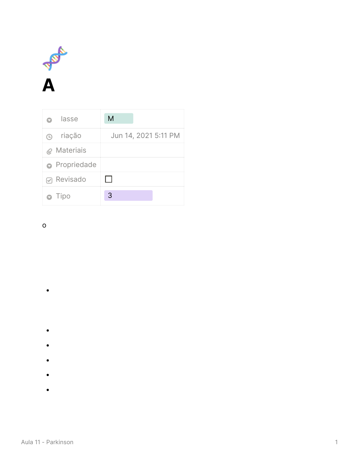Aula 11 - Parkinson 1 🧬 Aula 11 - Parkinson Classe MDD II Criação Materiais Propriedade Revisado Tipo 3° Semestre Doença neurodegenerativa Termo utilizado para uma série de doenças que afetam os neurônios. Causam assim problemas de movimento (ataxias) ou de função mental (demências). Sintomatologia Tremor Rigidez plástica Bradicinesia, com instabilidade postural aparecendo em alguns pacientes à medida que a doença progride. Além disso... Disfunções não motoras: Distúrbios de humor Disfunção do sono Disfunção autonômica Déficits cognitivos Demência e sintomas neuropsiquiátricos. Jun 14, 2021 511 PM Aula 11 - Parkinson 2 Patogênese A patogênese do parkinsonismo parece estar relacionada com uma combinação de: Degradação reduzida de proteínas Acúmulo e agregação de proteínas intracelulares Estresse oxidativo Lesão mitocondrial Cascatas inflamatórias Apoptose Neurotransmissores Substâncias químicas produzidas pelos neurônios com a função de biossinalização. Catecolaminas Hormônios derivados do catecol, sintetizados pelas glândulas suprarrenais e pelo sistema nervoso, que atuam como reguladores do metabolismo e como transmissores, tais como a adrenalina, a noradrenalina e a dopamina. Aula 11 - Parkinson 3 Aula 11 - Parkinson 4 Aula 11 - Parkinson 5 Aula 11 - Parkinson 6 Aula 11 - Parkinson 7 Bloqueador colinérgico Levodopa Inibir a MAO Facilitar a liberação na fenda sinóptica Inibir a recaptação Colocar uma molécula parecida com dopamina no paciente Inibir a CONT Aula 11 - Parkinson 8 Dopamina não atravessa a barreira hematoencefálica Levodopa Aula 11 - Parkinson 9 Tentativa de compensar a deficiência de dopamina no SNC, ela precisa ser compensada. A DOPA é o aminoácido precursor da Dopamina e da Adrenalina. A Dopamina NÃO atravessa a barreira hematencefálica BHE. Utiliza-se L-dopa, que é transportado como aminoácido através da BHE por um carregador de aminoácidos e descarboxilado no local pela dopadescarboxilase. 1 – 3% entra no cérebro inalterada (o resto é metabolizada na periferia) Levadopa + Carbidopa 9095% da levodopa administrada via oral será descarboxilada na parede do trato gastrointestinal. Solução: Administrar em conjunto com um inibidor da L Aminoácidos aromáticos descarboxilase (carbidopa/ bersaizida) ou com um IMAO. Agonistas Dopaminérgicos Os fármacos que atuam diretamente sobre os receptores de dopamina podem ter efeito benéfico, além daquele da levodopa. Diferentemente da levodopa, não exigem conversão enzimática em um metabólito ativo Atuam diretamente sobre os receptores de dopamina póssinápticos Não possuem nenhum metabólito potencialmente tóxico e não competem com outras substâncias pelo seu transporte ativo no sangue e através da barreira hematencefálica. Aula 11 - Parkinson 10 Inibidores da MAO Inibidores da monoaminoxidase B MAOB A MAOB pode ser inibida pela selegilina ou pela rasagilina. A degradação de aminas biogênicas em órgãos periféricos não é afetada devido à MAOA permanecer funcional. Cuidado: O metabolismo da Sileginina pode gerar produtos indesejáveis, como anfetamina e metanfetamina (aumento da insônia e da ansiedade) Inibidores da Comt Inibidores da catecolamina-O-metiltransferase COMT A entacapona, fármaco que não chega ao SNC, inibe a degradação periférica de L-dopa pela Aula 11 - Parkinson 11 COMT e, assim, aumenta a disponibilidade de L-dopa para o cérebro. Anticolinérgicos Antagonistas muscarínicos de ação central (bloqueio dos receptores muscarínicos) Biperideno Triexifenidil Benztropina Aula 11 - Parkinson 12