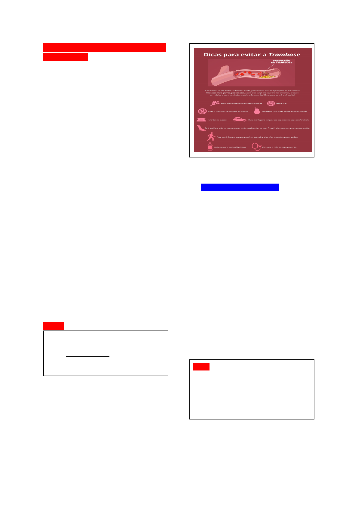 # TROMBOSE VENOSA PROFUNDA E ERISIPELA * Caso clínico 1 ↴ ID- mulher de 69 anos QD- “inchaço na perna direita e dor na região ha 1 h” HMA- relata que há 1 h, durante vôo internacional quando voltava da Alemanha, que durou 13 horas, notou inchaço e dor na panturrilha direita. Procurou o serviço médico do aeroporto de Guarulhos sendo prontamente encaminhada para internação hospitalar em hospital de referência. EXAME FÍSICO: Geral- BEG, consciente e corada ACV- 2BRNF, PA: 130/ 80 MMII- veias varicosas na perna tanto na face medial quanto lateral Pulsos- femoral bilateral, poplíteos, presentes. Tibiais anterior e pedioso diminuídos no MID Sinal da Bandeira- positivo Sinal de Homans- positivo Sinal de Bancroft- positivo H. diagnóstica: Trombose venosa profunda no MID OBS ↴ Cuidados p previnir TVP → uso de meias elásticas compressivas (Ex: em vôos), anticoagulante, elevação de membros, fisioterapia, deambulação precoce pós cirurgia… ---------------------------//---------------------------- 1. Sd. compartimental ↴ - ou “Sd. da classe econômica” → q ocorre quando fica muito tempo sentado por exemplo, pois ↑ pressão dentro do compartimento (Ex: durante voos longos…) - condição dolorosa e perigosa causada pelo acúmulo de pressão devido a hemorragia interna ou inchaço dos tecidos. A pressão diminui o fluxo sanguíneo, privando músculos e nervos do suprimento necessário. - os sintomas podem incluir dor, formigamento e fraqueza da área afetada. Nos casos graves de síndrome compartimental, é necessária uma cirurgia de emergência. OBS: Sd. Compartimental → “distúrbio continente/ conteúdo (1 ↑ e outro ↓, ou vice e versa) relacionado ao ↑ pressão dentro do compartimento, comprometendo perfusão tissular”. pode ocorrer pq de causas ext. ou int. ---------------------------//---------------------------- 2. TVP ↴ - é uma doença potencialmente grave causada pela formação de coágulos (trombos) no interior das veias profundas. - conhecida como flebite ou tromboflebite profunda, é a doença causada pela coagulação do sangue no interior das veias (vasos q levam sangue de volta p coração) em um local ou momento não adequado (devemos lembrar q a coagulação é um mecanismo de defesa do organismo). - pode acontecer nas pernas, coxas, ou MMSS - as veias + comumente acometidas são as dos MMII (cerca de 90% dos casos): - vv. sist. venoso profundo → v. poplítea (bastante comum), vv. tibiais anterior e posterior. - vv. sist. venoso superficial → v. safena magna (q junta na v. femoral) e v. safena parva (q junta na poplítea). - é uma patologia + frequente em portadores de certas condições predisponentes, como → uso de anticoncepcionais ou tratamento hormonal, tabagismo, presença de varizes, pacientes c/ IC, tumores malignos, obesidade ou a história prévia de TVP. - outros fatores desencadeantes de TVP → cirurgias de médio e grandes portes, infecções graves, traumatismo, a fase final da gestação e o puerpério (pós-parto) e qualquer outra situação q obrigue a uma imobilização prolongada (paralisias, IAM, viagens aéreas longas… - muitas vezes é oligossintomática ou assintomática * OBS ↴ ● Sinais e sintomas: - edema assimétrico, cianose, palidez, dor, isquemia (pq da compressão das aa.) ↪ OBS: edema gera → proc. inflamatório → isquemia. Sinais clássicos ↴ - Sinal da Bandeira (vai estar menos móvel do q a outra panturrilha quando der peteleco na panturrilha) - Sinal de Homans (gera dor na panturrilha após dorsiflexão passiva do pé) - Sinal de Bancroft (dor quando palpa panturrilha contra estrutura óssea) ● Diagnóstico: - clínico é difícil - exame + utilizado é p diagnóstico é o → Eco Color Doppler (ve fluxo sanguíneo); mas usa tbm o D-dímero ● Tratamento: (c/ anticoagulantes ou fibrinolíticos) - anticoagulantes → impedem formação do trombo (Ex: enoxaparina…) - fibrinolíticos → destroem o trombo * TRÍADE DE VIRCHOW: ↪ qualquer disfunção endotelial (COVID, obeso, proc. inflamatórios…); estase venosa (acamados, viagens longas…); hipercoagulabilidade (gravidez, trauma, trombofilia…) Quando trombo se desprende = embolia: - Ex: trombo na v. poplítea → v. femoral → v. ilíaca ext. → v. ilíaca comum → V.C.I. → AD → VD → tronco pulmonar. - se não chega sangue direito no pulmão = prejudica hematose - quando trombo para na a. pulmonar = cianose... - A TVP pode ser de extrema gravidade na fase aguda, causando embolias pulmonares muitas vezes fatais ↴ * Tromboembolismo pulmonar (TEP): é causado pela fragmentação dos coágulos e a migração destes até os pulmões, entupindo as artérias pulmonares e gerando graves problemas cardíacos e pulmonares. ↪ Sinais e sintomas → dispnéia súbita, taquipnéia, cianose central ou periférica, tosse, hemoptise, dor ou opressão torácica, hipóxia ↪ Tratamento → drogas (heparinas de baixo peso molecular) ---------------------------//---------------------------- 3. ERISIPELA ↴ - condição inflamatória que atinge a derme e o panículo adiposo (tecido celular subcutâneo) da nossa pele, com grande envolvimento dos vasos linfáticos. (representa uma forma superficial da celulite, pois atinge predominantemente a derme e a parte superior da gordura subcutânea) - acomete + MMII de pacientes da terceira idade, cuja circulação venosa e linfática estão debilitadas. (porém, pode atingir pessoas de qualquer idade e outras regiões da pele) - a erisipela está relacionada a um fator chamado “porta de entrada”, como úlcera venosa crônica, pé de atleta, picada de insetos, ferimento cutâneo traumático e manipulação inadequada das unhas - pessoas com baixa condição imunológica, obesas e com má circulação são as mais suscetíveis. - a principal bactéria envolvida é o Estreptococo beta-hemolítico do grupo A * OBS ↴ ERISIPELA: - cuidado c/ o pé, principalmente de diabético - 