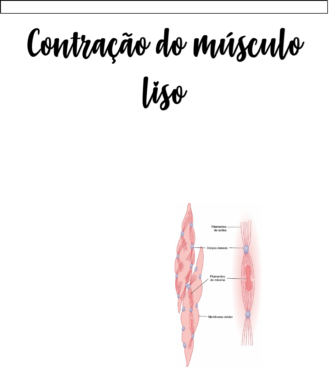 Contração do músculo liso Tipos de músculo liso: • Multiunitário: composto por fibras separadas, que operam independentemente uma da outra e realizam a contração por impulsos nervosos enviados pela única terminação nervosa que a inerva; • Unitário: várias fibras musculares que se contraem juntas, funcionando como uma única unidade, por terem suas membranas unidas por junções comunicantes ou aderidas entre si, facilitando a dispersão do potencial de ação ou de íons. à “músculo liso visceral”. Mecanismo contrátil • O músculo liso é composto por filamentos de actina e miosina, assim como músculo esquelético; • O filamento de actina não possui associado em si o complexo de tropomiosina, portanto, tem seus sítios ativos descobertos; • Os filamentos de actina estão ligados a uma estrutura chamada de corpo denso (desempenham a mesma função que o corpo Z), que podem estar dispersos no interior da célula, ligados à membrana celular ou ligados a outras células e atuando como pontes de transmissão de potencial de ação; • As células de musculatura lisa apresentam uma maior quantidade de actina quando comparando-se a miosina, que se encontra entre os filamentos de actina; • O processo contrátil é ativado por íons de Ca++ e o ATP é degradado em ADP para fornecer energia para a contração; • Quando comparando-se com a contração do músculo esquelético, pode-se observar que o músculo liso possui uma contração tônica mais longa; • A frequência no número de desligamento e religamento da actina com a miosina no músculo liso é muito mais baixa que no esquelético, porém, o tempo de cada ligação (e sendo assim contração) é maior pela Marianne Barone (T15A) Disciplina – Prof. Marianne Barone (T15A) Fisiologia I – Prof. Dr. Michelangelo lentidão da conexão e da desconexão, resultando, também, um maior máximo de força; • Mecanismo de trava: é um mecanismo que, após o músculo tenha desenvolvido a contração completa, diminui a excitação e energia utilizados para a manutenção da mesma; • Possui a capacidade de restabelecer a mesma força original da contração pouco tempo depois de ter sido alongado ou encurtado, especialmente em órgãos ocos, mantendo a pressão quase constante no seu lúmen. → Regulação pelos íons cálcio: • A contração ocorre, assim como nos músculos esqueléticos, pelo aumento intracelular do cálcio, que pode ser causado por fatores como estimulação nervosa ou hormonal, estiramento da fibra ou alteração química no ambiente; • Em vez da troponina, as células musculares lisas têm como proteína reguladora a calmodulina, que atua iniciando a contração pela ativação das pontes cruzadas da miosina, seguindo a seguinte sequência: - Aumento do nível de cálcio no citossol (solução constituída principalmente por água). A entrada de Ca++ ocorre pelos canais de cálcio e/ou liberação do íon pelo retículo sarcoplasmático; à o Ca++ sai do reticulo sarcoplasmático (rede de canais membranosos) para o citossol, pela despolarização de todas as membranas da célula (contíguas), inclusive da membrana do reticulo sarcoplasmático. Como a membrana do retículo é “ligada em uma linha só” com a membrana da célula, quando a membrana é despolarizada, a membrana do reticulo também é; - Com o aumento da [ ] de Ca++ no citossol, a proteína calmodulina se liga ao cálcio, o que promove alterações eletrônicas na proteína em que é ligada = alteração conformacional; à porém, a maioria do Ca++ vêm do líquido extracelular com a despolarização pelo potencial de ação e abertura dos canais de Ca++ e não do retículo, sendo difundido no interior celular - A calmodulina, após sua mudança conformacional, ativa a proteína Miosina de Cinase de Cadeia Leve (MLCK), que se encontrava inativa anteriormente; - Quando a MLCK está em sua forma ativa, coloca em movimento as cadeias de miosina. Essa movimentação ocorre pela fosforilação da miosina (ativa pela MLCK = adicionar fosforo), gerando atividade da ATPase (quebra de ATP = liberação de energia); - A miosina é movimentada em direção da actina após o uso do ATP (da energia liberada na quebra do ATP); • O movimento de torção é dado pela inclinação obliqua da miosina em relação a actina. → Relaxamento: • Para provocar o relaxamento, é necessária a extração do Ca++ do citossol, o que ocorre através da Bomba de Cálcio, responsável por bombear os íons de Ca++ para fora da célula; à precisa de ATP para ocorrer • Com a retirada do Ca++, não ocorre a ligação da CaM, responsável por ativar a MLCK, ou seja, não ocorre a fosforilação da miosia, o que promove o descolamento da cabeça da miosina da actina; à MLCP (fosfatase de cadeia leve de miosina), desliga a contração pela retirada do fosfato com a ação da Fosfatase - Ao tirar o fosfato, não é permitido que o ATP seja formado = não pode quebrar ATP = relaxamento; • Ocorre a entrada de Na+ com a retirada do Ca++. Controle nervoso • Na musculatura lisa, as inervações das células ocorrem sem contato direto, chamadas junções difusas, onde são secretadas as substâncias (norepinefrina e acetilcolina) neurotransmissoras na matriz que recobre o músculo liso por uma região chamada de varicosidades (terminal do axônio modificado); • As substâncias acetilcolina e norepinefrina têm em diferentes fibras funcionalidades diferentes e atuam inibindo uma a outra. Por exemplo, caso a acetilcolina seja excitatória em uma fibra, a norepinefrina atua como inibidora. à depende se o receptor na membrana muscular é excitatório ou inibitório → Potencial de ação: • O potencial de ação da membrana do músculo liso gira entorno de -60mV, ou seja, cerca de 30mV mais positivo que o músculo esquelético; • Em A tem-se o potencial típico do músculo liso, que é muito similar ao do músculo esquelético. Ele ocorre por 