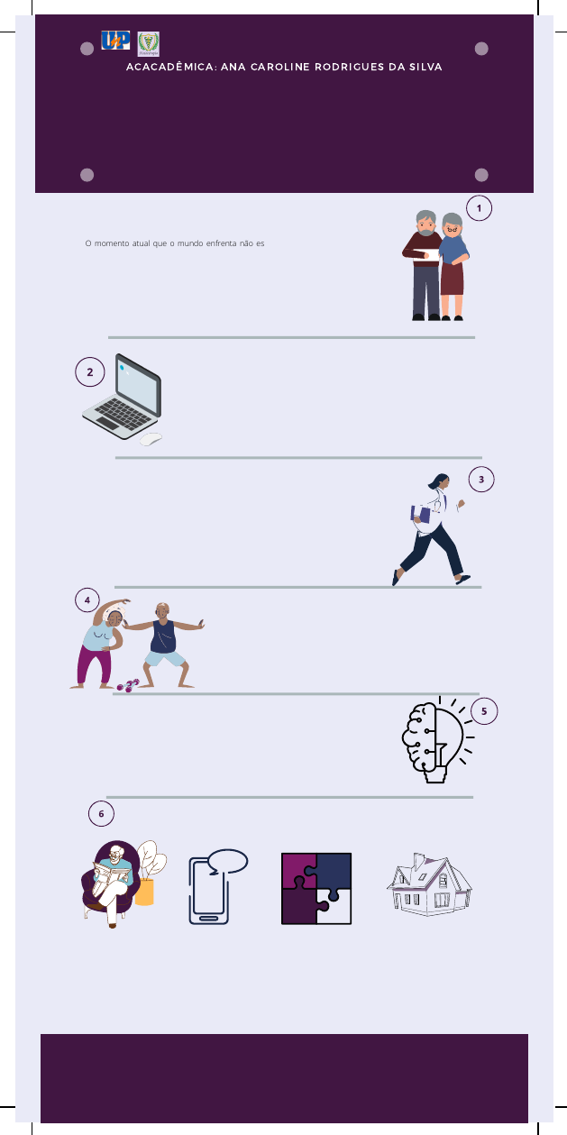 CUIDADOS COM IDOSOS NO ISOLAMENTO ACACADÊMICA : ANA CAROLINE RODRIGUES DA SILVA O momento atual que o mundo enfrenta não está sendo fácil para ninguém, mas, principalmente para os idosos que por serem grupo de risco para o coronavírus, também estão sofrendo com o isolamento social que vem causando, diversas turbulência como ansiedade e depressão, os idosos já são comumente acometidos por doenças como hipertensão, diabetes osteoporose, hipótireodismo e as neurodegenerativas como Alzheimer e parkinson. Agora, também se preocupam com a convid-19. O isolamento trouxe muita ansiedade para os idosos. É uma sensação de angústia muito forte, eles ficarem pensando, será que vou ser o próximo? Por isso, é muito importante familiares, cuidadores e amigos estarem presente da melhor forma, que, neste momento é por meio virtual. Oriento as famílias que faça chamadas por vídeo, pois, para os idosos é importante a visualização dos netos, filhos ouvir as gargalhadas saber que os seus estão bem! Isso traz tranquilidade. É fundamental criar uma rede de proteção para mostrar que eles não estão sozinhos e, assim, diminuir ansiedade neste momento de pandemia. A pandemia do Covid-19 provocou a suspensão dos atendimentos presenciais de fisioterapia. Com isso, muitos pacientes precisaram interromper as atividades, o que trouxe prejuízos à evolução conquistada durante o tratamento. Entretanto, com base na resolução do (COFFITO) n• 516, de 20 de março de 2020, permitiram realizar teleconsulta e telemonitoramento durante a quarentena. Fisioterapia possibilitou que pacientes do grupo de risco, como os idosos, continuem sendo assistidos. . Para se proteger de qualquer doença é fundamental que o corpo esteja saudável, ter uma alimentação equilibrada e rica em vitaminas e fazer alguma atividade como por exemplo os alongamentos em casa, caminha na sua rotina do dia a dia, montar quebra-cabeça, cuidar das plantas (que é uma terapia excelente), o hábito da leitura. A falta dessas atividades diárias pode trazer junto sedentarismo. Exercitar a mente é um dos pilares que não pode ser esquecido, principalmente na terceira idade. Na internet existem muitas plataformas que oferecem exercícios cerebrais para manter a mente ativa. Temos que, acima de tudo, Lembrar que envelhecimento tem que ser um processo saudável, que não significa adoecer. É PRECISO MANTER A SAÚDE FÍSICA E MENTAL E COMO FICOU O ATENDIMENTO FISIOTERAPÊUTICO? COMO CUIDAR DA SAÚDE DO CORPO DO IDOSO? SAÚDE DA MENTE DICAS DO QUE FAZER NO ISOLAMENTO Importância do isolamento social Manter o contato com a família Monte algum jogo, quebra-cabeça Leia algo frequentemente 22 de outubro de 2020, Natal/RN Docentes: Ivanna Fernandes, Ana Caroline, e Lívia Oliveira Referências: Oliveira MR, Silveira DP, Neves R, Veras R, Estrella K, Assalim VM, Araujo DV, Gomes GHG, Lima KC. Idoso na saúde suplementar: uma urgência para a saúde da sociedade e para a sustentabilidade do setor Rio de Janeiro: Agência Nacional de Saúde Suplementar; 2016. Veras RP, Oliveira MR. Care pathway fror the elderly: detailing the model. Revista Brasileira de Geriatria e Gerontologia, 2016; 19(6):887-905. Veras RP, Oliveira MR. Linha de cuidado para o idoso: detalhando o modelo. Rev. bras. geriatr. gerontol 2016; 19(6):887-905. Empurre o joelho direito para baixo com a mão direita e depois o esquerdo 6 ERROS QUE VOCÊ NÃO DEVE COMETER COM IDOSOS NO ISOLAMENTO Dica da fisio! Estenda o braço e puxe a mão virada para cima e depois para baixo apoia as mãos na cadeia e Alongar bem as pernas Segure com a mão direita , o tornozelo direito em seguida repita no outro membro Alongamento dos braços, faça para os dois lados Sentada em uma cadeira, Coloque o braço no joelho e faça uma flexão Esse exercício pode ser com a bola, ou sem Agachamento, respeitando o limite da dor Sentado em uma cadeira, abrace suas pernas flexionando tronco E NÃO MENOS IMPORTANTE OS ALONGAMENTOS A POSIÇÃO FINAL DEVE SER MANTIDA POR 30 SEGUNDOS CADA EXERCÍCIO