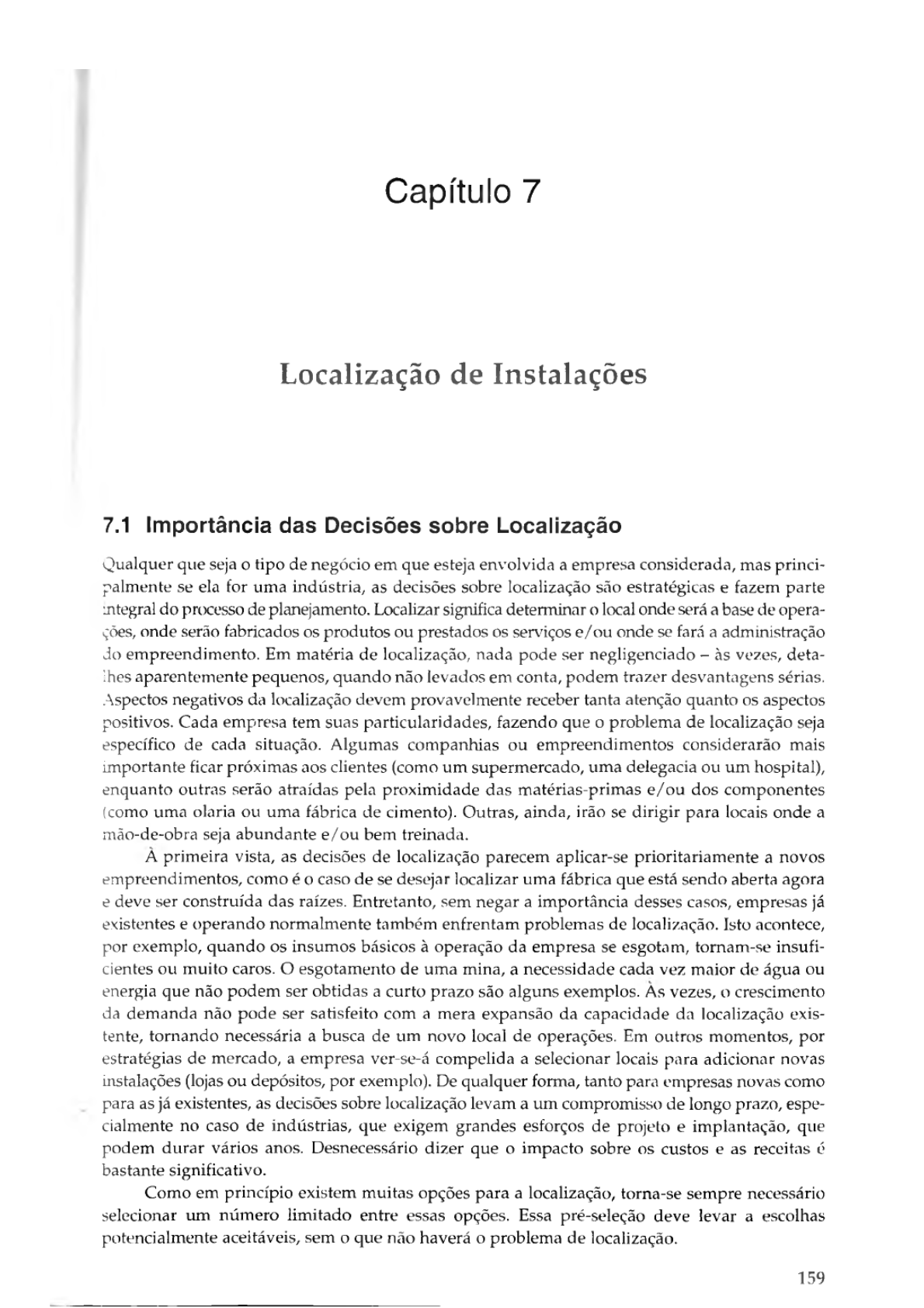 Impresso por Alex Orlando Ndava, CPF 711.623.431-41 para uso pessoal e privado. Este material pode ser protegido por direitos autorais e não pode ser reproduzido ou repassado para terceiros. 05/06/2021 12:24:06 Capítulo 7 Localização de Instalações 7.1 Importância das Decisões sobre Localização Qualquer que seja o tipo de negócio em que esteja envolvida a empresa considerada, mas princi palmente se ela for uma indústria, as decisões sobre localização são estratégicas e fazem parte integral do processo de planejamento. Localizar significa determinar o local onde será a base de opera ções, onde serão fabricados os produtos ou prestados os serviços e/ou onde se fará a administração do empreendimento. Em matéria de localização, nada pode ser negligenciado - às vezes, deta lhes aparentemente pequenos, quando não levados em conta, podem trazer desvantagens sérias. Aspectos negativos da localização devem provavelmente receber tanta atenção quanto os aspectos positivos. Cada empresa tem suas particularidades, fazendo que o problema de localização seja específico de cada situação. Algumas companhias ou empreendimentos considerarão mais importante ficar próximas aos clientes (como um supermercado, uma delegacia ou um hospital), enquanto outras serão atraídas pela proximidade das matérias-primas e/ou dos componentes (como uma olaria ou uma fábrica de cimento). Outras, ainda, irão se dirigir para locais onde a mão-de-obra seja abundante e/ou bem treinada. A primeira vista, as decisões de localização parecem aplicar-se prioritariamente a novos empreendimentos, como é o caso de se desejar localizar uma fábrica que está sendo aberta agora e deve ser construída das raízes. Entretanto, sem negar a importância desses casos, empresas já existentes e operando normalmente também enfrentam problemas de localização. Isto acontece, por exemplo, quando os insumos básicos à operação da empresa se esgotam, tornam-se insufi cientes ou muito caros. O esgotamento de uma mina, a necessidade cada vez maior de água ou energia que não podem ser obtidas a curto prazo são alguns exemplos. As vezes, o crescimento da demanda não pode ser satisfeito com a mera expansão da capacidade da localização exis tente, tornando necessária a busca de um novo local de operações. Em outros momentos, por estratégias de mercado, a empresa ver-se-á compelida a selecionar locais para adicionar novas instalações (lojas ou depósitos, por exemplo). De qualquer forma, tanto para empresas novas como para as já existentes, as decisões sobre localização levam a um compromisso de longo prazo, espe cialmente no caso de indústrias, que exigem grandes esforços de projeto e implantação, que podem durar vários anos. Desnecessário dizer que o impacto sobre os custos e as receitas é bastante significativo. Como em princípio existem muitas opções para a localização, torna-se sempre necessário selecionar um número limitado entre essas opções. Essa pré-seleção deve levar a escolhas potencialmente aceitáveis, sem o que não haverá o problema de localização. 159 Impresso por Alex Orlando Ndava, CPF 711.623.431-41 para uso pessoal e privado. Este material pode ser protegido por direitos autorais e não pode ser reproduzido ou repassado para terceiros. 05/06/2021 12:24:06 160 7.2 Opções Básicas para Empresas em Operação Quando se tratar de uma empresa já em atividade, existem três opções básicas para se localiza: uma unidade operativa: a) Expandir a instalação já existente: essa alternativa será viável se houver espaço disponível para tanto. A expansão local das instalações, além de levar a menores custos, propicia um melhor controle das ações por parte da administração. Dependendo do espaço disponível, os novos prédios podem ser térreos ou em andares. Entre outras vantagens, os prédios térreos ensejam maior flexibilidade para a disposição física de máquinas e equipamentos e conduzem a menores custos de manuseio, por não haver movimento entre andares. b) , Adicionar nova unidade retendo as demais que já estão em operação: neste caso, toma-se impor tante verificar o impacto sobre o sistema total em termos de custo/benefício com a abertura. c) nesta alternativa, importa balancear os custos de abrir e Fechar uma unidade e abrir outra: fechar. O fechamento de uma unidade pode se dar por mudanças de mercado, exaustão de matérias-primas, dificuldades de expansão no próprio local, aumento exagerado dos custos operacionais etc. ADMINISTRAÇÃO DA PRODUÇÃO E OPERAÇÕES 7.3 Fatores Determinantes nas Decisões de Localização A rigor, existe uma lista muito grande de fatores que podem, de uma forma ou de outra, influenciar nas decisões sobre localização. Nem todos são igualmente importantes em quaisquer circuns tâncias porque, como já dissemos, a localização é um problema específico para cada companhia. Assim, por exemplo, as atividades industriais são, de modo geral, fortemente orientadas para o local onde estão os recursos: matérias-primas, água, energia e mão-de-obra. As atividades de ser viços, sejam públicas ou particulares, irão orientar-se mais para fatores como proximidade do mercado (clientes), tráfego (facilidade de acesso) e localização dos competidores. Vejamos alguns dos principais fatores separadamente. 7.3.1 Localização das Matérias-Primas Um primeiro motivo para que as firmas procurem se localizar junto às fontes de matéria-prima é a relativa perecibilidade da mesma. Se a matéria-prima, uma vez obtida, não puder ser trans portada por distâncias razoáveis, ou se demandar condições muito especiais e custosas para esse transporte, isso tenderá a atrair a empresa para perto do depósito ou fonte dessas matérias- primas. Uma fábrica de processamento de alimentos, via de regra, localiza-se pelo menos nas cercanias da região de onde provêm as matérias-primas. E o caso de f