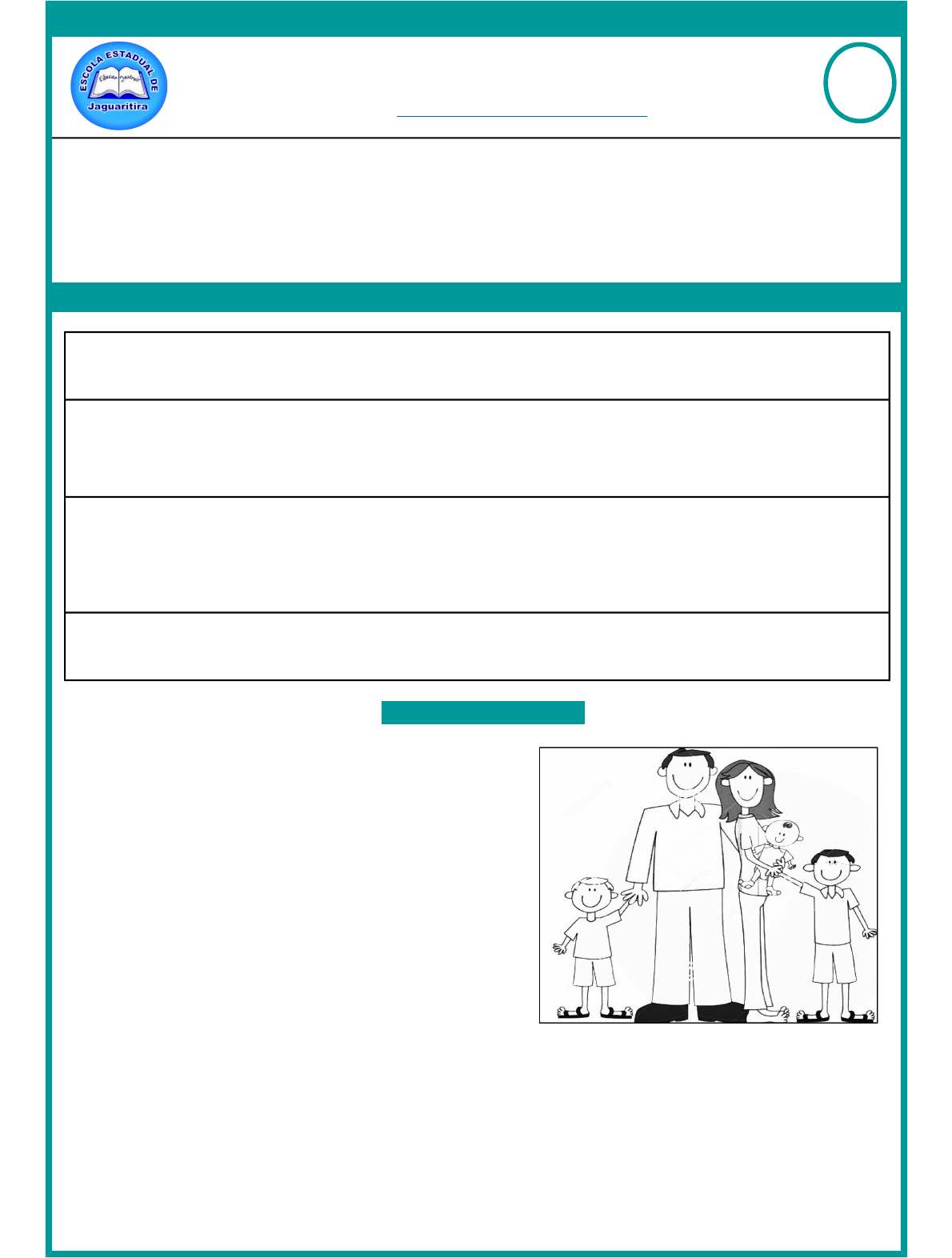 PÁGINA 01 ATIVIDADES COMPLEMENTARES AO PLANO DE ESTUDO TUTORADOATIVIDADES COMPLEMENTARES AO PLANO DE ESTUDO TUTORADO ESCOLA ESTADUAL DE JAGUARITIRA Rua Augusto Cordeiro, nº 05 Jaguaritira – Malacacheta – MG E-mail: escola.147281@educacao.mg.gov.br Componente curricular: Língua Inglesa Ano de escolaridade: 6º Ano Turma: Única Turno: Vespertino Bimestre: 1º Nome da escola: Escola Estadual de Jaguaritira Estudante: _____________________________________ Nome do professor: Tiago Pereira Batista SEMANA 1SEMANA 1 UNIDADES TEMÁTICAS: Conhecimento linguístico. Estratégia de Leitura. Construção de repertório lexical. OBJETOS DE CONHECIMENTO: Compreensão geral e específica: leitura rápida (skimming and scanning). Reflexão pós leitura de imagem. Aquisição de vocabulário. HABILIDADES: (EF06LI17) Construir repertório lexical relativo a temas familiares (escola, família, rotina diária, atividades de lazer, esportes, entre outros). (EF06L08) Identificar o assunto num texto, reconhecendo sua organização textual e palavras cognatas. CONTEÚDOS RELACIONADOS: Leitura e interpretação de tirinha. Estudo sobre a família. Prática de vocabulário. ATIVIDADES ATIVIDADES My Family I am Bruce I want to introduce my family to you. Peter is my father. Kate is mother. Peter and Kate are my parents. Johnny is my brother and Andrea is my little sister. My family is very happy. 1) Responda as questões abaixo: a) Who is father? ________________________ b) Who is mother? _______________________ c) Who is sister? ________________________ d) Who is happy? _______________________ e) Who introduces the family? ( ) Bruce ( ) Peter ( ) Johnny ( ) Andrea f) Traduza a frase: “My family is very happy”.: ___________________________________________ ___________________________________________ mailto:escola.147281@educacao.mg.gov.br PÁGINA 02 SEMANA SEMANA 22 UNIDADES TEMÁTICAS: Práticas de leitura e Pesquisa. Construção de repertório lexical. OBJETOS DE CONHECIMENTO: Compreensão geral e específica: leitura rápida (skimming and scanning). Aquisição de vocabulário. Identificação de substantivos, pronomes e verbos. HABILIDADES: (EF06LI25) Identificar a presença da língua inglesa na sociedade brasileira/comunidade (palavras universais, expressões, suportes e esferas de circulação e consumo) e seu significado. (EF07LI17) Explorar o caráter polissêmico de palavras de acordo com o contexto de uso. CONTEÚDOS RELACIONADOS: Uso das cores. Cores primárias e secundárias. Prática de vocabulário. ATIVIDADESATIVIDADES 1) Write the names and colour: WORK BANK butterfly chameleon ladybug toucan 1 = orange 2 = yellow 3 = white 4 = black 5 = brown 6 = red 7 = green 8 = blue 9 = pink 10 = purple PÁGINA 03 SEMANASEMANASS 3 E 43 E 4 UNIDADES TEMÁTICAS: Estratégias de leitura. Práticas de leitura e fruição. Avaliação dos textos lidos. OBJETOS DE CONHECIMENTO: Compreensão geral e específica: leitura rápida (skimming, scanning). Hipóteses sobre a finalidade de um texto. Construção de sentidos por meio de inferências e reconhecimento de implícitos. Construção de repertório lexical. HABILIDADES: (EF06LI07) Formular hipóteses sobre a finalidade de um texto em língua inglesa, com base em sua estrutura, organização textual e pistas gráficas. (EF06LI08) Identificar o assunto de um texto, reconhecendo sua organização textual e palavras cognatas. (EF06LI09) Localizar informações específicas em texto. CONTEÚDOS RELACIONADOS: Leitura e interpretação. Linguagem verbal e não verbal. Prática de vocabulário. ATIVIDADESATIVIDADES AT THE ZOO Julie: Look , dad! Those monkeys in that tree! How funny they are! Dad: They look like people! Julie: Can I give these bananas to that one? The black one? He is hungry. Look, he is crying! He wants these bananas! Dad: You can give the bananas, Julie. (And Julie gives the bananas to the black monkey.) Julie: Now he is very happy. He is making grimaces. He is very funny. 1) Leia o texto com atenção e marque a alternativa correta das questões abaixo: Where is Julie? (onde está Julie?) a) Julie is at school b) Julie is at the zoo. c) Julie is at home. d) Julie is at the club. Where are the monkey? (Onde estão os macacos?) a) The monkeys are in the park. b) The monkeys are on a car. c) The monkeys are in a tree. d) The monkeys are in the school. Monkeys are: (Os macacos são:) a) Monkeys are domestic. b) Monkeys are funny animals. c) Monkeys are big animals. d) Monkeys are sadness. Monkeys look like: (Os macacos parecem gostar:) a) Monkeys look like dogs. b) Monkeys look like cats. c) Monkeys look like lion. d) Monkeys look like people. Julie wants to give: (Julie quer oferecer aos macacos:) a) Apple to the black monkey. b) Bananas to the black monkey. c) Oranges to the black monkey. d) Popcorn to the black monkey. PÁGINA 04 SEMANA SEMANA 55 UNIDADES TEMÁTICAS: Gramática. Estratégias de leitura. Práticas de leitura e fruição. OBJETOS DE CONHECIMENTO: Construção de sentidos por meio de inferências e reconhecimento de implícitos. Construção de repertório lexical. Informações em ambientes virtuais. Identificação de substantivos, pronomes e verbos. HABILIDADES: (EF06LI19) Utilizar o presente do indicativo para identificar pessoas (verbo to be) e descrever rotinas diárias. (EF06LI12) Interessar-se pelo texto lido, compartilhando suas ideias sobre o que o texto informa/comunica. CONTEÚDOS RELACIONADOS: Verbo to be. Days of the week. Prática de vocabulário. ATIVIDADES ATIVIDADES I am = Eu sou, estou You are = Você é, está He is = Ele é, está She is = Ela é, está It is = Ele ou ela é, está (coisas e animais) We are = Nós somos, estamos You are = Vocês são, estão They are = Eles ou elas são, estão 1) Complete as lacunas do texto 01 com “am, are ou is” e, em seguida, responda a questão do texto 02 em português: TEXTO 01TEXTO 01 Hello! I __________ kate. I ___________ from Canada. My home town _________ Montr