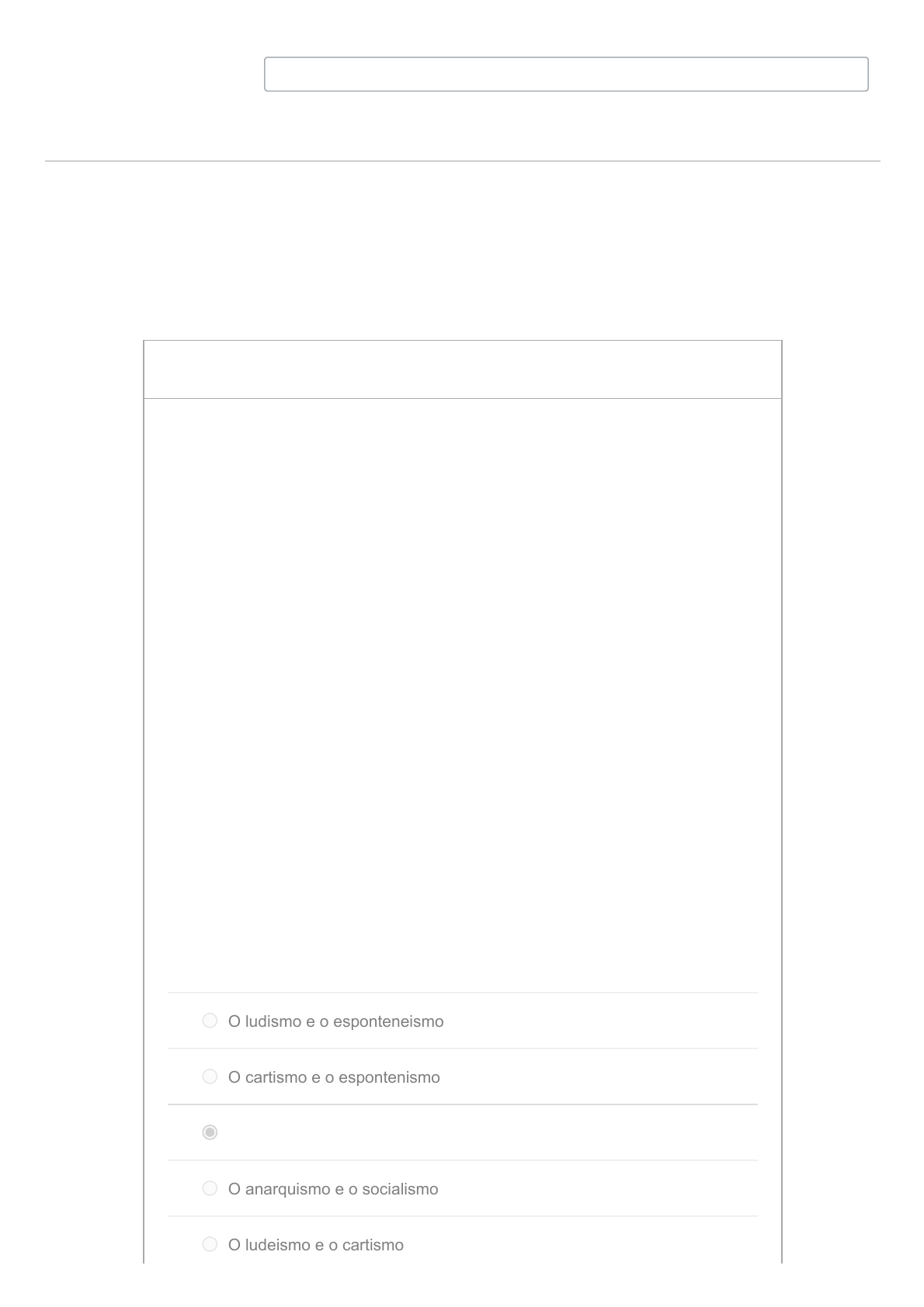 12/06/2021 ELIZA BORBA, histórico de teste: Prova Eletrônica https://dombosco.instructure.com/courses/4122/quizzes/18077/history?version=2 1/10 Seu Progresso: 100 % Prova Eletrônica Resultados para ELIZA BORBA As respostas corretas estarão disponíveis em 14 jun em 0:00. Pontuação desta tentativa: 30 de 30 Enviado 12 jun em 12:48 Esta tentativa levou 21 minutos. 3 / 3 ptsPergunta 1 O capitalismo industrial, conhecida como a fase da consolidação do capitalismo. A característica principal desta fase é o avanço tecnológico com a invenção da maquina a vapor, propiciou mudanças significativas na economia e nas relações sociais. Foi a partir deste momento que a classe trabalhadora se reconhece enquanto classe e de forma ainda pulverizada inicia a busca por melhores condições de trabalho. Destaca-se dois movimentos importantes da classe trabalhadora, sendo eles: O ludismo e o esponteneismo O cartismo e o espontenismo O ludismo e o cartismo O anarquismo e o socialismo O ludeismo e o cartismo 12/06/2021 ELIZA BORBA, histórico de teste: Prova Eletrônica https://dombosco.instructure.com/courses/4122/quizzes/18077/history?version=2 2/10 3 / 3 ptsPergunta 2 É desafiador para o assistente social decifrar a realidade e não ser um mero profissional executor, mas sim criativo e propositivo na busca de alternativas “capazes de preservar e efetivar direitos, a partir de demandas emergentes no cotidiano” ( IAMAMOTO, 1b,p.20 apud MEIRELLES, 2018, p. 146). De que forma o assistente social deverá atuar para o enfrentamento da questão social na atualidade? Assinale a alternativa correta: O profissional assistente social precisa construir mediações para a leitura da realidade de forma critica e conservadora quando necessário O profissional assistente social precisa construir mediações para a leitura da realidade de forma critica e naturalizar a questão social O assistente social precisa atender aos interesses lhe é posto, pautados no seu projeto ético político de forma acrítica O profissional assistente social precisa construir mediações para a leitura da realidade de forma critica e atender ao seu projeto ético político 12/06/2021 ELIZA BORBA, histórico de teste: Prova Eletrônica https://dombosco.instructure.com/courses/4122/quizzes/18077/history?version=2 3/10 O profissional assistente social precisa apresentar alternativas, buscando de forma critiva e propositiva mudanças garantindo o enfrentamento da nova questão social. 3 / 3 ptsPergunta 3 A questão social surge para designar o fenômeno do pauperismo. Porem as manifestações da questão social já existiam em modo de produção anteriores, porem nenhuma antes devido ao processo de expropriação da mais valia, mas sim estavam relacionados a ... A ausência da classe assalariada A pobreza de recursos monetários para aquisição de terras As intempéries climáticas, escassez de produtos, a posse de terra através de guerras,pestes, epidemias no período feudal por exemplo A ausência do Estado na intervenção da questão social Nenhuma das alternativas 3 / 3 ptsPergunta 4 12/06/2021 ELIZA BORBA, histórico de teste: Prova Eletrônica https://dombosco.instructure.com/courses/4122/quizzes/18077/history?version=2 4/10 O homem é detentor dos recursos naturais e a transforma para sua subsistência. Para tal ação o ser humano constrói ferramentas necessárias para suprir as suas necessidades mais básicas como: alimentação, vestuário, habitação entre outros. As ferramentas cooperam para a extração dos recursos naturais. Podemos afirmar que: As ferramentas são os meios de produção, o qual o ser humano faz uso para a extração dos recursos naturais. As ferramentas são os modos de produção. Na organização da sociedade feudal, quem detém os meios de produção é a nobreza As ferramentas são os meios de produção, o qual o ser humano faz uso para não extração dos recursos naturais As ferramentas são os modos de produção, o qual o ser humano faz uso para a extração dos recursos naturais As ferramentas não são os meios de produção. Na organização da sociedade feudal, os vassalos detém os recursos naturais 3 / 3 ptsPergunta 5 12/06/2021 ELIZA BORBA, histórico de teste: Prova Eletrônica https://dombosco.instructure.com/courses/4122/quizzes/18077/history?version=2 5/10 O neoliberalismo no Brasil se baseia no Consenso de Washington o qual estabelece a necessidade de reforma do Estado, fragilizando o trabalho, gerando o desemprego e o desmonte das políticas sociais conquistadas. Sobre o neoliberalismo podemos afirmar que: O neoliberalismo prevê o Estado mínimo. O mercado fica acima de tudo e em conseqüência há o favorecimento da liberdade total do mercado O neoliberalismo prevê o Estado máximo. O mercado fica acima de tudo e em conseqüência há o favorecimento da liberdade total do mercado O neoliberalismo prevê o ampliação de políticas sociais, reconhecendo a necessidade de atender os interesses da classe trabalhadora O neoliberalismo potencializa a fragilização das relações de trabalho com a flexibilização o que requer uma intervenção estatal acima de tudo para superar a Questão Social Nenhuma das alternativas 3 / 3 ptsPergunta 6 12/06/2021 ELIZA BORBA, histórico de teste: Prova Eletrônica https://dombosco.instructure.com/courses/4122/quizzes/18077/history?version=2 6/10 O capitalismo monopolista marca a sua ampliação. Qual a principal característica da fase monopolista? O capitalismo monopolista significa o controle de várias empresas nas mãos de capitalistas ou da classe dominante, os quais passam a manter o controle de mercados. O capitalismo monopolista significa o controle de várias empresas nas mãos de capitalistas ou da classe dominante, os quais passam a manter o controle dos horários e da vida particular da classe trabalhadora. O capitalismo monopolista significa o controle dos capitalistas em relação a classe dominante. Passam a controlar