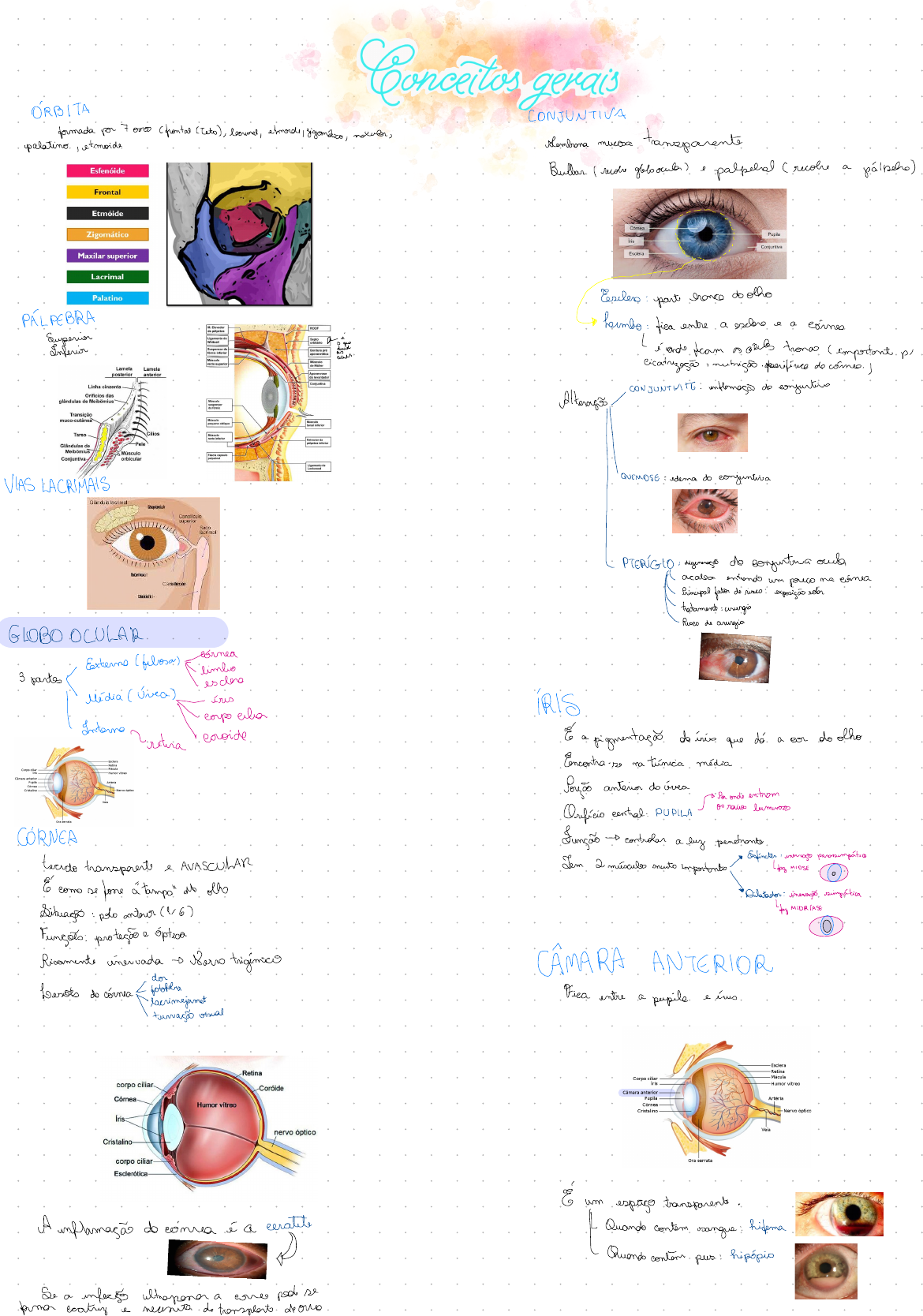 ÓRBITA CONJUNTIVA formada por 7 anos ( frontal teto) , baumel , etmrdel zigomático , maior , palatino , etmoide Membrana mucosa transparente Bulbar ( nada glelooula ) e palpebral ( recobre a pálpebra) , _ - - o \ í : I I µ i [ . . - i Eselea : parte dono do olho PÁLPEBRA a fermbo : fica entre a escbo e a córnea Superior Fim Inferior wÉ ( é onde ficam os óculos tronco ( importante p , cicatrização , nutrição . danifica de córnea . ) Alterava✓ CONJUNTVITE : mtbmezao de conjuntivo VIAS LACRIMAIS µ se ama . consinta PTERÍGIO : degeneração de conjuntura aula acaba entrando um pouco na córnea Principal fator de risco : exposição solar[ tratamentojugoRisco de GLOBO OCULAR as partes } Eterno ( tem"ÊIesdoo Média ( Úvea)- íris ÍRIS\ corpo ala Interno pref} eoroide É a pigmentação do íris que dá a cor do olho Encontra - se na túnica média fogão anterior da área para onde entram Orifício central : PUPILA os raios luminosos CÓRNEA Função → controlar a luz penetrante • Esfíncter : mengo parassimpáticotecido transparente e AVASCULAR Tem 2 músculos muito importante / ldazmose É como se fosse átampo" do olho ↳Dilatada : inovação simpática Situação : pelo anterior ( l 6) 4oz midríase Funções : proteção e óptica Ricamente inovada → Novo trigêmeo CÂMARA ANTERIOR der Lesões de córnea E fotofobia\ eaerimejamet Fica entre a pupila e éreis\ turvação visual É um espargo transparente . A wnflamazão da córnea é a ceratite L Quando contem sangue : hifema µ ( Quando contam pus : hipópio Se o infecto ultrapassa a como pode se torna caatuz e necessita de transplante de ovo CRISTALINO HUMOR VÍTREO fica atrás da Íris rfonspaet 80% do nosso olho é composto por ele É a lantbiconvexo de Évm gel claro e avascular ( 213 solene ) µ nosso olho Membrana externa : hialode Composição -099% água ; 1% colágeno e ácido hialurônico Função : manutenção de transparência e da forma do olho[ www..am . mas www.gawÉ suspenso por ligamentos Czônulats Função : acomodação ( focalização dos raios luminosos sobre a retina) - lo conforme envelhecemos, Otvtpvvtç - opaáfioazão do cristalino esse garfo liquifioasão ( fica líquido ) e vai descolado da retina , gerando fragmentos que são as " moscas valentes "¢.ie?::.:::m.m:::::::.-...i .Outras : trauma , congênito . . . Não confundir com pterígio B nervoso ) Lem IO camada Situação : 213 posturas Q cristalino é sustentado por lgemento Czônelo ) a Poção sensorial : fotorreceptora Se houver uma fãgldde ou ruptura , pode haver : Paso não- neural : epitélio pigmentado JOE Pagão neural : fotorreceptoras , células bipolares ( Modem) e células gengeionãs ( 2° ordem) Subluxação causas : Síndrome de Mt Em deslocamento do cristalino Mofam 01 mácula : é onde fica nona vrsão nítido . fusões aídennuem a nona visão ( Ex : toxoplasmose A zônule liga o cristalino aos tu Processo Ciliar congênito ) -Ar Ea Pm - Função : Posição intermediária . f Acomodação : másculo ela jãomodgão do áveh Ef e Produção vai perdendo confuso o envelhecimento . do JAE%EFjeoy.FIQuimono jaaquoso circulação : separam Eh tb "cãmaorsteiaÊI Fotorreceptores [ cones # cogãaebãnseãuadenaolmhãoãeodesbalanço entre Função (onde é únicos fotorreceptores na fãua a produção e a drenado visão de detalhes e CORES drenagem , a ( nutrir o cristalino (canal pressão ocular pode e córnea ; remoção de de subir ftp.YIEamamtenoosehbmm) bastonetes T 120 milhões em cada olho DA | Predominam na periferia netuniano Glaucoma | Muito sensíveis ãeuzVisão noturna e orientação visual NERVO ÓPTICO Composto por febres gongeonas daquele olho COROIDE Comprimento total : 5- 6cm Túnica média Duiddoemh partes : pagão intraocular ( 1mm ) j orbital ( 25mm ) , Pagão posterior da área intraeanalieulal 10mm) ; intracraniana 116mm? . Função : nutrir parte da retina nonervo óptico \ ÓRBITA " caridade em forma de pirâmide formada pela junção de 7- ossos : frontal; maxilar; lacrimal : palatino, zigomático ; esfenoide e etmoide Inervação -0 VCNC) - nervo trigêmeo ; ramos oftálmica e maior Irrigação artéria oftálmica e maxilar (ramosartéria carótida interna e externa) Drenagem- veia oftálmica einhaorbitalcra- nos das veias jugular interna e externa. Possui abertura para a passagem de nervos e São embainhados por fáseias contínuas com re - vasos sanguíneos vestimento ocular cápsula deEnem) junto os inseto qssuo abdal supera e enfiar → menos sensiti - Lados os músculos têm sua inserção no anel vos e motores ex- taaueas deZim ápice ooitãio) - Só o oblíquo inferior tem Canal óptico -6 mero óptico e artéria oftáemio . inserção diferente na parte anterior da órbita . Além do globo aulas a ãhto também tem flósculo Retos •assinemos , gordura , músculo e outros componentes . Lp DNA Quando ocorre inflamação , tumoração, pode haver rápido Retos verticais Retos Horizontais(Superior e inferior) ( modal e lateral ) aumento do volume orbitária atrás do olho inaptos, pf j LL SER Mh causa + comum para Doença de Graves elevação abaixando adução çebdodusãos dos olhos dos olho Cpdoãteur vai pro ladoLa doença autoimune Enjoado) temporal ' relacionada ao hipertireoidismo pqp Jogão dos olhos - slésãbs Oblíquos * D- Oblíquo superior Oblíquo inferno& a origem no anel parede medial de zum e passa pelo tradoChade medial supera) Essa inflamação pode levar a diversos sinais e sintomas : O reto medial é o que possui a inseri Proploãe → ou exoftalmo ação mais próxima de córnea . Porisso , durante D.úpeopiono visão dupla a cirurgia de vpterígio deve - se tomar cuidado Da • intumescência tecidual outrora - para não lesar o reto medeal . posição corneana Estrabismo convergente MÚSCULOS EXTRAOCULARES ( ou esotnorie) Controlam os movimentos oculares Hretoscsupeua , auferir , medial e lateral) 2. oblíquas ( superior e inferior) / Másculos palpebais 