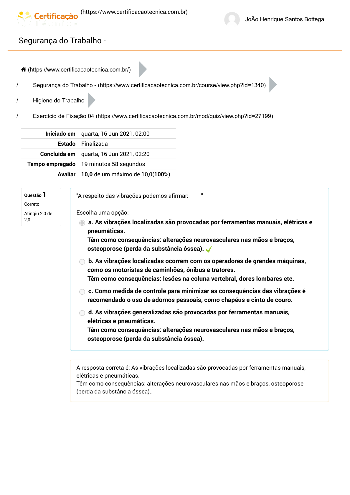 (https://www.certificacaotecnica.com.br) JoÃo Henrique Santos Bottega Segurança do Trabalho - Questão 1 Correto Atingiu 2,0 de 2,0 / / / Iniciado em quarta, 16 Jun 2021, 02:00 Estado Finalizada Concluída em quarta, 16 Jun 2021, 02:20 Tempo empregado 19 minutos 58 segundos Avaliar 10,0 de um máximo de 10,0(100%) "A respeito das vibrações podemos afirmar:_____" Escolha uma opção: a. As vibrações localizadas são provocadas por ferramentas manuais, elétricas e pneumáticas. Têm como consequências: alterações neurovasculares nas mãos e braços, osteoporose (perda da substância óssea). b. As vibrações localizadas ocorrem com os operadores de grandes máquinas, como os motoristas de caminhões, ônibus e tratores. Têm como consequências: lesões na coluna vertebral, dores lombares etc. c. Como medida de controle para minimizar as consequências das vibrações é recomendado o uso de adornos pessoais, como chapéus e cinto de couro. d. As vibrações generalizadas são provocadas por ferramentas manuais, elétricas e pneumáticas. Têm como consequências: alterações neurovasculares nas mãos e braços, osteoporose (perda da substância óssea). A resposta correta é: As vibrações localizadas são provocadas por ferramentas manuais, elétricas e pneumáticas. Têm como consequências: alterações neurovasculares nas mãos e braços, osteoporose (perda da substância óssea).. (https://www.certificacaotecnica.com.br/) Segurança do Trabalho - (https://www.certificacaotecnica.com.br/course/view.php?id=1340) Higiene do Trabalho Exercício de Fixação 04 (https://www.certificacaotecnica.com.br/mod/quiz/view.php?id=27199) https://www.certificacaotecnica.com.br/ https://www.certificacaotecnica.com.br/ https://www.certificacaotecnica.com.br/course/view.php?id=1340 https://www.certificacaotecnica.com.br/mod/quiz/view.php?id=27199 Questão 2 Correto Atingiu 2,0 de 2,0 Questão 3 Correto Atingiu 2,0 de 2,0 Questão 4 Correto Atingiu 1,0 de 1,0 São exemplos de radiações não ionizantes, EXCETO: Escolha uma opção: a. Radiação ultravioleta (UV) b. Radiação infravermelha (IV) c. Radiações provenientes da luz solar d. Radiação gama (γ) A resposta correta é: Radiação gama (γ). É um exemplo de radiação ionizante: Escolha uma opção: a. Radiação ultravioleta (UV) b. Radiação alfa (α) c. Radiação infravermelha (IV) d. Radiações provenientes da luz solar A resposta correta é: Radiação alfa (α). São exemplos de agentes do risco biológico, EXCETO: Escolha uma opção: a. Fungos b. Bactérias c. Animais domésticos d. Protozoários A resposta correta é: Animais domésticos. Questão 5 Correto Atingiu 1,0 de 1,0 Questão 6 Correto Atingiu 2,0 de 2,0 "São práticas seguras durante o manuseio de agentes biológicos, EXCETO:_____" Escolha uma opção: a. Deve-se utilizar calçados de segurança com bico de aço. b. O responsável do laboratório deve garantir e assegurar que todos tomem conhe cimento dos riscos e saibam aplicar as práticas e os procedimentos descritos no manual de segurança. c. Evitar o uso de lentes de contato no ambiente de trabalho. d. Deve ser adotado um manual de segurança e/ou procedimentos nos locais de trabalho. A resposta correta é: Deve-se utilizar calçados de segurança com bico de aço.. São considerados riscos físicos, EXCETO: Escolha uma opção: a. Pressões anormais b. Ruídos c. Calor e frio d. Poeiras minerais A resposta correta é: Poeiras minerais.