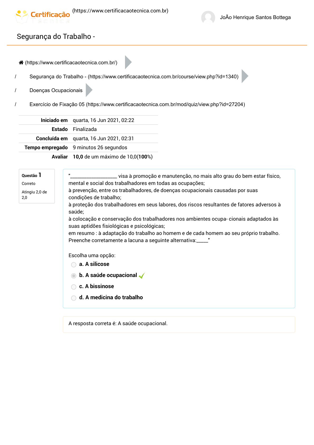 (https://www.certificacaotecnica.com.br) JoÃo Henrique Santos Bottega Segurança do Trabalho - Questão 1 Correto Atingiu 2,0 de 2,0 / / / Iniciado em quarta, 16 Jun 2021, 02:22 Estado Finalizada Concluída em quarta, 16 Jun 2021, 02:31 Tempo empregado 9 minutos 26 segundos Avaliar 10,0 de um máximo de 10,0(100%) "____________________ visa à promoção e manutenção, no mais alto grau do bem estar físico, mental e social dos trabalhadores em todas as ocupações; à prevenção, entre os trabalhadores, de doenças ocupacionais causadas por suas condições de trabalho; à proteção dos trabalhadores em seus labores, dos riscos resultantes de fatores adversos à saúde; à colocação e conservação dos trabalhadores nos ambientes ocupa- cionais adaptados às suas aptidões fisiológicas e psicológicas; em resumo : à adaptação do trabalho ao homem e de cada homem ao seu próprio trabalho. Preenche corretamente a lacuna a seguinte alternativa:_____" Escolha uma opção: a. A silicose b. A saúde ocupacional c. A bissinose d. A medicina do trabalho A resposta correta é: A saúde ocupacional. (https://www.certificacaotecnica.com.br/) Segurança do Trabalho - (https://www.certificacaotecnica.com.br/course/view.php?id=1340) Doenças Ocupacionais Exercício de Fixação 05 (https://www.certificacaotecnica.com.br/mod/quiz/view.php?id=27204) https://www.certificacaotecnica.com.br/ https://www.certificacaotecnica.com.br/ https://www.certificacaotecnica.com.br/course/view.php?id=1340 https://www.certificacaotecnica.com.br/mod/quiz/view.php?id=27204 Questão 2 Correto Atingiu 2,0 de 2,0 Questão 3 Correto Atingiu 2,0 de 2,0 Questão 4 Correto Atingiu 2,0 de 2,0 São doenças ocupacionais, EXCETO: Escolha uma opção: a. Silicose b. Sífilis c. Saturnismo d. Asbestose A resposta correta é: Sífilis. Identifique a única alternativa correta quanto à doença e sua respectiva definição: Escolha uma opção: a. Siderose: doença ocupacional que acomete os trabalhadores expostos, durante alguns anos, sem nenhuma proteção adequada, ao alumínio b. Saturnismo: doença ocupacional que acomete os trabalhadores expostos, sem nenhuma proteção adequada, durante muitos anos, ao mercúrio. c. Hidrargirismo: doença ocupacional que acomete os trabalhadores expostos, sem nenhuma proteção adequada, durante muitos anos, ao mercúrio. d. Bagaçose: doença ocupacional que acomete os trabalhadores expostos, durante alguns anos, sem nenhuma proteção adequada, às fibras do algodão. A resposta correta é: Hidrargirismo: doença ocupacional que acomete os trabalhadores expostos, sem nenhuma proteção adequada, durante muitos anos, ao mercúrio.. "Pela sua dedicação aos estudos, às doenças ocupacionais e por ter descoberto diversas doenças relacionadas ao trabalho, ficou conhecido como o pai da medicina do trabalho. Estamos falando de:_____" Escolha uma opção: a. Bernardo Ramazzum b. Bernardino Ramazzini c. Dr. Ubirajara Mattos d. Péricles, o magnífico A resposta correta é: Bernardino Ramazzini. Questão 5 Correto Atingiu 2,0 de 2,0 A doença ocupacional denominada siderose, que é uma pneumoconiose, é provocada pelo agente: Escolha uma opção: a. Óxido de estanho b. Asbestos c. Óxido de ferro d. Sílica livre A resposta correta é: Óxido de ferro.