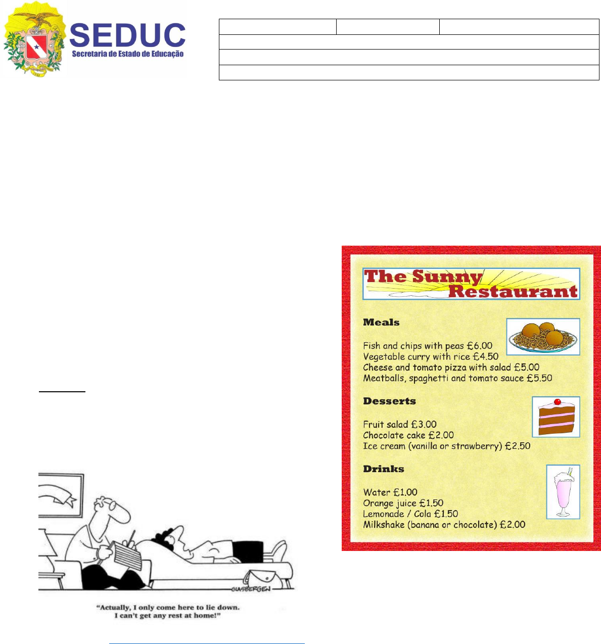 1 Tema/ Conhecimento: Simple Present e técnicas para leitura e compreensão de textos em inglês. Habilidade: Identificar o assunto de um texto para reconhecer sua organização textual, palavras cognatas, pistas gráficas, tais como elementos não verbais, distinguindo as características de diferentes textos que abordem gostos, preferências e rotinas. Compreender e utilizar o presente simples nas formas afirmativa, negativa e interrogativa, em situações reais para indicar rotina, fatos, opiniões e ações em progresso. Explorar a presença da língua inglesa em ações rotineiras e em progresso para reconhecer os elementos culturais e avaliar a influência desses elementos na sociedade e na sua formação cidadã, bem como observar a relação entre gostos e preferências de diferentes estudantes. Actitities Read the texts and answer the questions in your notebook. (Leia os textos e responda as atividades no seu caderno.) Disponível em: https://br.pinterest.com/pin/388998486563072538/ Acesso em 06 de abr. de 2020. 1ª) Podemos inferir (descobrir o significado pelo contexto) que a mulher (A) ( ) possui uma vida tranquila em sua casa. (B) ( ) tem muitos afazeres em sua casa. (C) ( ) viaja com frequência com seu parceiro. (D) ( ) visita seus familiares aos fins de semana. 2ª) Disponível em: https://learnenglishkids.britishcouncil.org/writing- practice/restaurant-menu Acesso em 17 de abr. de 2020 Ao analisarmos o texto e seus elementos constitutivos, podemos classificá-lo como: a) ( ) cartão postal, pois a imagem mostra ao destinatário o local onde se encontra o remetente. b) ( ) cardápio, pois informa e orienta o consumidor sobre pratos e produtos oferecidos no estabelecimento. c) ( ) charge, visto que retrata uma situação da atualidade com humor e refere-se ao estabelecimento. d) ( ) anúncio publicitário, visto que busca persuadir o leitor a vender produtos desse estabelecimento. Língua Inglesa 2ª Série II MÓDULO/ 1º Período PROFESSORA: PATRICIA DE SOUSA MARTINS ESCOLA: ESTUDANTE: 2 Observe as frases e a estrutura do Simple Present Daily Routine, Habits, Customs (Rotina diária, hábitos, costumes) 1- They always wake up at 7 am. (Eles sempre acordam às 7:00 da manhã.) 2- Clara has cereals for breakfast. (Clara come cereais no café da manhã.) 3- She doesn’t study in the library on Mondays. (Ela não estuda na biblioteca nas segundas-feiras.) General Facts and Truths (Fatos e verdades gerais) 1- The sun rises in the east. (O sol nasce no leste.) 2- The water boils at 100 degree Celsius.(A água ferve a 100 graus Celsius.) Emotional States, Physical and Personal Chracteristics (Estados emocionais, características físicas e pessoais) 1- Denis is a happy person. (Denis é uma pessoa feliz.) 2- He is tall. (Ele é alto.) 3- They don’t seem to be very comfortable.(Eles não parecem estar confortáveis.) 4- Jack hates chocolate(Jack odeia chocolate.) 5- Is Carlos a good teacher?(Carlos é um bom professor?) 3ª) What does a runner have? a) ( ) A runner has a lot of running clothes. b) ( ) A runner does not have running clothes. c) ( ) A runner has a lot of dresses. d) ( ) A runner has one drawer to t-shirts and skirts. Disponível em: https://www.goneforarun.com/funny-running- memes/12-funny-cartoons-about-runners.html?brand=GFAR Acesso em 31 de ago. de 2020. My daily routine Hello!! I am Sophia. I am 11 years old. My birthday is in July. I live in Catalão. I usually wake up at 6 o’clock. I have breakfast with my family. I love coffee and milk. I have a shower at 6:20. I go to school on foot. I study English at school. I like painting and I read romantic books. My mom and I always go running in the afternoon. Figura disponível em: https://www.istockphoto.com/br/vetor/ilustra%C3%A7%C3%A3o-em-vetor-de- atividades-de-rotina-di%C3%A1ria-de-crian%C3%A7as-gm947438004- 258697414 Acesso em 23 de out. de 2020. 4ª) Match the columns. (Associe as colunas.) a) How old is Sophie? b) What does Sophie love for breakfast? c) Where does Sophie study English? d) Who goes running in the afternoon? e) Where does Sophie live? ( ) She lives in Catalão. ( ) She studies English at school. ( ) She is 11 years old. ( ) Sophie and her mom go running in the afternon. ( ) She loves coffee and milk. TEXT COMPREHENSION (COMPREENSÃO DE TEXTO) Em inglês, assim como em outras línguas, a leitura é uma habilidade que pode ser desenvolvida independentemente do aprendizado da fala, da escrita e da audição. Para se entender um texto escrito em inglês, não há necessidade de saber todas as palavras e todas as estruturas de gramática presentes no texto. O mais importante é conseguir entender a idéia geral do texto, ou seja, saber qual é o tema e sua mensagem principal. Para isso, basta aprender e aplicar algumas técnicas de leitura 3 para poder explorar o texto de modo a compreendê-lo da melhor forma possível. A seguir estão listadas as técnicas para leitura e compreensão de textos em inglês. 1. Predicting – Com essa técnica você vai tentar descobrir, antes de ler o texto, o assunto tratado nele. Para isso você deve direcionar sua atenção para o título e o formato do texto. Observe qualquer figura, ilustração, título e subtítulo que acompanhe o texto. Assim você poderá adivinhar que tipo de texto e qual o assunto que ele trata. 2. Vocabulário conhecido – Ao estudar inglês aprendemos um vocabulário básico que vai sendo ampliado à medida que os estudos da língua vão avançando. Assim, muitas palavras presentes em qualquer texto são bastante conhecidas. Por exemplo, I (eu), the (o, os, a, as), and (e), of (de, do, da); além de outras que ficam gravadas em nossa memória. 3. Cognates – Cognates ou Cognatos são palavras semelhantes na ortografia e no sentido em português e inglês. Ao descobrir os cognatos você já saberá uma parte do vocabulário presente no texto já que os cognatos correspondem a 20% de todas as palavras encontradas em um texto. Por