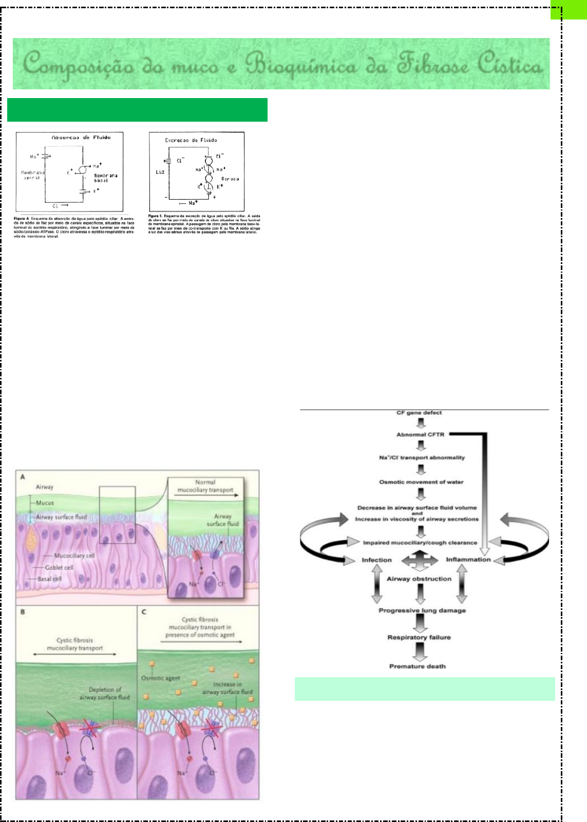 1 Beatriz Machado de Almeida Bioquímica – Aula 5 Introdução Quando se fala de absorção/excreção de fluidos, vai ser diferenciado no epitélio ciliar e nas glândulas. No epitélio ciliar, na membrana apical a gente tem um canal transportador seletivo de sódio. O cloreto entra nas células do epitélio ciliar por transporte transcelular inespecífico, ele entra junto com a água. Quem entra de maneira seletiva no epitélio ciliar é o sódio. A excreção de cloreto do epitélio ciliar é dependente de um canal específico. No epitélio glandular é diferente. A entrada de cloreto depende de um canal específico e a saída é por transporte transcelular. Existe uma relação de equilíbrio eletrolítico nesse muco pra garantir que os eletrólitos estejam dispersos no meio aquoso com uma osmolaridade semelhante a osmolaridade do plasma. Se a gente tiver entrada de sódio normal e a não saída do cloreto, vai fazer com que gere um gradiente osmótico que promoverá uma desidratação do muco. O gradiente osmótico é o aumento da desidratação de cátions e principalmente a desnaturação de proteínas, formando coagulados proteicos que vão fazer com que haja a presença de um gradiente osmótico que vai produzir um muco espesso. Isso vai se dar com a relação de mutações no canal. Existe um gene Fc ou CF que vai ser anormal, vai produzir o canal CFTR, que garante o gradiente osmótico da água tanto no epitélio glandular quanto no epitélio mucociliar. Mutação deltaF508 Proteína: bioquímica e função Proteína funcional, que vai fazer com que haja a entrada de cloreto específico no epitélio glandular. Se não houver a presença do canal ou o canal não tiver aderido a membrana, a gente vai ter a entrada de água e sódio nas células e não vai ter a saída de cloreto, levando a desidratação do muco. Composição do muco e Bioquímica da Fibrose Cística 2 Beatriz Machado de Almeida Bioquímica – Aula 5 • Nas glândulas exócrinas e no lúmen intestinal, o cloreto entra através de canal. O que vai ser prejudicada é a entrada de cloreto nas células. • No epitélio mucociliar, é a saída de cloreto que vai estar comprometida, entrando mais sódio e mais água pra dentro da célula, levando a desidratação da célula. CFTR: controla o movimento do íon cloreto dentro e fora da célula. Proteína função • O CFTR transporta íons cloreto (Cl-) através das membranas das células nos pulmões, fígado, pâncreas, aparelho digestivo, aparelho reprodutivo e pele. • O CFTR é composto por cinco domínios: • Dois domínios que abrangem a membrana (MSD1 e MSD2) que formam o canal de íons cloreto. • Dois domínios de ligação a nucleotídeos (NBD1 e NBD2) que se ligam e hidrolizam ATP (trifosfato de adenosina) • E um domínio regulador (R). O Delta F508, a mutação mais comum causadora de CF, ocorre na sequência de DNA que codifica. Alterações estruturais • O CFTR funciona principalmente como um canal de cloreto induzido por cAMP e parece capaz de regular outros canais iônicos. • Além da mutação mais comum, ΔF508, responsável por cerca de 70% dos cromossomos CF em todo o mundo, mais de 850 alelos mutantes foram relatados a CF. • Estas mutações afetam CFTR através de uma variedade de mecanismos moleculares que podem produzir pouco ou nenhum CFTR funcional na membrana apical. Proteína CFTR Quando uma proteína CFTR com a mutação delta F508 atinge o RE, o mecanismo de controle deste componente celular reconhece que a proteína é dobrada incorretamente e marca a proteína defeituosa para degradação. Como resultado, o delta F508 nunca atinge a membrana celular. As pessoas que são homozigóticas para a mutação delta F508 tendem a ter os sintomas mais graves da fibrose cística devido à perda crítica de transporte de ions cloreto. Isso perturba o equilíbrio de íon de sódio e cloreto necessário para manter a camada de muco normal e fino que é facilmente removido pelos cílios que revestem os pulmões e outros órgãos. O desequilíbrio de íons de sódio e cloreto cria uma camada de muco espessa e pegajosa que não pode ser removida pelos cílios e atrapalha as bactérias, resultando em infecções crônicas. Diagnóstico da fibrose cística Por ordem de especificidade, o diagnóstico de FC deveria ser realizado: 1. pelo achado de duas mutações no gene FC (biologia molecular), ou 2. por dois testes do suor alterados, ou 3. pela presença de pelo menos uma das seguintes manifestações clínicas epidemiológicas: Doença pulmonar obstrutiva/supurativa ou sinusal crônica • Insuficiência pancreática exócrina crônica; • História familiar de FC; 3 Beatriz Machado de Almeida Bioquímica – Aula 5 • Para o diagnóstico de FC, ainda podemos contar com a Triagem neonatal pelo método da tripsina imunorreativa (TIR). A presença da TIR vai demonstrar que existe alguma relação da saída de cloreto das glândulas que está interferindo com a catalise dessas enzimas ainda dentro dos ductos. A ITR demonstra essa relação. < 70ng/ml → Negativo > 70ng/ml → precisa ser confirmado, principalmente em relação com a idade. A partir de 30 dias, com a interferência de outros alimentos (mesmo que seja aleitamento materno exclusivo) pode fazer com que haja aumento da produção da ITR de maneira inespecífica. Se ela tiver aumentada dentro dos 30 dias, 2 x, o paciente precisa continuar o diagnóstico com o teste do suor e biologia molecular. Exames complementares na FC • Albumina, Soro; • Hemograma (leucocitose com neutrofilia); • Radiografia de tórax, diagnóstico; • Cloro no suor (aumentado); • d-xilose teste de absorção, soro ou urina (diminuído); • Eletrólitos, plasma ou soro; • Gordura nas fezes (coprológico funcional) presença; • Imunoglobulina E, Imunoglobulina G, soro; • Perfil hepático, soro; • Testes de função pulmonar; • Análise seminal (obstrução); • Escarro, Rotina, Cultura; 