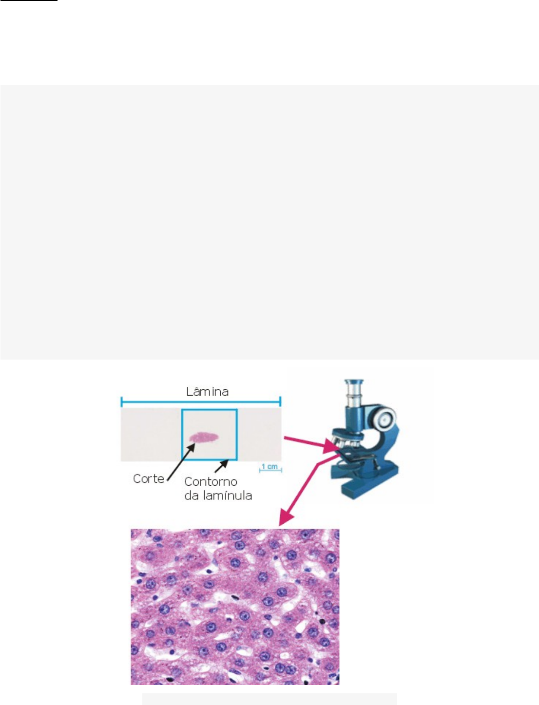Histologia Conceitos Básicos PREPARADO HISTOLÓGICO O que é um preparado histológico? Preparado histológico é uma lâmina retangular de vidro sobre a qual foram colocadas fatias extremamente finas de tecidos e órgãos. Para proteção, os cortes são cobertos por uma delgada lâmina de vidro colada à lâmina, denominada lamínula. A espessura das fatias de tecidos ou de órgãos é geralmente 5 a 10 µm de espessura, isto é, de 5 a 10 milionésimos de metro. Medidas usadas: 1 µm (1 micrômetro) = 1 milésimo de mm = 1 milionésimo de metro. Preparados histológicos permanentes são feitos para durarem muitos anos. Para a obtenção de um preparado permanente, fragmentos de tecidos e de órgãos ou células costumam passar por um processo denominado fixação. Este processo é feito por meios químicos (p. ex. com formaldeído) ou físicos (p. ex. por congelação). Os fragmentos de tecidos e órgãos são submetidos a vários procedimentos após os quais os podem ser cortados em um aparelho chamado micrótomo para obtenção das fatias que podem ser observadas em um microscópio de luz. Estas fatias são denominadas cortes histológicos. As células, assim como os cortes de tecidos e de órgãos são quase sempre incolores e precisam ser corados para que possam ser observados em um microscópio de luz. Finalmente, os cortes são cobertos por uma lamínula de vidro para sua proteção. As lâminas de vidro também são utilizadas para observação de células isoladas, bactérias, protozoários e outros objetos microscópicos. Fígado. Coloração: hematoxilina e eosina (HE). Aumento médio. PREPARADO HISTOLÓGICO VISTO AO MICROSCÓPIO A imagem é de um corte de um fígado observado ao microscópio em um aumento pequeno. Observe a grande área cor de rosa com pequenas manchas azuis, porém mais detalhes não podem ser percebidos neste aumento. Em cortes de outros órgãos observados nesse mesmo aumento, seria possível observar várias de suas estruturas características, p. ex. camadas que constituem o órgão, vasos sanguíneos e nervos calibrosos. Na imagem há muitos pequenos espaços claros. A maioria deles é o lúmen de vaso sanguíneo, isto é a cavidade central desta estrutura Fígado. Hematoxilina e eosina (HE). Vista panorâmica. UM AUMENTO MAIOR Continuando a observar imagens do mesmo corte de fígado, agora em um aumento um pouco maior, pode-se ver uma rede cor de rosa e muitos círculos azuis pequenos. São células com citoplasma cor de rosa e núcleo azulado. Há também muitos espaços vazios, brancos, de formatos muito diferentes. São lúmens de vasos capilares sanguíneos, isto é, espaços vasculares de capilares sanguíneos. Após a troca da imagem, alguns espaços vasculares aparecerão corados em verde. Fígado. Hematoxilina e eosina (HE). Aumento médio. NÚCLEO E CITOPLASMA As células predominantes no fígado são células do tecido epitelial chamadas hepatócitos. Esta imagem é um aumento grande de um corte de fígado. Observam-se vários círculos azuis ou roxos. São os núcleos dos hepatócitos. Os núcleos estão no interior do citoplasma das células. A coloração aplicada ao corte histológico que está sendo observado se denomina Hematoxilina e eosina. Após esta coloração os núcleos aparecem em cor azul-arroxeada e o citoplasma corado em rosa. Esta é a coloração mais utilizada para observar cortes histológicos. Na secção final deste módulo haverá mais informações sobre coloração de cortes. Fígado. Coloração: HE. Aumento grande. Note que os hepatócitos se organizam em forma de colunas ou cordões. Em cortes estes cordões aparecem como células enfileiradas, mas na verdade são placas tridimensionais de hepatócitos. Mais adiante veremos que os cortes muito delgados de estruturas tridimensionais necessitam ser adequadamente interpretados para se conhecer a verdadeira estruturação das células nos tecidos e órgãos. Entre as placas de hepatócitos há espaços por onde passa sangue. A barra situada na porção inferior direita da figura mede 20 μm. NÚCLEOS DE OUTROS TIPOS CELULARES Ao examinar um preparado histológico é importante prestar atenção nos inúmeros detalhes da imagem. Notou que além dos núcleos esféricos dos hepatócitos há núcleos de outros tipos celulares? Estão geralmente corados mais intensamente que os núcleos dos hepatócitos e a forma deles nem sempre é circular. FÍgado. Coloração: HE. Aumento grande NUCLÉOLOS E CROMATINA Os nucléolos são visíveis sob a forma de objetos circulares intensamente corados em azul (após coloração por hematoxilina e eosina) no interior dos núcleos. Cada núcleo pode ter vários nucléolos. No entanto, nem todos são vistos nos cortes por que alguns estão presentes nas porções dos núcleos que ficaram fora dos cortes. Os nucléolos são relativamente grandes comparados com grânulos de heterocromatina. . Fígado. Coloração: HE. Aumento grande. Além dos nucléolos, os núcleos contêm pequenos grânulos de formas e tamanhos muito variáveis que são parte da cromatina condensada. Os cromossomos desta parte de cromatina estão muito espiralizados e formam a heterocromatina. O restante do núcleo se cora em azul claro, de maneira homogênea e sem grânulos. Esta porção é formada de cromatina descondensada, cujos cromossomos estão em grande parte desespiralizados, constituindo a eucromatina. Núcleos que contêm grande quantidade de heterocromatina são muito corados e são chamados núcleos de cromatina densa. Vários dos núcleos de não-hepatócitos presentes na imagem têm cromatina densa. São núcleos geralmente alongados situados nas paredes dos espaços sanguíneos. Núcleos em que predomina eucromatina têm coloração mais clara e são chamados núcleos de cromatina frouxa. Os núcleos dos hepatócitos são geralmente de cromatina frouxa. LIMITES CELULARES-1 Em esquemas e desenhos de tecidos e órgãos sempre vemos as células com seus l