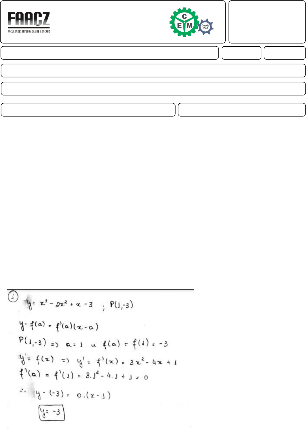 1 Mantenedora: FUNDAÇÃO SÃO JOAO BATISTA Curso de Engenharia Mecânica PROFESSOR: SOLANO MARTINAZZI GARCIA DATA DE ENTREGA: 09/05/2021 ALUNO: MATHEUS NASCIMENTO DOS SANTOS ALUNO: MATHEUS BALBI RAMPINELLI TURMA: 1ºCEM VALOR: 3,0 ATIVIDADE: 2º TRABALHO DE FUNDAMENTOS DE CÁLCULO I (para NB1) 2º TRABALHO DE FUNDAMENTOS DE CÁLCULO I. Este trabalho pode ser feito em duplas e valerá 3,0 pontos na nota NB1. Cada dupla deverá entregar/enviar o trabalho até o dia 09/05/21. Caso o trabalho seja entregue por vias digitais, resolvam as questões em folhas A4, fotografe ou escaneie e cole as resoluções de cada uma das questões neste documento no formato Word e converta para pdf para ser inserido no portal FAACZ VIRTUAL, em local a ser indicado. SOMENTE SERÃO ACEITOS TRABALHOS NO FORMATO PDF. Estas informações e arquivos em pdf foram disponibilizadas no AVA (Ambiente Virtual de Aprendizagem / Plataforma Moodle). Em todas as questões deverão estar registrados os cálculos, e estarem corretos, caso contrário, serão anuladas. Trabalhos que apresentarem cópias de parciais ou integrais de outros trabalhos poderão ter suas notas anuladas ou reduzidas. 1) (0,5) Determine a equação da reta tangente à curva definida pela função y = x3 – 2x2 + x – 3 no ponto P(1, –3). NOTA: 2 2) (0,5 cada item) Calcule a derivada primeira de cada uma das funções: a) x 4 xy 5 3 += b) )x2cos(.x)x(tg2 x 5 y 3 +−= c) 2x 1x2x y 2 − +− = 3 d) 52 )8x3x(y +−= e) 2y3 + 5xy – 3x4 – 4x2 + 7x + 8 = 0