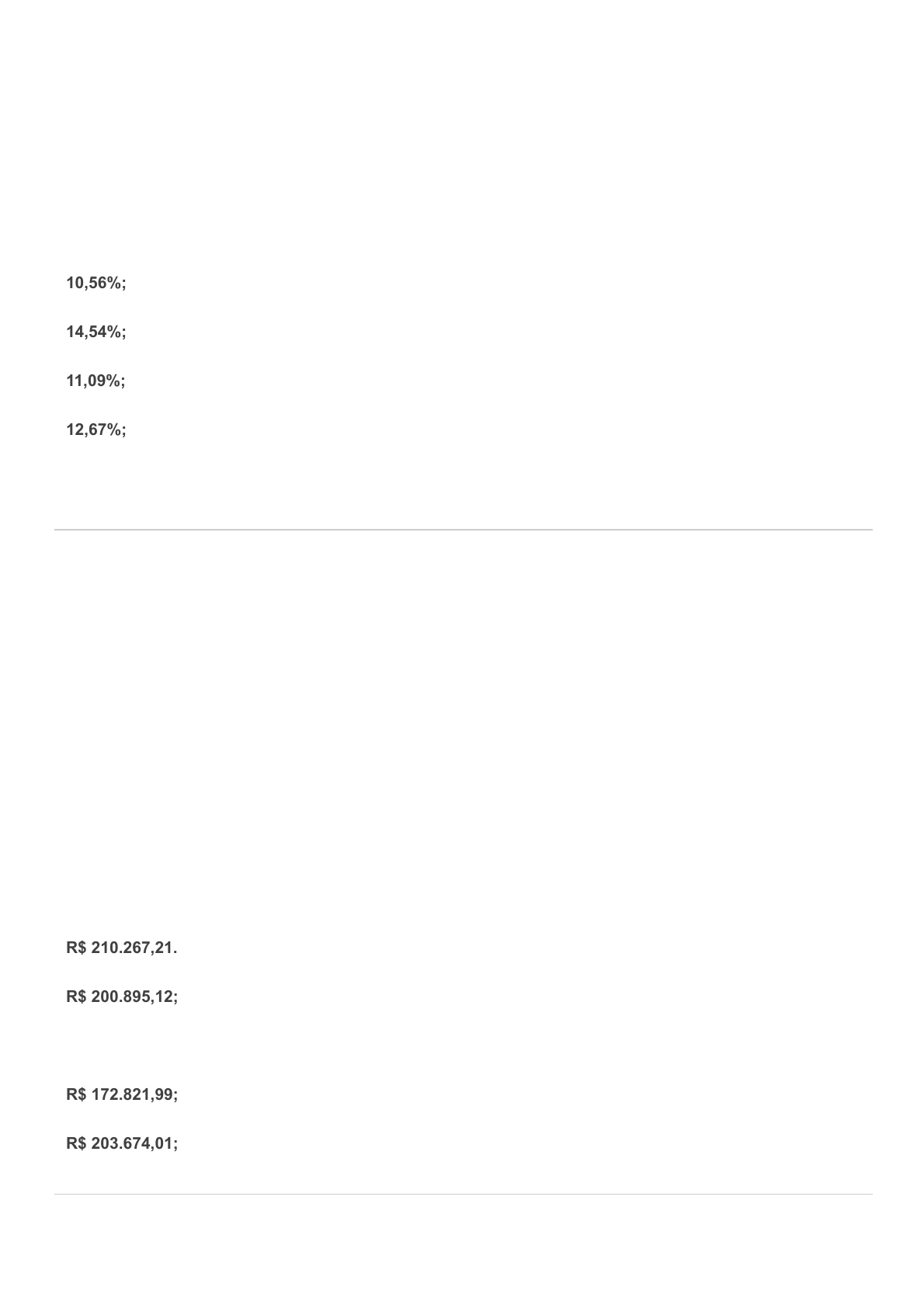 15/05/2021 Comentários https://sereduc.blackboard.com/ultra/courses/_50210_1/outline/assessment/_3428464_1/overview/attempt/_12195945_1/review/inline-feedback?… 1/6 Ocultar opções de resposta Ocultar opções de resposta Pergunta 1 -- /1 Paulo investiu R$350.000,00 em um fundo de investimento, a juros compostos, durante três anos e obteve um total de R$ 551.386,00; no entanto, após ler seu contrato, não encontrou essa taxa de juros anual. Após realizar cálculos referentes a essa transação ele constatou que ela era igual a: 10,56%; 14,54%; 11,09%; 12,67%; Resposta correta16,36%. Pergunta 2 -- /1 Um título de renda fixa administrado pelo governo federal, paga de acordo com uma taxa composta pré-fixada de 12% ao ano; com o objetivo de aplicar a maior quantidade possível, Simone aplicou R$85.000,00 durante cinco anos. Qual o valor a ser retirado após esse período? R$ 210.267,21. R$ 200.895,12; Resposta corretaR$ 149.799,04; R$ 172.821,99; R$ 203.674,01; 15/05/2021 Comentários https://sereduc.blackboard.com/ultra/courses/_50210_1/outline/assessment/_3428464_1/overview/attempt/_12195945_1/review/inline-feedback?… 2/6 Ocultar opções de resposta Ocultar opções de resposta Pergunta 3 -- /1 A taxa ____________________ se caracteriza quando o valor presente, considerado na base de cálculo, não indica o valor realmente recebido ou desembolsado, assim é considerada uma taxa aparente. Marque a alternativa que melhor preencheria esta lacuna. proporcional; Resposta corretanominal. percentual; real; efetiva; Pergunta 4 Crédito total dado -- /1 Com o objetivo de realizar a uma viagem pela Europa, Mariana planeja alcançar um montante de R$30.000,00, regido por uma taxa de juros composto igual a 4,26% a partir de um capital inicial de R$20.000,00. Quanto tempo será necessário para capitalizar esse valor? 8 bimestres; 8 trimestres; 8 quadrimestres. Resposta correta8 anos; 8 meses; 15/05/2021 Comentários https://sereduc.blackboard.com/ultra/courses/_50210_1/outline/assessment/_3428464_1/overview/attempt/_12195945_1/review/inline-feedback?… 3/6 Ocultar opções de resposta Ocultar opções de resposta Pergunta 5 -- /1 “A __________________ é uma importante ferramenta para tomada de decisões financeiras com coerência, uma vez que possibilita selecionar planos de empréstimos e financiamentos, assim como avaliar propostas de refinanciamento.” Assinale a alternativa que preenche corretamente esta lacuna. comparação estatística. capitalização mista; equidade monetária; rentabilidade; Resposta corretaequivalência financeira; Pergunta 6 -- /1 Paulo possui dois títulos de valores correspondentes a R$ 12.896,43 e R$15.742,89 que possuem vencimentos programados para 5 e 7 meses, nessa ordem. Considerando a capitalização composta de 3,5%, é possível afirmar que esses capitais são: proporcionais; Incorreta: exponenciais; lineares; equivalentes 15/05/2021 Comentários https://sereduc.blackboard.com/ultra/courses/_50210_1/outline/assessment/_3428464_1/overview/attempt/_12195945_1/review/inline-feedback?… 4/6 Ocultar opções de resposta Ocultar opções de resposta Resposta corretanão equivalentes; Pergunta 7 -- /1 Um capital de R$15.000,00 foi aplicado sob o regime de juros simples durante certo de tempo, sob taxa de juros equivalente a 1,8% a.m., obtendo um montante de R$ R$17.160. Assinale a alternativa que indica aproximadamente quantos meses foi aplicado este capital. 7. 11; Resposta correta8; 9; 10; Pergunta 8 -- /1 Após a venda de certo imóvel, Cleber optou em investir tal valor e, após sete anos, regido por uma taxa simples de 18% ao ano, oportunizou uma quantia igual a R$318.547,39. Assim, é possível afirmar que a quantia investida era de: R$50.089,12; R$ 80.113,08; R$76.107,84; 15/05/2021 Comentários https://sereduc.blackboard.com/ultra/courses/_50210_1/outline/assessment/_3428464_1/overview/attempt/_12195945_1/review/inline-feedback?… 5/6 Ocultar opções de resposta Ocultar opções de resposta R$60.990,21; Resposta corretaR$ 140.950,17 Pergunta 9 -- /1 Taxas proporcionais possibilitam a obtenção de montantes iguais, quando aplicados a um mesmo capital ao término de um período pré-estabelecido. Assim, uma taxa de 21% ao trimestre é proporcional a: 42% a.b.; 10,5% a.m.; 0,35% a.d.. Resposta correta84% a.a.; 63% a.s.; Pergunta 10 -- /1 Um mesmo quantitativo de capital igual R$ 3.500,00 foi aplicado em seis meses em regimes de capitalização simples, mas distintos quanto à taxa de juros; um foi aplicado a uma taxa mensal de R$1,25% e o outro a uma taxa trimestral de 3,64%. Sobre o montante resultante, assinale a alternativa correta. Regido pela taxa mensal o montante é de R$3.678,50, enquanto a taxa trimestral gera um montante de R$3.754,80; 15/05/2021 Comentários https://sereduc.blackboard.com/ultra/courses/_50210_1/outline/assessment/_3428464_1/overview/attempt/_12195945_1/review/inline-feedback?… 6/6 R$3.754,80; Regido pela taxa mensal o montante é de R$3.762,50, enquanto a taxa trimestral gera um montante de R$3.756,80; Resposta correta Regido pela taxa mensal o montante é de R$3.762,50, enquanto a taxa trimestral gera um montante de R$3.754,80; Regido pela taxa trimestral o montante é de R$3.762,50, enquanto a taxa mensal gera um montante de R$3.754,80; Os montantes resultantes são iguais
