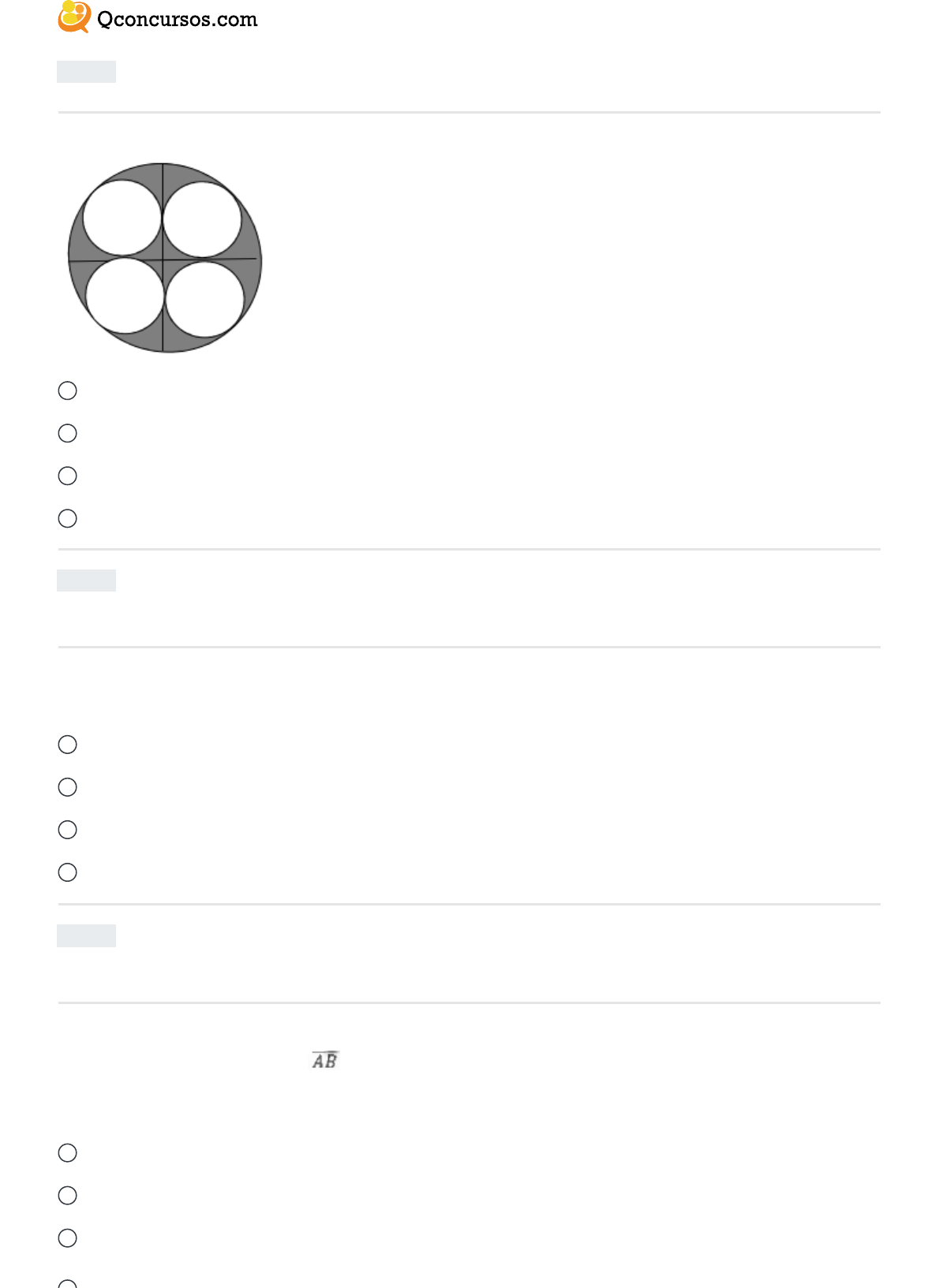 www.qconcursos.com Ano: 2016 Banca: FUMARC Órgão: Câmara de Igarapé - MG Considere a circunferencia de raio R e quatro circunferencias de raio r todas tangentes entre si conforme a �gura abaixo. Nessas condições, é CORRETO a�rmar que, se R = r (√2+ 1), para R = 2 cm, a área sombreada na �gura, em cm , equivale a: A 4π (1 + √2 ) B 4π (8√2 -11) C 6π (4 - 2 √2 ) D 8π (1 + 8√2 ) Ano: 2018 Banca: IBADE Órgão: Prefeitura de Manaus - AM Um projeto urbanístico de Manaus consiste na construção e reforma de diversas áreas de lazer. Em uma determinada praça, será construído um jardim em forma de circunferência de equação x² - 6x + 9 + y ² - 4x = 0. Nesta circunferência será traçada uma corda AB cujo ponto médio é o ponto P(3,3). O comprimento AB (em unidades de comprimento) é igual a: A 3. B 2√3. C 2√2. D √3. Ano: 2018 Banca: IBADE Órgão: Prefeitura de Manaus - AM João desejava fazer o desenho de uma circunferência, cujo centro C é ponto do 2² quadrante do Plano Cartesiano. Esta circunferência também deverá ser tangente ao eixo das ordenadas e possuir obrigatoriamente 2 pontos de intersecção (A e B) com o eixo das abscissas, sendo = 6 cm. Ao iniciar o seu esboço percebeu que o centro C desta circunferência poderia estar em inúmeros lugares distintos deste Plano. Desta forma, pode-se a�rmar que o lugar geométrico de todos os pontos, onde C poderia estar localizado é uma: A elipse. B reta. C hipérbole. 96 Q1336141 > Matemática Geometria Analítica , Circunferências Prova: FUMARC - 2016 - Câmara de Igarapé - MG - O�cial Legislativo 2 97 Q1336115 > Matemática Geometria Analítica , Circunferências Prova: IBADE - 2018 - Prefeitura de Manaus - AM - Professor de Matemática 98 Q1336090 > Matemática Geometria Analítica , Circunferências Prova: IBADE - 2018 - Prefeitura de Manaus - AM - Professor de Matemática https://www.qconcursos.com/ https://www.qconcursos.com/questoes-de-concursos/bancas/fumarc https://www.qconcursos.com/questoes-de-concursos/institutos/camara-de-igarape-mg https://www.qconcursos.com/questoes-de-concursos/bancas/ibade https://www.qconcursos.com/questoes-de-concursos/institutos/prefeitura-de-manaus-am https://www.qconcursos.com/questoes-de-concursos/bancas/ibade https://www.qconcursos.com/questoes-de-concursos/institutos/prefeitura-de-manaus-am https://www.qconcursos.com/questoes-de-concursos/questoes/44d39e39-d7 https://www.qconcursos.com/questoes-de-concursos/disciplinas/matematica-matematica https://www.qconcursos.com/questoes-de-concursos/disciplinas/matematica-matematica/geometria-analitica https://www.qconcursos.com/questoes-de-concursos/disciplinas/matematica-matematica/circunferencias https://www.qconcursos.com/questoes-de-concursos/provas/fumarc-2016-camara-de-igarape-mg-oficial-legislativo https://www.qconcursos.com/questoes-de-concursos/questoes/241262b3-d7 https://www.qconcursos.com/questoes-de-concursos/disciplinas/matematica-matematica https://www.qconcursos.com/questoes-de-concursos/disciplinas/matematica-matematica/geometria-analitica https://www.qconcursos.com/questoes-de-concursos/disciplinas/matematica-matematica/circunferencias https://www.qconcursos.com/questoes-de-concursos/provas/ibade-2018-prefeitura-de-manaus-am-professor-de-matematica https://www.qconcursos.com/questoes-de-concursos/questoes/238728a9-d7 https://www.qconcursos.com/questoes-de-concursos/disciplinas/matematica-matematica https://www.qconcursos.com/questoes-de-concursos/disciplinas/matematica-matematica/geometria-analitica https://www.qconcursos.com/questoes-de-concursos/disciplinas/matematica-matematica/circunferencias https://www.qconcursos.com/questoes-de-concursos/provas/ibade-2018-prefeitura-de-manaus-am-professor-de-matematica D parábola. Ano: 2014 Banca: IDECAN Órgão: EBSERH Mário começou a praticar um novo jogo que adquiriu para seu vídeo-game. Considere que a cada partida ele conseguiu melhorar sua pontuação, equivalendo sempre a 15 pontos a menos que o dobro marcado na partida anterior. Se na quinta partida ele marcou 3.791 pontos, então, a soma dos algarismos da quantidade de pontos adquiridos na primeira partida foi igual a A 4. B 5. C 7. D 8. E 10. Ano: 2020 Banca: COTEC Órgão: Prefeitura de São Francisco - MG Os pontos A(6,0), B(6,3) e C(2,3) são as coordenadas dos vértices de um triângulo ABC. Com base nessas informações, é CORRETO a�rmar que o perímetro, em centímetro, do triângulo ABC é: A 21 cm. B 20 cm. C 18 cm. D 15 cm. E 12 cm. Respostas 96: B 97: B 98: C 99: D 100: E www.qconcursos.com 99 Q1330660 > Matemática Geometria Analítica , Pontos e Retas Provas: IDECAN - 2014 - EBSERH - Assistente Social ... 100 Q1326400 > Matemática Geometria Analítica , Pontos e Retas Prova: COTEC - 2020 - Prefeitura de São Francisco - MG - Professor - Matemática https://www.qconcursos.com/questoes-de-concursos/bancas/idecan https://www.qconcursos.com/questoes-de-concursos/institutos/ebserh https://www.qconcursos.com/questoes-de-concursos/bancas/cotec https://www.qconcursos.com/questoes-de-concursos/institutos/prefeitura-de-sao-francisco-mg https://www.qconcursos.com/ https://www.qconcursos.com/questoes-de-concursos/questoes/00305179-d3 https://www.qconcursos.com/questoes-de-concursos/disciplinas/matematica-matematica https://www.qconcursos.com/questoes-de-concursos/disciplinas/matematica-matematica/geometria-analitica https://www.qconcursos.com/questoes-de-concursos/disciplinas/matematica-matematica/pontos-e-retas https://www.qconcursos.com/questoes-de-concursos/provas/idecan-2014-ebserh-assistente-social https://www.qconcursos.com/questoes-de-concursos/questoes/6e15aa71-d0 https://www.qconcursos.com/questoes-de-concursos/disciplinas/matematica-matematica https://www.qconcursos.com/questoes-de-concursos/disciplinas/matematica-matematica/geometria-analitica https://www.qconcursos.com/questoes-de-concursos/disciplinas/matematica-matematica/pontos-e-retas https://www.qconcursos.com/questo