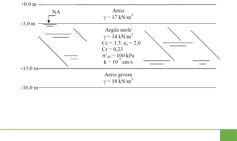 Lista de Exercícios de Mecânica dos Solos Unidade: Teoria do Adensamento Prof. Msc. Pedro Silveira Gonçalves Neto 01) Para uma camada de argila normalmente adensada foram obtidos os seguintes dados de campo: espessura da camada = 3,2m; índice de vazios = 0,8; Coeficiente de Compressão = 0,28; Tensão efetiva no centro da camada = 384kPa. Determinar qual a sobrecarga necessária para gerar um recalque de 35cm. 02) Considere o terreno abaixo onde será construído um aterro extenso com um peso específico nat = 18kN/m³ e 2,5m de altura. Pede-se: a. Calcule o recalque total da camada de argila considerando primeiramente o ponto médio da mesma e, em seguida, subdividindo-a em várias subcamadas. Compare os resultados. b. Calcule o coeficiente de adensamento para a argila. c. Calcule o recalque para um período de 120 dias. d. Quando o recalque for de 26,40cm, qual o valor da pressão neutra no centro da camada? e. Calcule o tempo para que ocorra uma porcentagem de recalque de 50% (considere a drenagem para uma e duas faces e compare esses resultados) f. Se a camada for drenada pela face superior apenas, qual seria o valor da pressão neutra no centro da camada para uma porcentagem de recalque de 60%? g. Calcule o valor da pressão neutra no centro da camada argilosa considerando drenagem apenas pela parte inferior quando o valor da porcentagem de recalque for de 81%. 03) Um aterro (1,5m com nat = 20kN/m³) foi construído sobre uma argila mole saturada, tendo-se em vista que o recalque total seria de 50cm. Um piezômetro colocado no centro da camada de argila indicou, logo após a construção, uma pressão neutra de 80kPa. Sabia-se que a drenagem seria tanto pela face inferior quanto pela face superior da argila mole e que a pressão neutra inicial era de 50kPa. Quinze dias depois da construção do aterro, o piezômetro indicava uma pressão neutra de 70kPa. Qual será a data na qual os recalques atingirão 45cm? 04) O tempo necessário para 50% da consolidação de uma camada de 25mm de argila (drenada pelas duas faces) em laboratório foi de 2 min e 20s. Qual o tempo necessário para que uma camada de 3m de espessura desta mesma argila sofra a mesma porcentagem de recalque sabendo-se que abaixo desta camada há uma camada de rocha no campo? Quantos dias serão necessário para que 30% do recalque ocorra no campo? 05) Uma camada saturada de argila com 1m de espessura drenada por ambas as faces apresenta 90% de sua consolidação primária em 75 dias. Determine o Cv desta argila. 06) Um aterro é lançado sobre uma camada de areia fina, mostrado no perfil, até a cota +2m. Dois anos depois, resolveu-se construir um edifício de 5 pavimentos (12kPa/pavimento) sobre o aterro anteriormente lançado, mas como não havia sido acompanhado o processo de adensamento no perfil, instalou um piezômetro, no centro da camada de argila orgânica, para obtenção de algumas leituras de pressão neutra. O piezômetro acusou um valor de pressão neutra igual a 35kPa. Pergunta-se: a. Qual o recalque total, por adensamento, devido à construção do aterro e do edifício. b. Qual será a altura final das duas camadas de argila no final do processo. Dados Respostas 01) = 1553,90kPa. 02) Considerando os pontos -3m, -5,5m, -8m, -10,5m e -13m. a) Centro da camada: H = 43,69cm; demais posições em ordem crescente: 22,41cm; 28,92cm; 57,08cm; 69,63cm. b) CV = 1,03 x 10-7 m²/s. c) (t) = 10,18cm. d) u(t) = 77,9 kPa. e) Drenagem Simples: 6,06 anos. Drenagem Dupla: 1,51 anos. Observar que a relação entre as condições de drenagem e o tempo para ocorrência do recalque total é 1:4. f) u(t) = 68,9 kPa. g) u(t) = 55,4 kPa. 03) tfinal = 63,92 dias. 04) t = 33,47 dias. 05) CV = 2,83 x 10-3 m²/dia. 06) Camada de Argila Orgânica = 4,63m; Camada de Argila Rija = 1,94m. Teoria do Adensamento 3