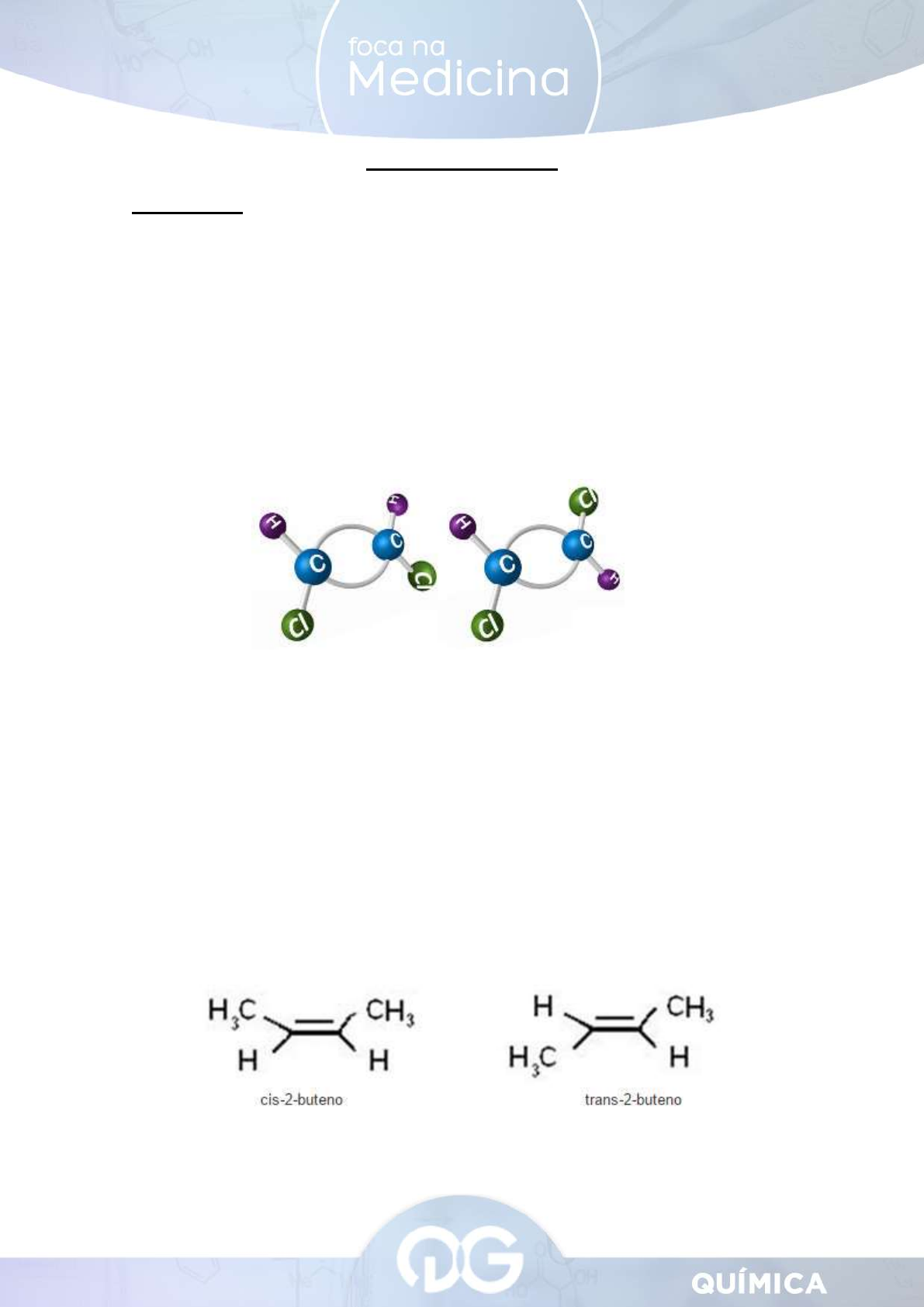 1 ISOMERIA ESPACIAL 1. CONCEITO Na Isomeria espacial a diferença das fórmulas estruturais só é perceptível através da análise espacial da molécula. Há dois tipos de isomeria espacial: geométrica (cis-trans ou Z-E) e óptica. 1.1.Isomeria geométrica Os compostos abaixo são classificados como isômeros geométricos em virtude de suas estruturas espaciais. Só é possível perceber essa isomeria se considerarmos as moléculas num plano imaginário, veja como: Isômero Cis Isômero trans As ramificações – Cl (na cor verde) estão em posições diferentes na molécula: no isômero cis, elas se posicionam do mesmo lado, e no isômero trans, ocupam lados opostos. Repare que os isômeros possuem a mesma fórmula molecular como também a mesma fórmula estrutural plana, tendo como fator de diferenciação apenas a fórmula estrutural espacial. Veja mais um exemplo: 2 1.2.Isomeria óptica Está associada ao comportamento das substâncias submetidas a um feixe de luz polarizada obtida quando a luz natural, não polarizada, atravessa um polarizador. Essa definição “um tanto quanto complicada” traduz a ideia de que algumas substâncias têm a propriedade de desviar o plano de vibração da luz polarizada, elas são, por isso, denominadas de isômeros ópticos. Como o desvio do plano de vibração pode ocorrer em dois sentidos, temos a classificação: Isômero dextrogiro (d): desvio para o lado direito Isômero levogiro (l): desvio para o lado esquerdo Aparelho polarímetro: análise de uma amostra dextrogira. Exemplo de isômeros ópticos: ácidos lácticos Ácido l-láctico Ácido d-láctico 3 Ambos provocam o mesmo desvio angular, porém em sentidos opostos. Ao olharmos estas duas estruturas vemos que são fisicamente iguais, mas fisiologicamente e quimicamente são diferentes. Como se faz a distinção entre elas? Como se tratam de isômeros opticamente ativos usamos a classificação dextrogiro e levogiro. A forma mais fácil de determinar a quantidade de isômeros opticamente ativos e inativos de uma molécula que possui vários carbonos assimétricos diferentes é por meio das expressões matemáticas mostradas a seguir que foram propostas por Van’t Hoff e Le Bel: Em que “n” é a quantidade de carbonos assimétricos diferentes na molécula. Por exemplo, no caso do aspartame, são dois carbonos assimétricos, então teremos: Isômeros opticamente ativos: 2n = 22 = 4; Isômeros opticamente inativos: 2n = 22 = 2. 2 2 4 DESENVOLVENDO COMPETÊNCIAS 1. (Pucsp 2011) América Latina Diabética O diabetes mellitus tipo 2 é um problema de saúde crescente na América Latina. Estima-se que quase 6% da população adulta desta região sofram de diabetes.Em números absolutos, isso equivale a mais de 16 milhões de pessoas, e, a continuar o atual ritmo de crescimento da doença, espera-se que, em 2025, este número ultrapasse a surpreendente marca dos 33 milhões de diabéticos latino-americanos, segundo a World Diabetes Foundation. O aumento do número de casos da doença na América Latina tem diversas explicações. Uma delas é o aumento na expectativa de vida verificado nos países em desenvolvimento, já que a doença tem maior prevalência em uma faixa etária que inclui pessoas mais idosas. Por outro lado, mudanças no estilo de vida tais como decréscimo nas atividades físicas e a predominância de dietas hipercalóricas têm contribuído significativamente para o aumento de casos de obesidade na região. A obesidade é o grande desencadeador desse tipo de diabetes, pois está associada ao desenvolvimento de resistência à insulina por parte do organismo. É bom ressaltar que o outro tipo de diabetes mellitus o do tipo 1, ocorre devido a um distúrbio autoimune que leva à destruição das células produtoras de insulina. Apesar de diferentes quanto à origem, ambos os tipos de diabetes levam ao mesmo conjunto de complicações no organismo, que são resultantes direta ou indiretamente de alterações orgânicas descritas a seguir: 5 Hiperglicemia é a concentração elevada de glicose no sangue (acima de 126 mg/dL em jejum). Nessas condições, o sangue torna-se hipertônico em relação ao citoplasma celular, além de resultar na eliminação de quantidades elevadas de glicose na urina associada a uma eliminação abundante de líquidos e eletrólitos. Alterações metabólicas: são provocadas pela carência de glicose nas células do diabético. Nestas circunstâncias, proteínas e lipídios passam a ser metabolizados intensamente. Subprodutos desse metabolismo, como os corpos cetônicos, podem levar a um quadro grave de acidose no sangue. Danos neurológicos, cegueira e colapso renal são complicações clínicas frequentes nos diabéticos. No entanto, as doenças cardiovasculares são a principal causa de morte. Na América Latina, a situação é ainda mais preocupante, pois muitos diabéticos ainda têm acesso limitado ao sistema de saúde, segundo dados da Organização Mundial de Saúde. Baseando-se nos seus conhecimentos de Biologia e Química, responda: a) No organismo humano, onde se encontram as células produtoras de insulina? Qual a função desempenhada por este hormônio? b) Após uma refeição, normalmente acontece uma elevação na concentração sanguínea de glicose, seguida de uma queda gradual. As curvas representadas no gráfico a seguir registram esse fenômeno em duas pessoas, uma saudável e uma diabética. Qual dessas curvas (A ou B) representa o ocorrido na pessoa diabética? Justifique, levando em consideração a deficiência insulínica apresentada no diabetes tipo 2. 6 c) Em solução aquosa neutra, a glicose é encontrada em equilíbrio entre a forma aberta e a forma cíclica, representada pela equação a seguir: I. Identifique as funções químicas presentes em cada uma das formas apresentadas pela glicose. II. A glicose apresenta isômeros, sendo que vários deles derivam da assimetria de suas moléculas. Determine o número de
