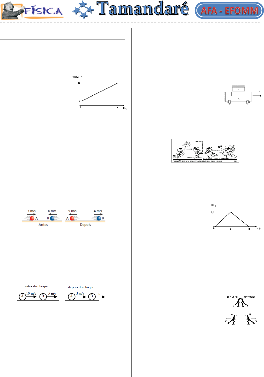 Professor: Deivid Física I Prof° Deivid 0001/09 - 1/3 Impulso – Quantidade de Movimento - Colisões Exercícios 01. (Fatec-2002) Num certo instante, um corpo em movimento tem energia cinética de 100 joules, enquanto o módulo de sua quantidade de movimento é 40 kg.m/s. A massa do corpo, em kg, é: a) 5,0 b) 8,0 c) 10 d) 16 e) 20 02. Um corpo com massa de 2kg, em movimento retilíneo, tem a sua velocidade linear variando no tempo de acordo com o gráfico a seguir. O valor do impulso e do trabalho da força resultante sobre o corpo entre t = 0 e t = 4s valem, respectivamente, a) 8 N.s e 24 J. b) 24 N.s e 8 J. c) 16 N.s e 24 J. d) 24 N.s e 96 J. e) 16 N.s e 96 J. 03. Uma partícula de massa 8,0 kg desloca-se em trajetória retilínea, quando lhe é aplicada, no sentido do movimento, uma força resultante de intensidade 20 N. Sabendo que no instante de aplicação da força a velocidade da partícula valia 5,0 m/s, determine: a) o módulo do impulso comunicado à partícula, durante 10 s de aplicação da força; b) o módulo da velocidade da partícula ao fim do intervalo de tempo referido no item anterior. 4. No esquema seguinte, estão representadas as situações imediatamente anterior e imediatamente posterior à colisão unidimensional ocorrida entre duas partículas A e B: Sendo conhecidos os módulos das velocidades escalares das partículas, calcule a relação mA/mB entre suas massas. 05. (Eear/11) Duas esferas A e B, de mesmas dimensões, e de massas, respectivamente, iguais a 6 kg e 3 kg, apresentam movimento retilíneo sobre um plano horizontal, sem atrito, com velocidades constantes de 10 m/s e 5 m/s, respectivamente. Sabe-se que a esfera B está a frente da esfera A e que estão perfeitamente alinhadas, conforme pode ser visto na figura, e que após o choque a esfera A adquire uma velocidade de 5m/s e a esfera B uma velocidade v. Utilizando os dados do problema, considerando o sistema isolado e adotando o Princípio da Conservação da Quantidade de Movimento, determine a velocidade v, em m/s. a) 10. b) 15. c) 20. d) 25. 06. Pular corda é uma atividade que complementa o condicionamento físico de muitos atletas. Suponha que um boxeador exerça no chão uma força média de 1,0 . 10 4 N, ao se erguer pulando corda. Em cada pulo, ele fica em contato com o chão por 2,0 . 10 -2 s. Na situação dada, o impulso que o chão exerce sobre o boxeador, a cada pulo, é: a) 4,0 Ns b) 1,0.10 Ns c) 2,0.10² Ns d) 4,0 . 10³ Ns e) 5,0 . 10 5 Ns 07.(Ufsm-02) Um corpo de massa 2 kg varia sua velocidade de 10 m/s para 30 m/s, sob a ação de uma força constante. O impulso da força sobre o corpo é, em Ns. a) 20 b) 30 c) 40 d) 60 e) 80 08. O móvel A de massa M move-se com velocidade constante V ao longo de um plano horizontal sem atrito. Quando o corpo B de massa M/3 é solto, este encaixa-se perfeitamente na abertura do móvel A. Qual será a nova velocidade do conjunto após as duas massas terem se encaixado perfeitamente? a) 4 3V b) 3 2V c) 3 V d) 3V 09.Na tirinha abaixo, suponha que o tempo de interação entre o coelho Sansão e a bola tenha sido de 0,01 s e que a força exercida sobre ela tenha sido de 400N. No sistema SI, o módulo do impulso produzido pela força e a variação da quantidade de movimento valem: a) 5,0 e 4,0. b) 4,0 e 5,0. c) 5,0 e 5,0. d) 4,0 e 4,0. e) 4,0 e 8,0. 10. Um trenó, com massa total de 250 kg, desliza no gelo à velocidade de 10m/s. Se o seu condutor atirar para trás 50kg de carga à velocidade de 10m/s, a nova velocidade do trenó será de: a) 20 m/s. b) 10 m/s. c) 5 m/s. d) 2 m/s. e) 15 m/s. 11. No instante t = 0, um corpo de massa 3,0 kg está em repouso sobre numa superfície horizontal de atrito desprezível. É, então, aplicada ao corpo uma força de direção horizontal e intensidade F variável com o tempo t conforme representa o gráfico. A velocidade, em m/s, adquirida pelo corpo vale, no instante t = 12 s, a) 8 b) 12 c) 16 d) 20 e) 24 12. (Unirio) Um pescador e seu barco têm juntos 180 kg de massa e estão em repouso num lago. O pescador salta do barco com uma velocidade de 5 m/s e o barco se afasta com velocidade contrária de 4m/s. Qual a massa do pescador e do barco? 13. Dois patinadores, um de massa 100kg e outro de massa 80kg, estão de mãos dadas em repouso sobre uma pista de gelo, onde o atrito é desprezível. Eles empurram-se mutuamente e deslizam na mesma direção, porém em sentidos opostos. O patinador de 100kg adquire uma velocidade de 4m/s. A velocidade relativa de um dos patinadores em relação ao outro é, em módulo, igual a: a) 5 m/s b) 4 m/s c) 1 m/s d) 9 m/s e) 20 m/s Física I 3122 - 2/3 Prof° Deivid 14. (Olimpíada Paulista de Física) Duas partículas de massa distintas M e m têm a mesma energia cinética e quantidade de movimento Q e q, respectivamente. Nestas condições, a razão entre suas quantidade de movimento (Q/q) é: a) (M/m) 1/2 . b) (M/m) 2 . c) (M+m)/M. d) (M+m)/m. e) . 15. (UFES) Uma bomba tem velocidade V no instante em que explode e se divide em dois fragmentos, um de massa M e outro de massa 2M. A velocidade do fragmento menor logo após a explosão a explosão é igual a 5v. Desprezando-se a ação da gravidade e a resistência do ar, qual a velocidade do fragmento maior ? a) V 2 5 b) V c) V 5 2 d) V 16. (EER 2/2001 "A") Impulso de uma força constante é o produto a) da força pela velocidade do corpo. b) do módulo da força pela velocidade da força. c) da força pelo intervalo de tempo em que atua. d) do módulo da força, pelo intervalo de tempo em que atua. 17. Uma bolinha de tênis de 50 gramas de massa é atingida pela raquete de um tenista e, após a colisão, adquire uma velocidade de 180 km/h. Sabendo-se que esta colisão é elástica e dura um milésimo de segundo, a força média impulsiva exercida pela raquete, em newtons, vale a) 2500 b) 5000 c) 7000 d) 9000 18. Uma bola de 0,40 kg, movimentando-se horizontalmente com velocidade 14 m/s, é rebatida com uma força média de 10