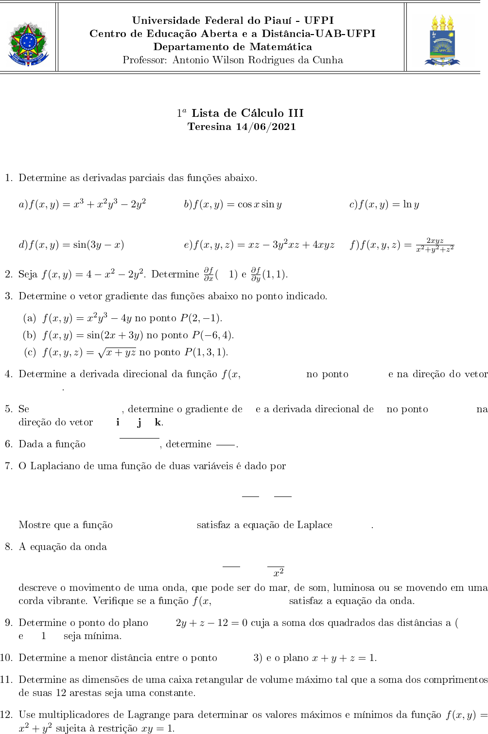 5. Se f(x, y, z) = x sin yz, determine o gradiente de f e a derivada direcional de f no ponto P (1, 3, 0) na
