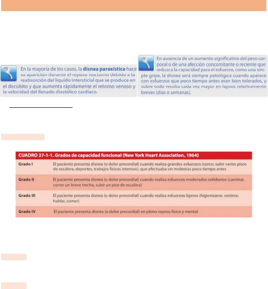 Motivos de consulta Cardio Disnea La sensación de falta de aire originada por una afección cardiaca puede manifestarse solo cuando aumentan las demandas metabólicas y el trabajo del corazón por el esfuerzo muscular o la tensión emocional (disnea de esfuerzo), o la Disnea de reposo (esfuerzo físico y mental), que puede ser una disnea continua (permanente) o Disnea paroxística (aparece brusca y episódica, de grados intensos, pueden preceder o acompañar el edema agudo de pulmón cardiogénico) La disnea paroxística diurna derivada del edema agudo puede ser ocasionada por una sobrecarga abrupta a la eyección (crisis hipertensiva), una falla ventricular (IAM extenso) o una taquiarritmia de elevada frecuencia (fibrilación auricular) con reserva miocárdica disminuida o un llenado diastólico ventricular izquierdo perturbado (estenosis mitral) Disnea cardíaca: se mide por la capacidad funcional (en disnea y dolor precordial difundida), para diferenciar las otras disneas de esa, se recuerde que la cardiaca patológica nunca es estable Cuando se confirma la disnea se debe diferenciar entre la de origen cardiaca y la de índole pulmonar. La cardiaca de grado III o IV, se acentúa en decúbito dorsal y de cabeza baja. Se preguntar al paciente si necesitó de almohadillas durante el reposo nocturno o sentarse en la borda de la cama para respirar mejor Ortopnea: respirar sentado En la disnea de origen respiratorio en paciente debe permanecer en la horizontal aún que sea el grado IV, excepto en crisis intensas de broncoespasmo. Platipnea: En algunos enfisemas graves, neumonectomías, tromboembolismo pulmonar recurrente (síndrome hepatopulmonar, con cambios circulatorios pulmonares secundarios a diversos tipos de hepatopatía crónica grave) la disnea se agrava cuando está sentada y se atenúa en decúbito. Con una vasodilatación marcada de arteriolas pulmonares con apertura de cortocircuitos venoarteriales que predominan en las bases pulmonares y aumentan al descender los diafragmas en posición erecta Esto se produce también por el descenso de la pO2 arterial en más de 10 mmHg cuando el paciente se yergue (ortodesxia) Trepopnea: descanso obligatorio en uno de los decúbitos laterales, puede tener origen cardiaco (hidrotórax por insuficiencia cardiaca congestiva grave) o pulmonar (atelectasia, pleuresías), sin valor diferencial La disnea cardiaca progresa o aumenta dependiendo de la cardiopatía desencadenante. En estenosis mitral son síntoma temprano que progresa con marcada lentitud y puede permanecer sin cambios por años. En la insuficiencia mitral se desencadena en forma más tardía, pero con evolución rápida. En valvulopatías aorticas y en cardiopatía hipertensiva, la compensación es más prolongada, pero cuando aparece la disnea esa progresa rápidamente y alcanza grados extremos en poco tiempo si no se trata En cardiopatía isquémica, con dilatación ventricular, en la insuficiencia cardiaca congestiva y miocardiopatías dilatadas la disnea es creciente y de mal pronostico Disnea paroxística: puede aparecer en cardiopatía como primera manifestación de insuficiencia cardiaca izquierda o desarrollarse en un paciente con síntomas y signos previos (disnea de esfuerzo, ritmo cardiaco-galope) hasta insuficiencia cardiaca global y edemas periféricos Tromboembolismo pulmonar: la disnea aparece en esfuerzos en episodios menores, en los casos que compromiso mayor del árbol bronquial la disnea es permanente como consecuencia de la hipoxemia creada por un trastorno en el equilibrio ventilación-perfusión. En casos masivos la disnea es paroxístico y se agrava la hipoxemia con la apertura de la circulación venosa pulmonar y brónquica (cortocircuito de derecha a izquierda) Falla ventricular izquierda aguda concomitante, secundaria a: · Cardiopatía subclínica preexistente (coronaria, hipertensiva) · Hipoxemia · Bloqueo circulatorio a nivel pulmonar con disminución del flujo coronario Disnea suspirosa: de origen psíquico o funcional, desproporcional al esfuerzo y muy variable en el tiempo, suele existir una respiración ruidosa o aparatosa, con suspiros hondo y repetidos, casi siempre entrecortados (por el comprometimiento emocional). Aparece en dos casos: · Neurosis cardiaca: desencadenada por fobias o miedos de un padecimiento cardiaco o muerte repentina; aparece en hipocondriacos · Ataque o crisis de pánico: es un trastorno de ansiedad, el corazón de soldado o irritable, síndrome da Costa y astenia neurocirculatoria, con hiperventilación por taquipnea y disnea suspirosa por miedo Disnea o respiración periódica: alteración del ritmo resp en el que se alternan periodos de apnea con hiperpnea, de transición gradual y progresiva. Es la respiración de Cheyne-Stokes. Durante la apnea el paciente cierra los ojos y duerme >> respira ruidosamente, despierta y aparece inquieto y ansioso, hasta la nueva apnea. Común en distintos grados de insuficiencia cardiaca, en disnea en reposos (grado IV) o con el mínimo esfuerzo (grado III) · Típica y persistente en cuadros terminales, como caquexia cardiaca o hiponatremia por dilución y de mal pronostico · Formas más atenuadas cuando el paciente se acuesta para dormir, es una causa frecuente e insonia, es la “disnea de iniciación del sueño” · Se atribuye a hipofunción del centro, con escasa provisión de O2 por isquemia o hipoxemia Dolor Es más común es el dolor de origen isquémico Dolor torácico Dolor por isquemia miocárdica (angina de pecho o angor pectoris) · Aparece con el esfuerzo y se alivia en reposo, vinculada a muerte súbita · Angor pectoris (angina de pecho) de carácter constrictivo u opresivo del dolor torácico · Examen físico poco informativo Intensidad: puede ser leve, moderado, intenso o muy intenso, acompañado o no de angustia (en anginas inestables progresivas, en infarto de miocardio) Localización: restoesternal, as veces con máxima intensidad se percibe en espalda, en ambas 