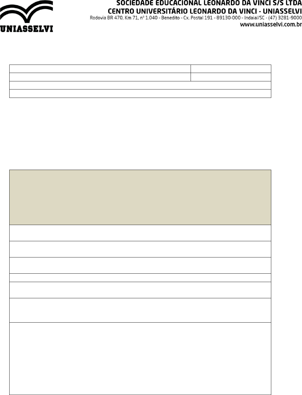 ROTEIRO DE OBSERVAÇÃO VIRTUAL Curso: PEDAGOGIA Turma: 1860 Disciplina: Praticas Interdisciplinar Semestre: 6 Tutor Externo: Cristiane Acadêmico: Flavia Thiellen Cit Mulbauer ORIENTAÇÕES Após construir a temática do seu estágio (Etapa I), utilizando a BNCC, Temas Transversais e Áreas de Concentração do seu curso e de acordo com as diretrizes de estágio, chegou o momento de você construir o Roteiro de Observação Virtual. Faça pesquisa em diferentes lugares para encontrar o maior número de informações possíveis e preencha no quadro abaixo: INFORMAÇÕES DA INSTITUIÇÃO CONCEDENTE Utilize informações de site ou blog da escola, Secretaria Municipal ou Estadual de Educação, Censo Escolar (MEC), perfil da instituição em redes sociais (facebook, Instagran, etc). Esta consulta para coletar as informações pode ocorrer também por reuniões agendadas (Teams, Zoom, Facebook, WhatsApp) ou via e-mail, telefone ou WhatsApp com o gestor da instituição concedente. Nome da Instituição Concedente: Escola Municipal Caic Candido Portinari Localização: Antonio Geroslau Ferreira, 496 Quantidade de estudantes: 1794 Área de Atuação: Ensino Fundamental, EJA Turno de atendimento: Manhã, Tarde e Noite Quadro de funcionários: 231 Experiência e Formação: Diretora – Júcely T. Woinarovicl Vice- Diretores – Ronaldo Galindo Sobral Willian Terres Stempniak Coordenador Administrativo – Monica de Brito Almeida da Silva Coordenadora das unidades de educação integral – Pedagogas: Erika Roberta Fernandes Guilherme Daniele Cristina Rosa Gislaine Aparecida da Silva Ferreira Ires Rosa Fiorense Libera Beatriz Wickbold Peil Nilzete Terezinha Machado Mosele Mirian do Rocio Speltz Hermany Monica de Araujo IDEB da Instituição: 6,2 IDEB da cidade: 6,2 Estrutura da escola: A escola possui em sua estrutura: biblioteca, laboratório de ciências, laboratório de informática, acesso à internet, pátio descoberto, pátio coberto, quadra de esportes coberta e descoberta, parque infantil, área verde, banheiros feminino/masculino e banheiros adaptados para deficientes físicos, sala de professores, sala de secretaria, sala de diretoria, refeitório. Proposta Pedagógica: Os autores que utilizei em minha pesquisa Rosana Glat e Paulo Freire, trazem em sua metodologia o ensino através do lúdico e desafios a serem superados, e aplico suas concepções em minhas aulas para que a criança consiga aprender e desenvolver seus conhecimento adquiridos, através da dança, jogos, historias e arte. JUSTIFICATIVA Destaque os objetivos pedagógicos e quais os benefícios para comunidade atendida (a partir da sua área de concentração e temática escolhida) e posteriormente no desenvolvimento do projeto de extensão, que se configura na entrega de um produto virtual. Conhecer as partes do corpo humano e seus benefícios; seus 5 sentidos tato, olfato, paladar, audição e visão; trabalhar a memória e a coordenação motora. MATERIAIS SOBRE A TEMÁTICA ESCOLHIDA Utilize informações de sites/blogs, Portal do Professor (MEC), YouTube, Plataforma de Periódicos da Capes, Domínio Público, Curta na Escola (filmes) entre outros. Temática: Aprendendo a Somar Área de Concentração: Matemática Palavras-chave (Separado por ponto): Subtração. Matematica. Aprender Nome do Programa de Extensão: Inclusão Educacional Nome do Projeto de Extensão: Praticas Pedagógicas nos Anos Iniciais e Educação Inclusiva Produto Virtual: Trilha Pedagógica MATERIAIS ENCONTRADOS PARA A CONSTRUÇÃO DO PROJETO DE EXTENSÃO Insira os links dos achados na busca virtual (referência) Livros – Um amor de confusão – Dulce Rangel E-books - Imagens - Vídeo - https://www.youtube.com/channel/UCIg-LjiJmOTKaJAw7ltFEnQ/videos Curta-metragem - Artigos - Reportagens - Mapas - Folders - Cartilhas - Podcasts - Lives - Sites - Software Educativo - Outros -